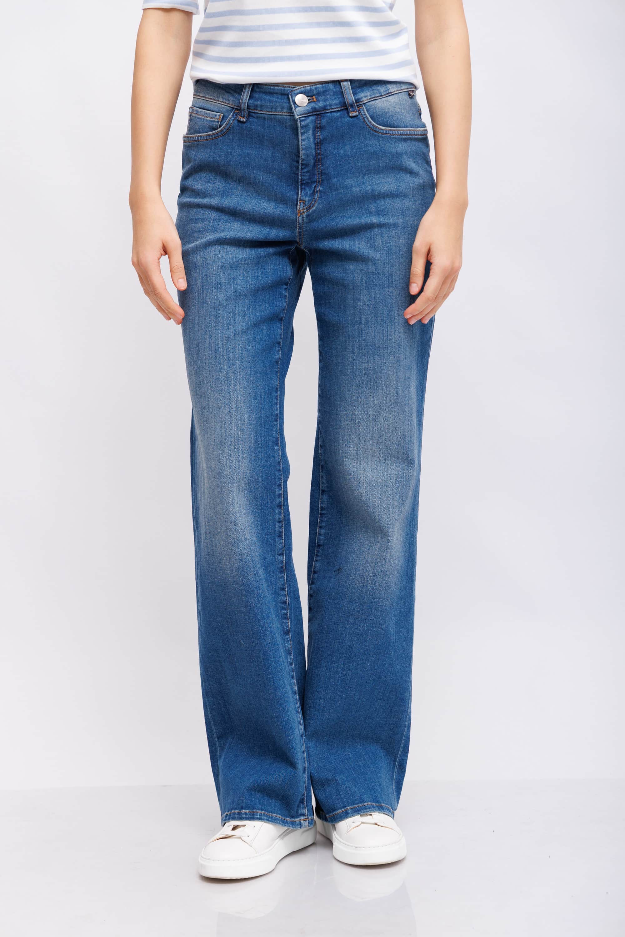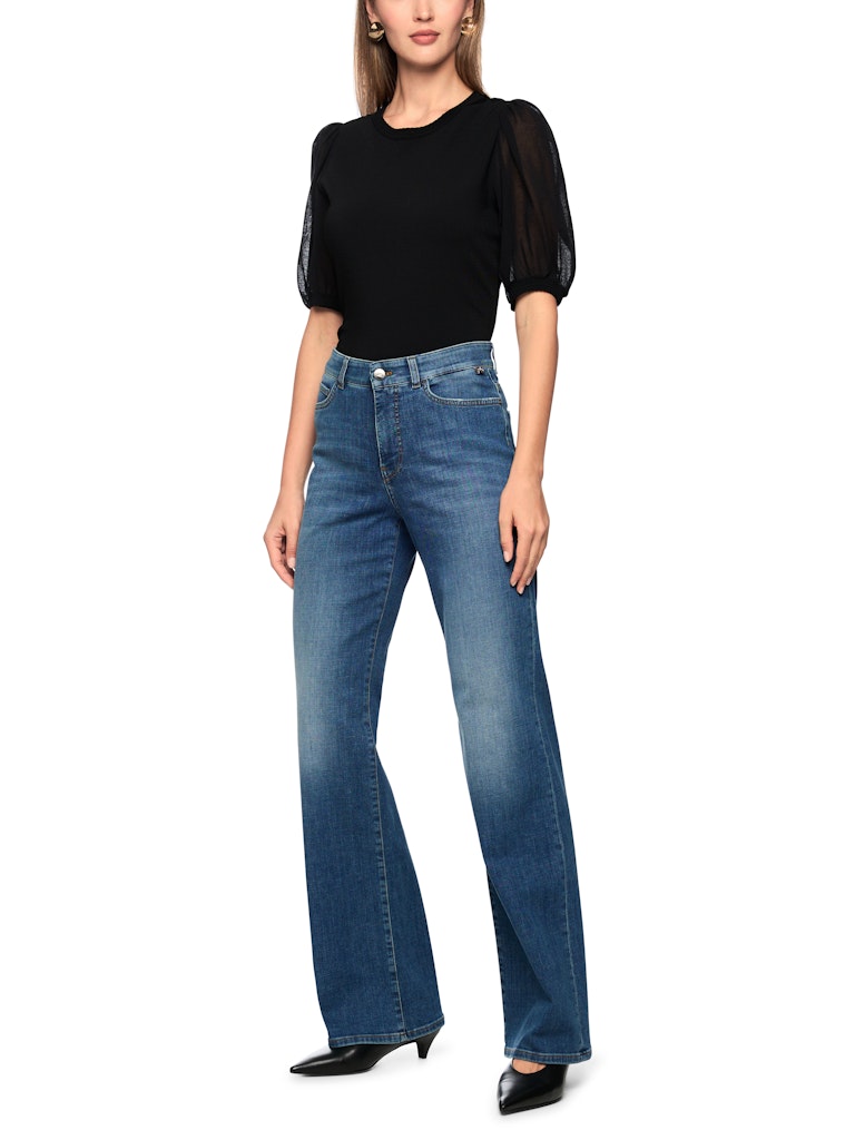 Джинсы FAID имеют женственный крой с высокой талией и расклешенными штанинами. Удлиненные штанины создают элегантный силуэт. Классические джинсы с пятью карманами обеспечивают удобную посадку и высокий комфорт при ношении благодаря эластичному материалу. Застегиваются на пуговицу и молнию.