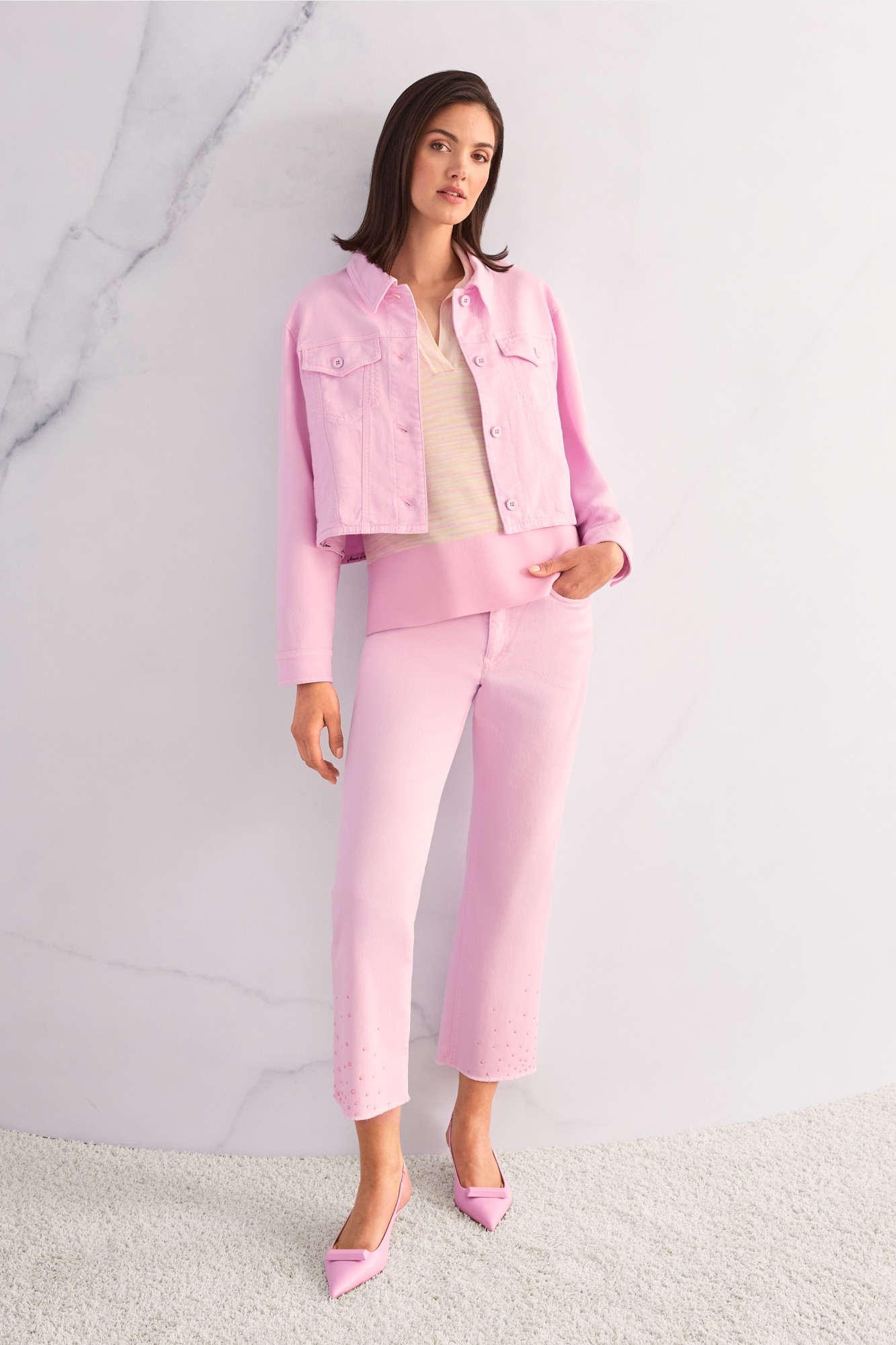 со стандартной посадкой на талии впечатляют классическим стилем с пятью карманами и комфортным эластичным хлопком. Эмалированная пуговица и молния дополняют дизайн. Небольшие декоративные заклепки и тонкая мини-бахрома по низу добавляют модные акценты. Эти джинсы обеспечивают идеальную посадку, высокий комфорт при ношении и современный вид.