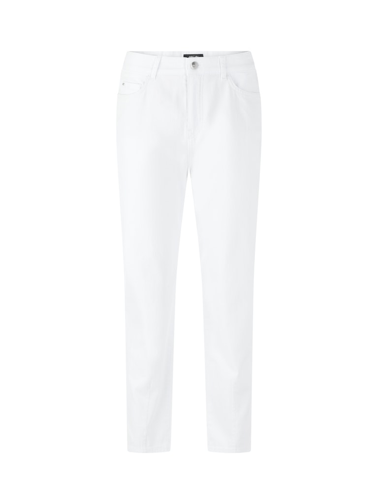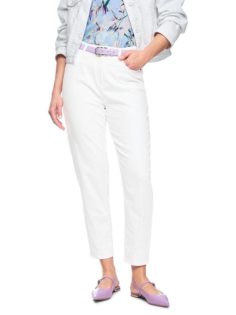 Джинсы RIVNE - укороченные, имеют слегка облегающие брючины. Эти классические джинсы с пятью карманами оснащены петлями для ремня, застежкой на пуговицу и молнию. Особое внимание привлекают вышивка на левом заднем кармане и прошитый низ, формирующий форму брючины. Джинсы изготовлены из регенерированной хлопковой смеси для комфорта и свободного кроя. Они выпускаются под брендом «Rethink Together», ориентированным на экологичность.