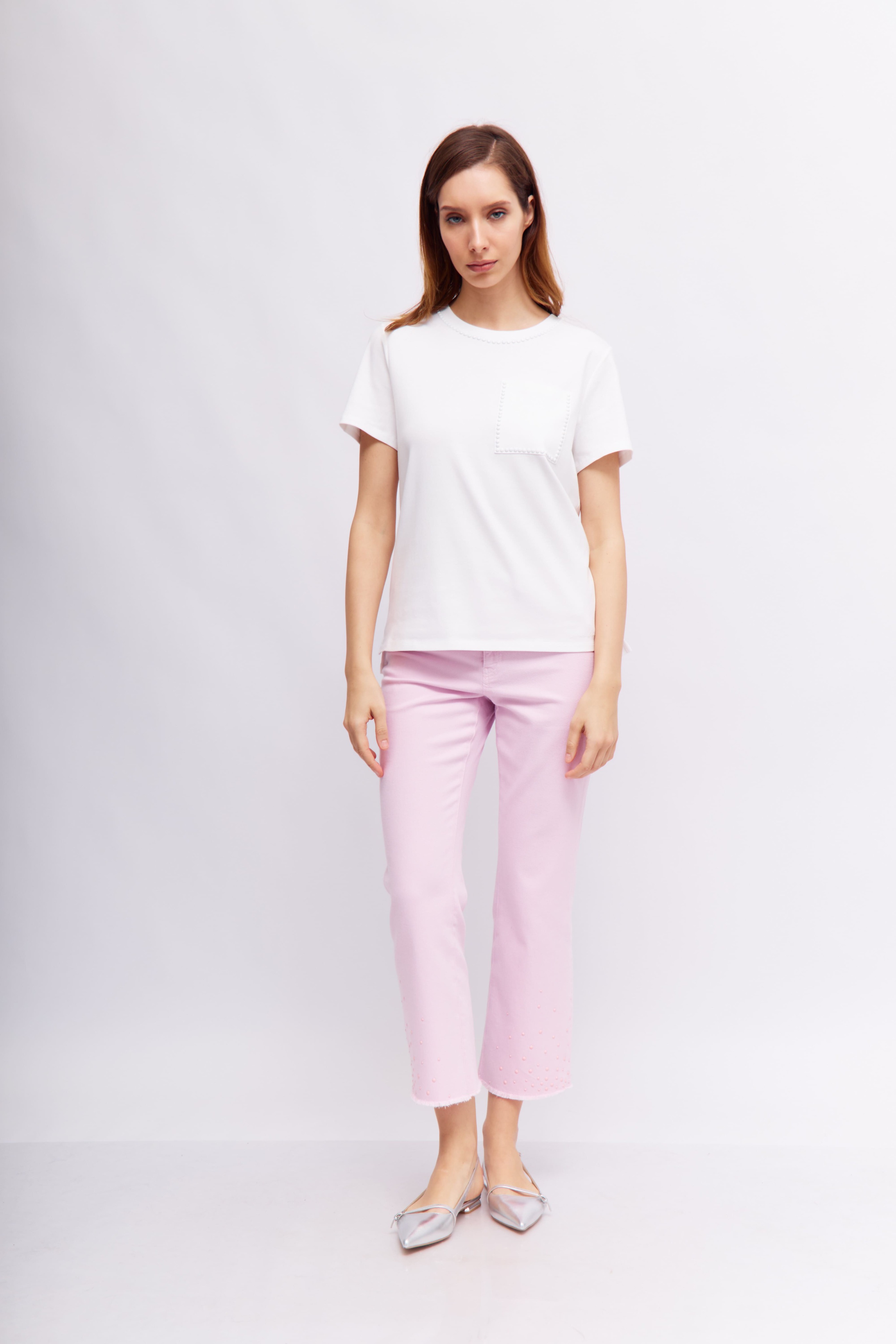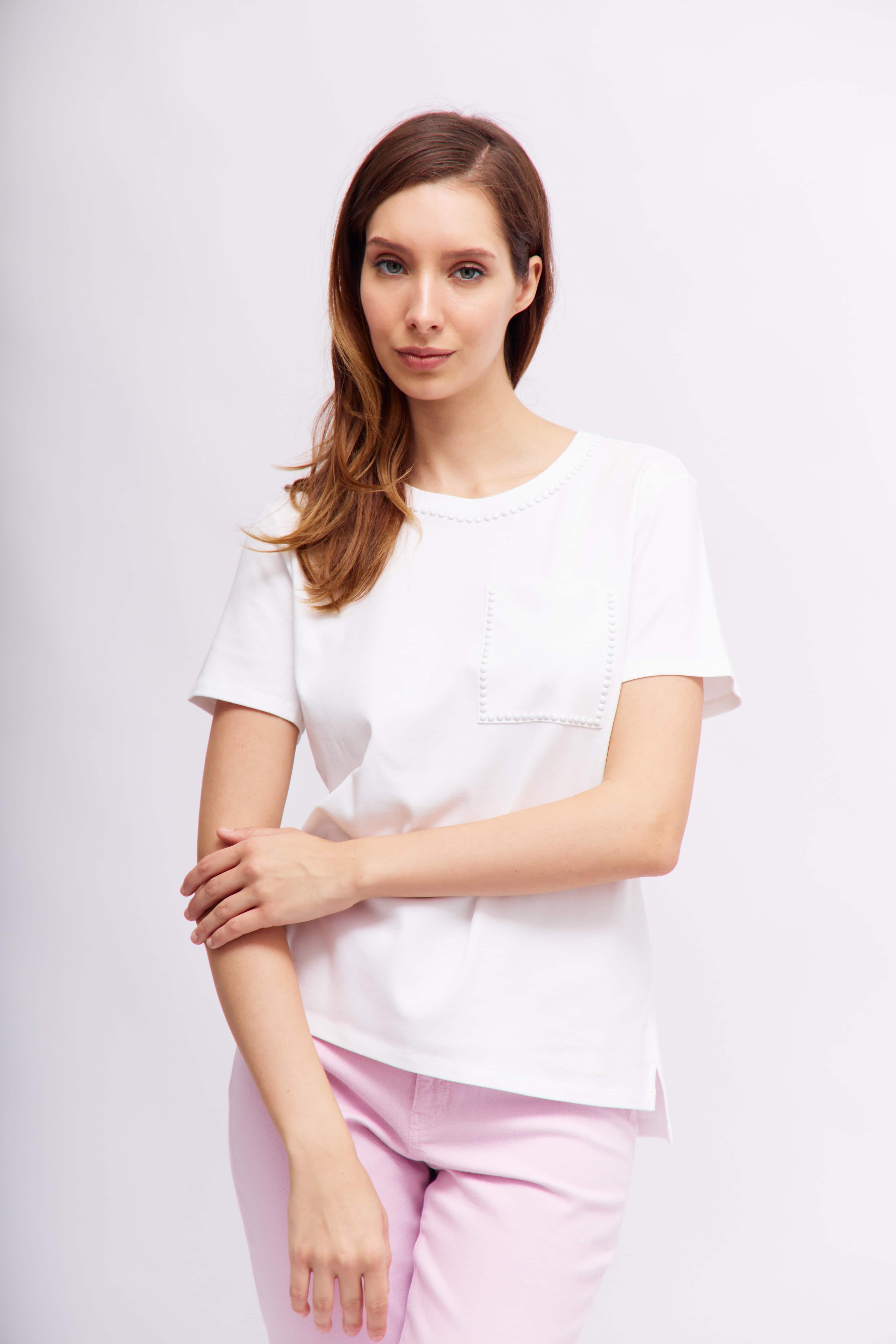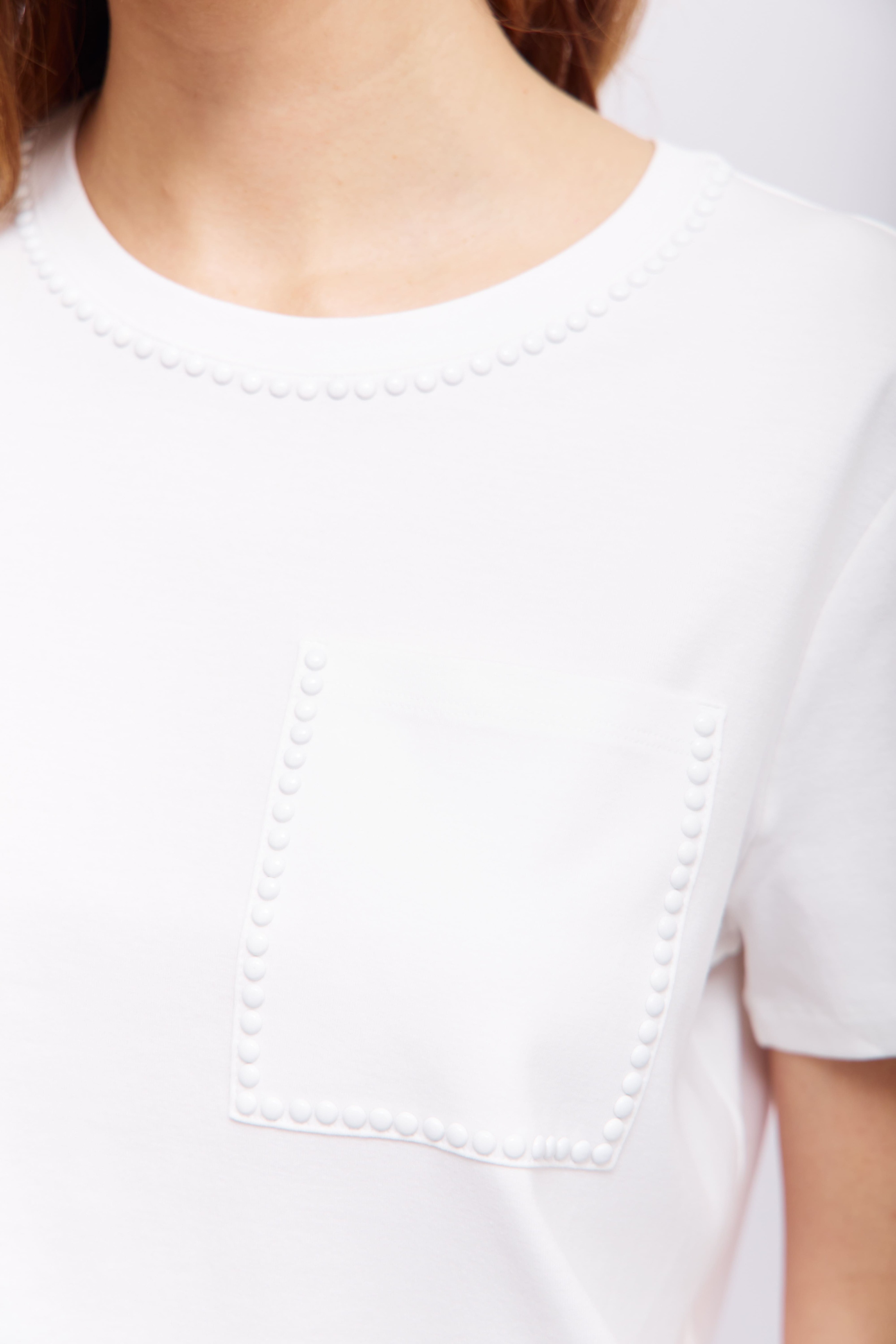 Футболка свободного кроя из эластичного хлопка с круглым вырезом и короткими рукавами. Накладной карман добавляет непринужденности, а термоклеевые заклепки на кармане и вырезе горловины — эффектные акценты.