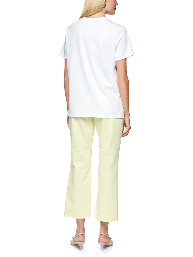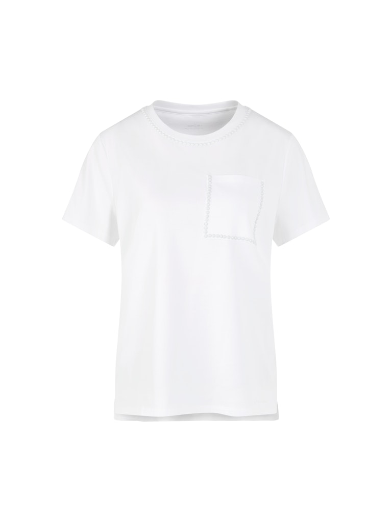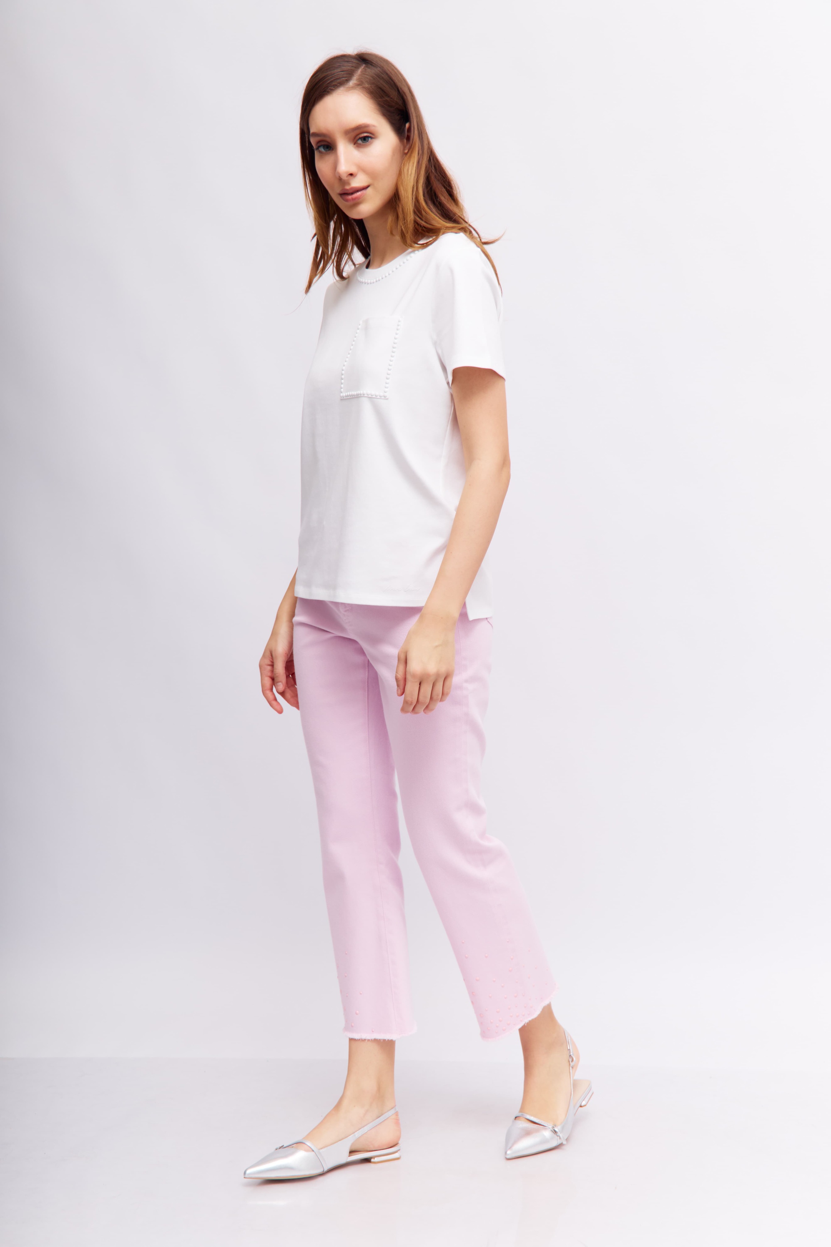 Футболка свободного кроя из эластичного хлопка с круглым вырезом и короткими рукавами. Накладной карман добавляет непринужденности, а термоклеевые заклепки на кармане и вырезе горловины — эффектные акценты.