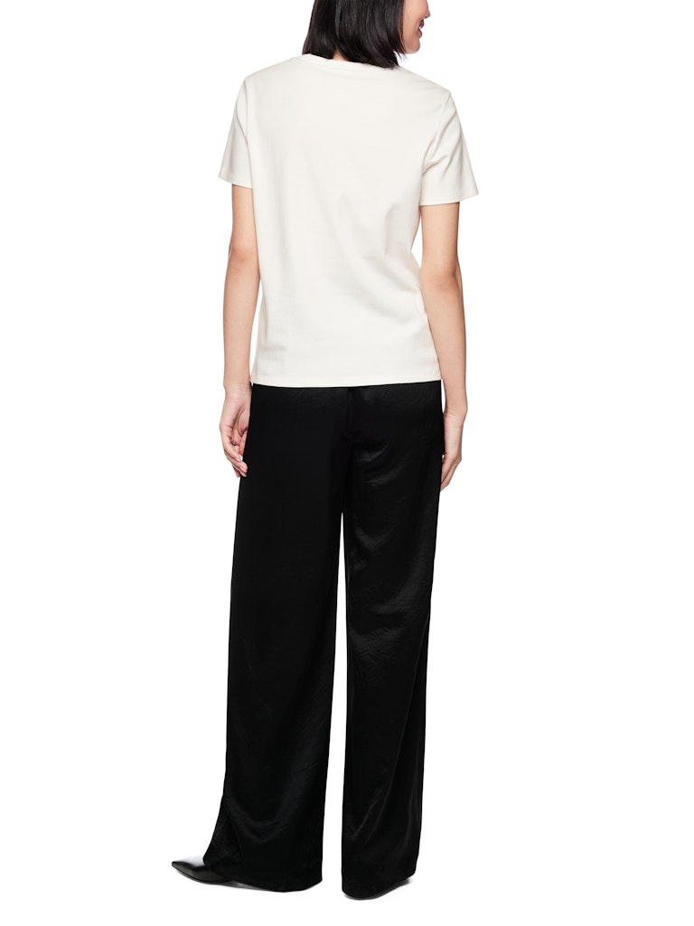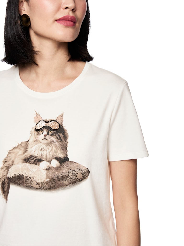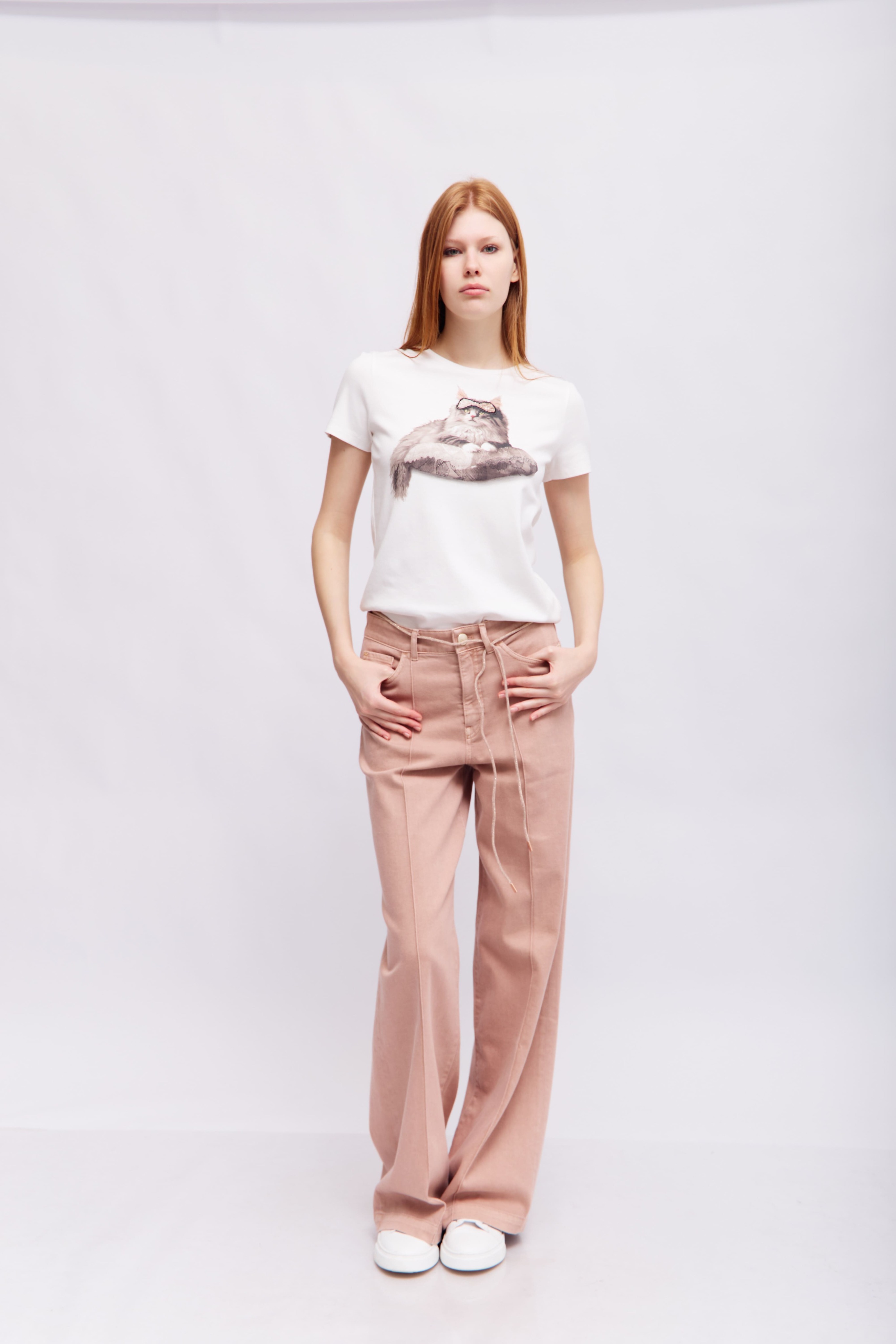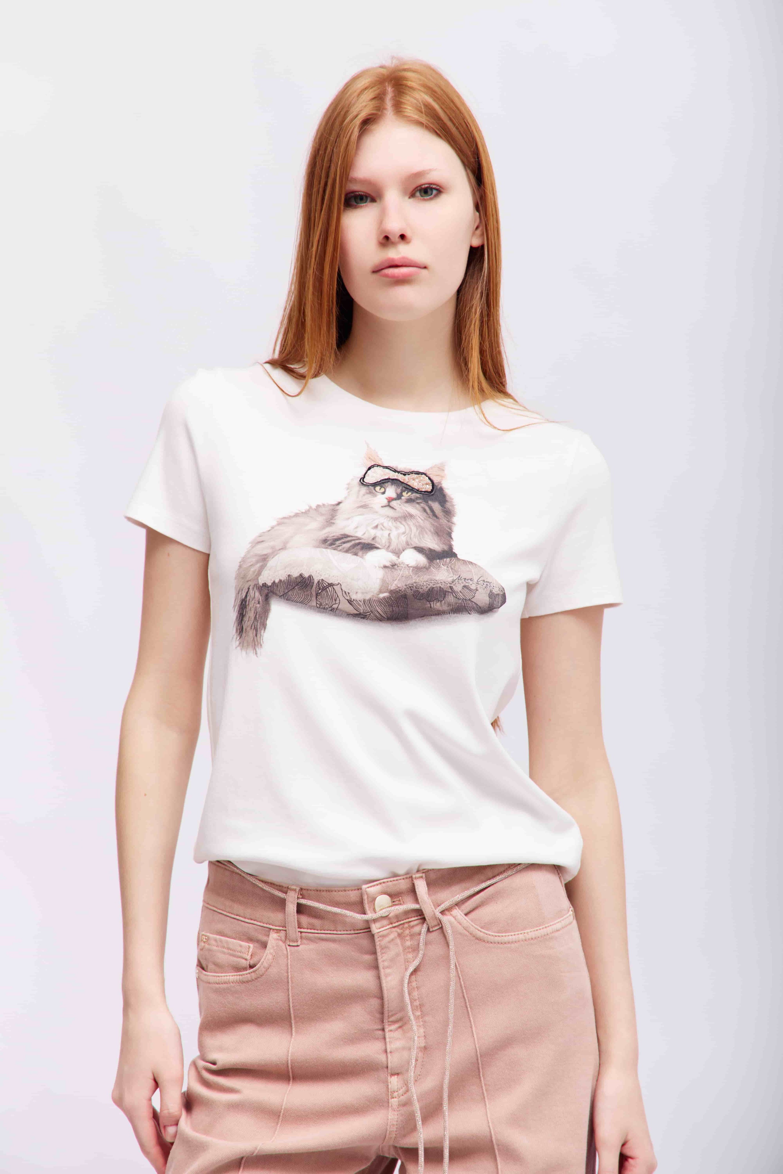 имеет круглый вырез и слегка приталенный крой. Мягкий хлопковый материал обеспечивает комфортную посадку. Принт с изображением кошки на передней части украшен пайетками и рельефными деталями, что придает футболке игривый, особенный вид. Идеально подходит для женского отдыха и повседневных образов.