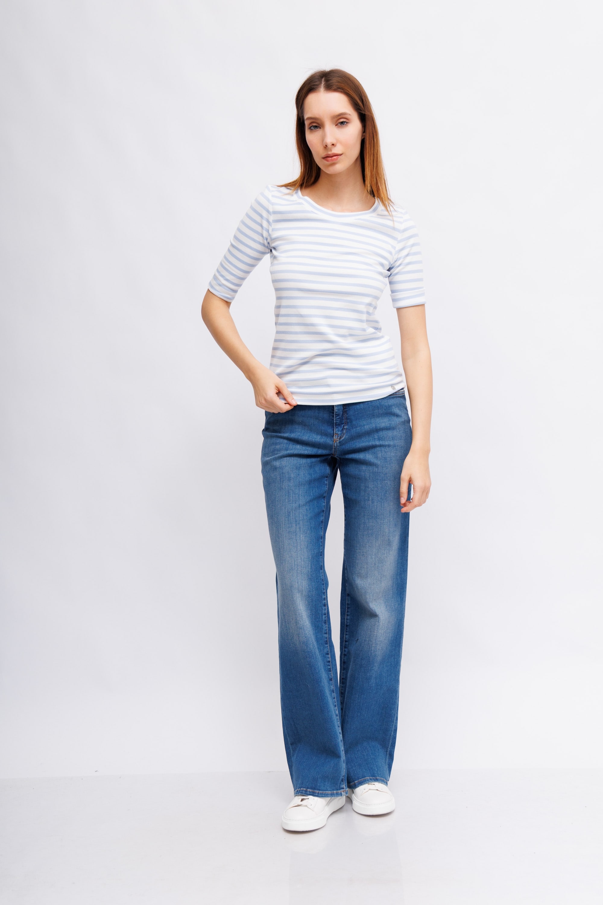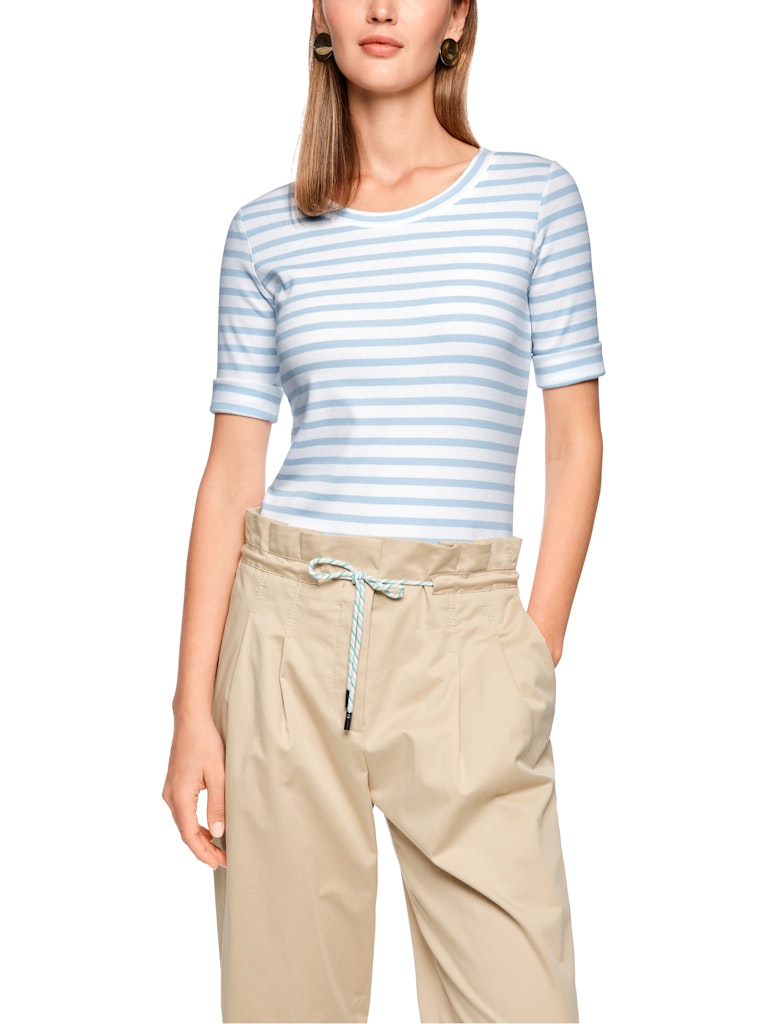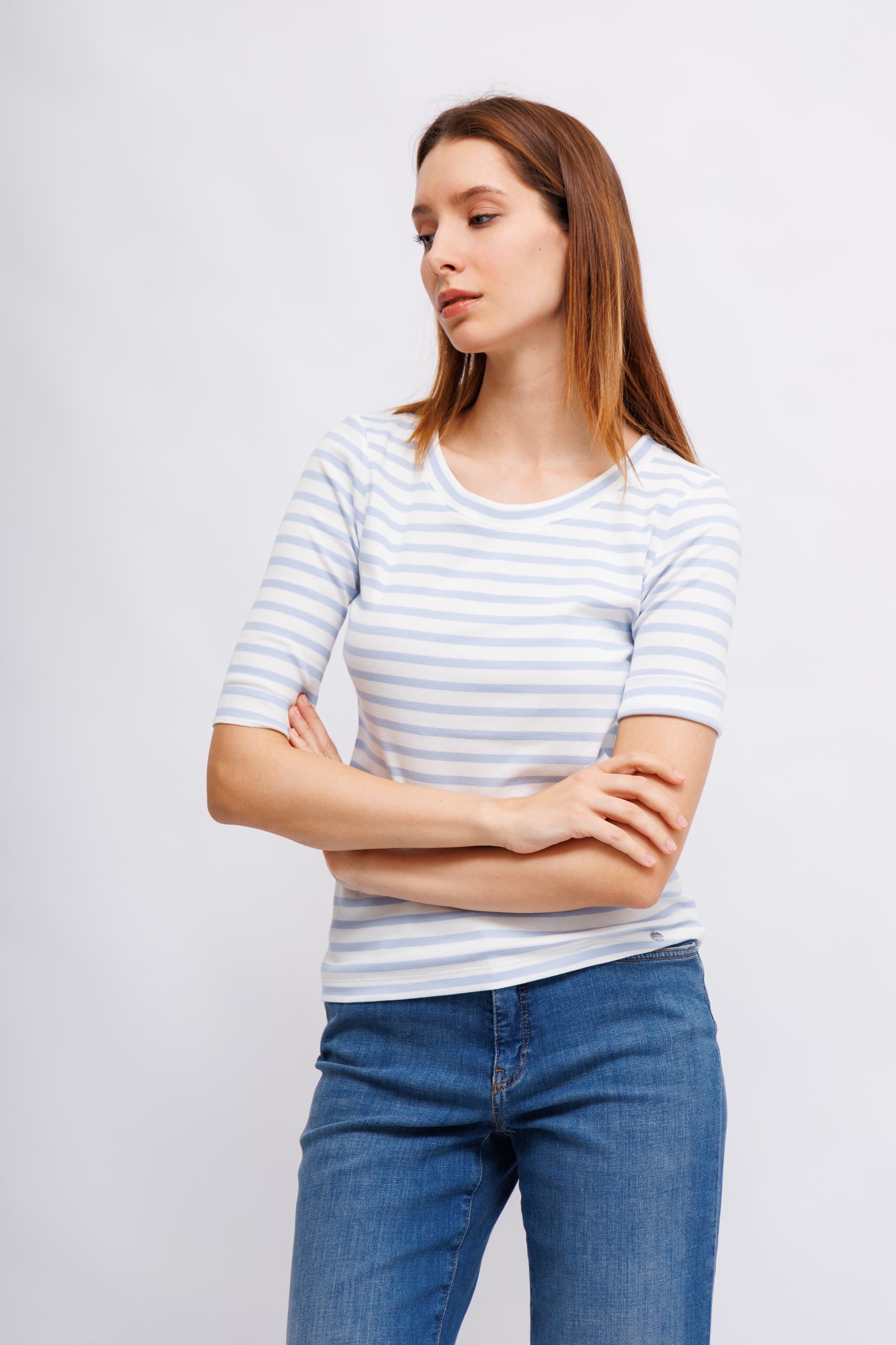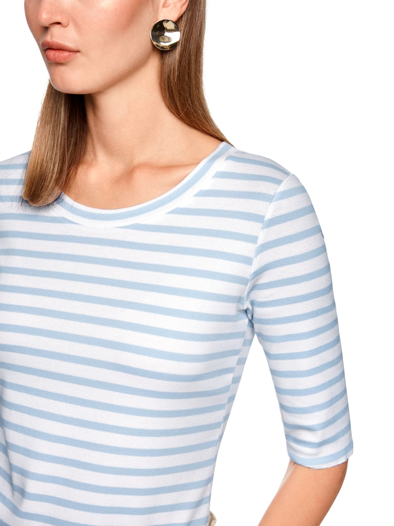 Модель имеет круглый вырез и рукава 3/4. Полосатый узор по всей поверхности. Отличная базовая вещь для спортивных образов.