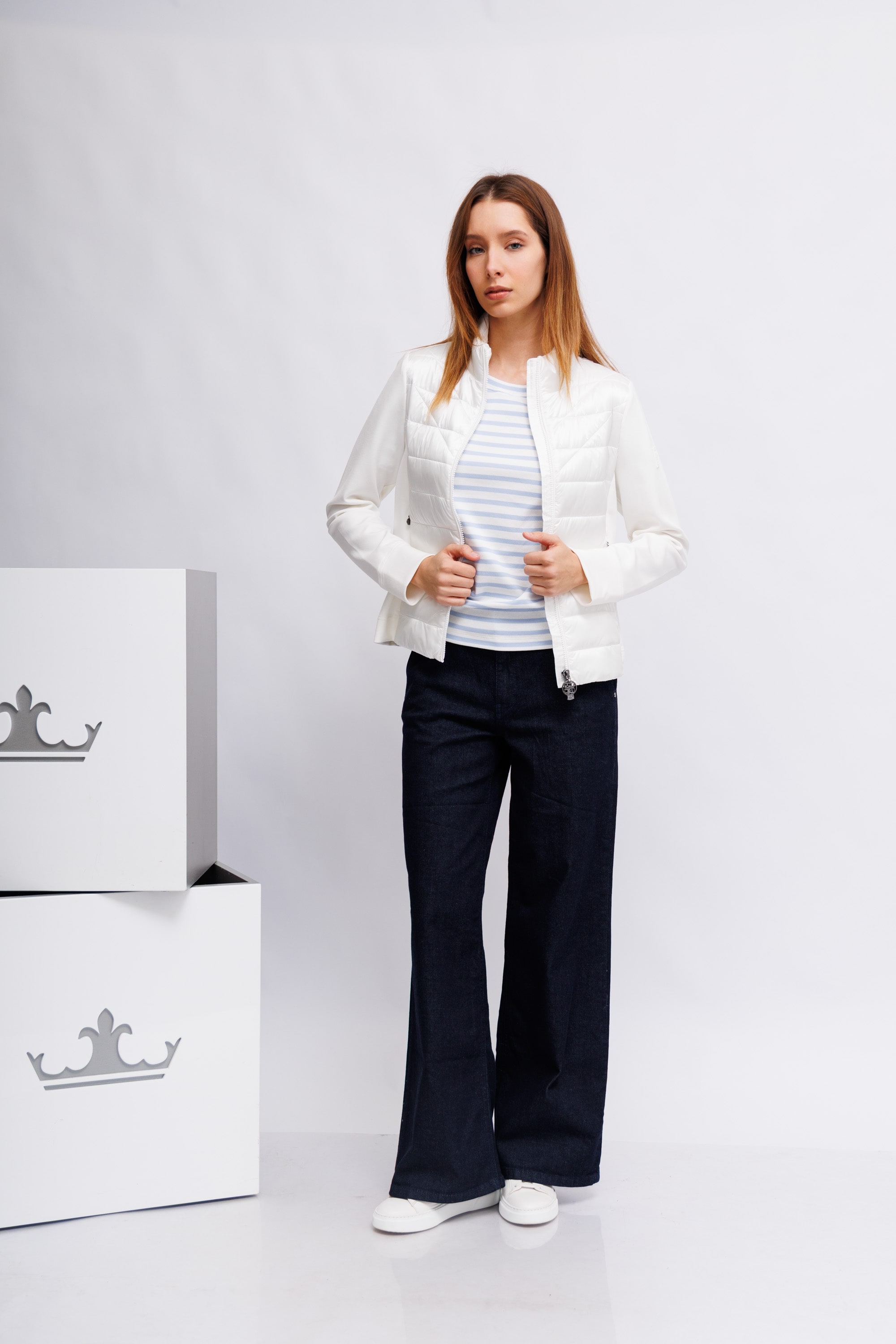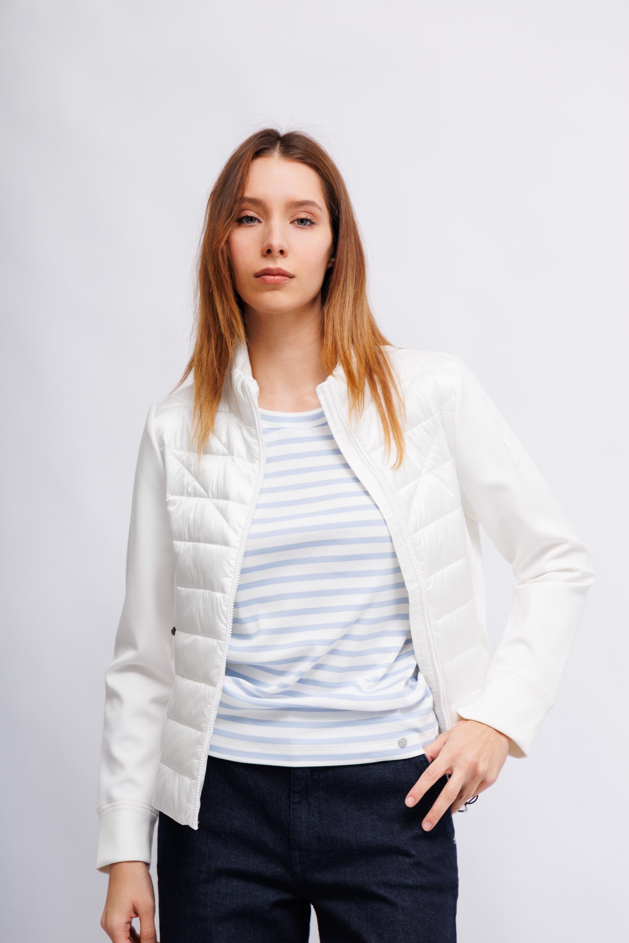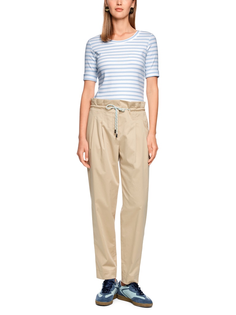 Модель имеет круглый вырез и рукава 3/4. Полосатый узор по всей поверхности. Отличная базовая вещь для спортивных образов.