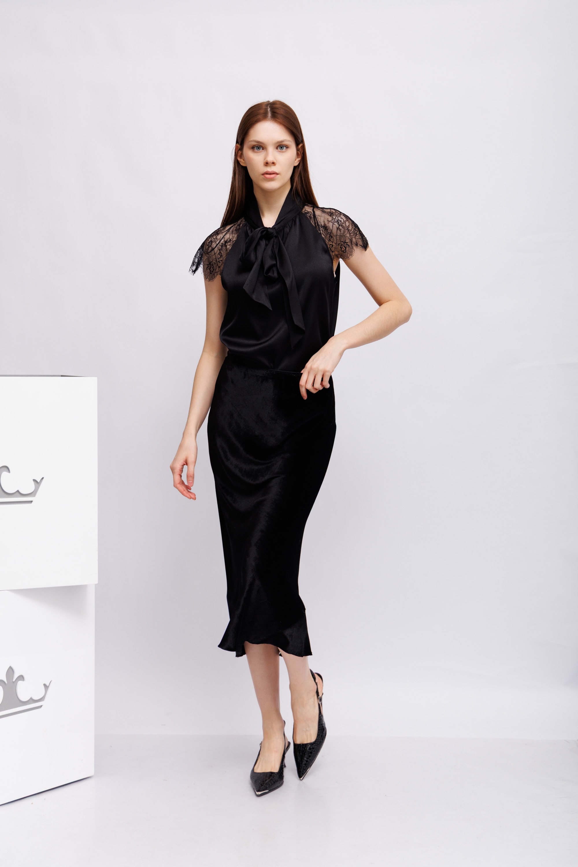Классический верх сочетается с элегантностью блузки с бантом. Прямой крой, а плечи подчеркнуты элегантной кружевной вставкой. Воздушный шёлк с эластаном делает эту блузку комфортной в носке. Настоящая классика, которая дополнит любой элегантный образ.
