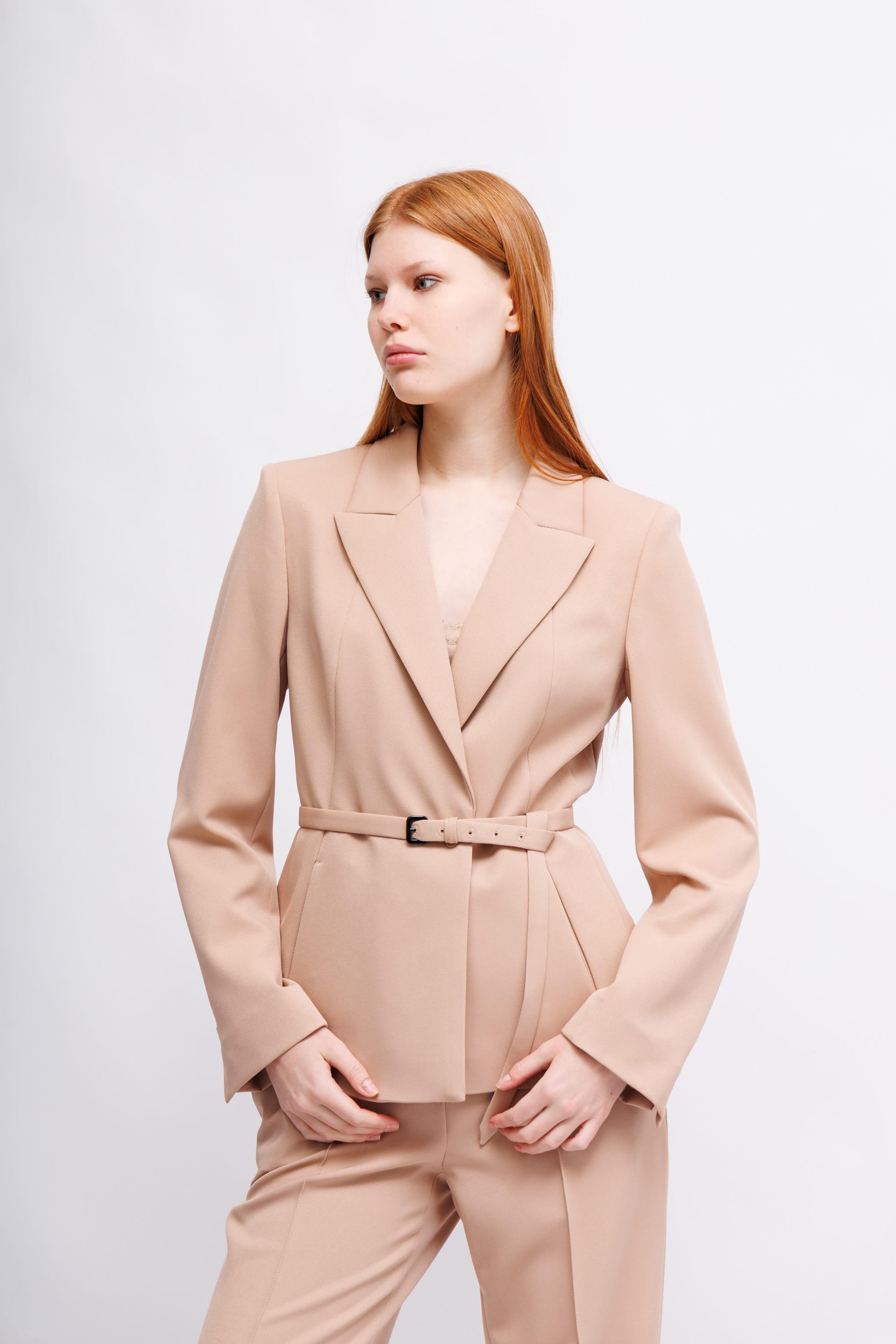 Этот стильный блейзер отличается эффектными плечами и привлекательным воротником с лацканами. Боковые карманы незаметно спрятаны в передних вытачках. Блейзер застегивается на пуговицу на талии, которая скрыта под длинным поясом, дополняющим образ. Рукава заканчиваются небольшим разрезом, декоративно отделанным пуговицей, что придает изделию элегантность и идеальную посадку.