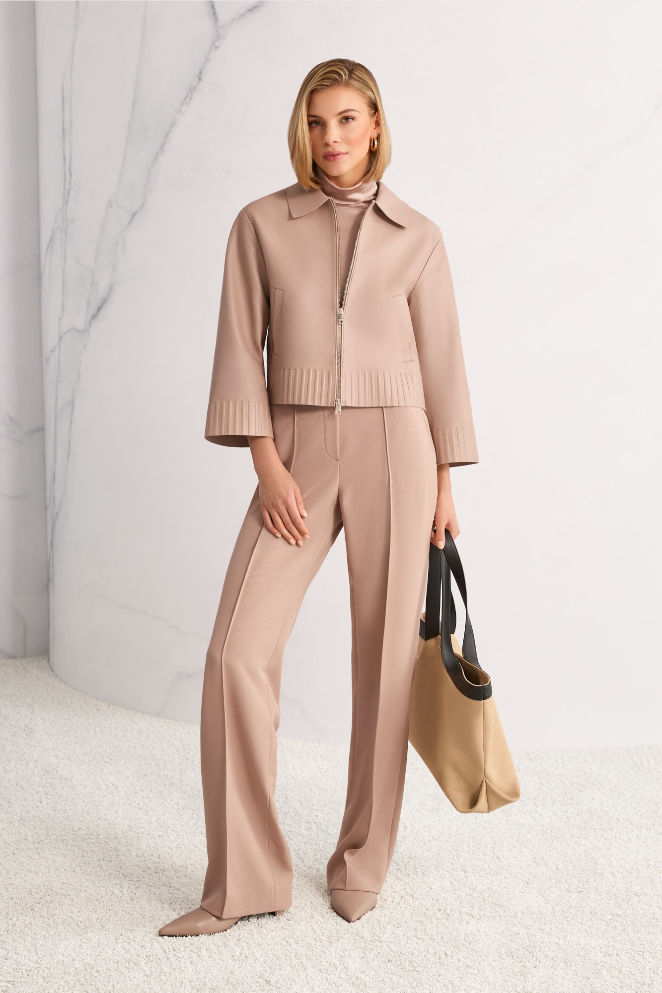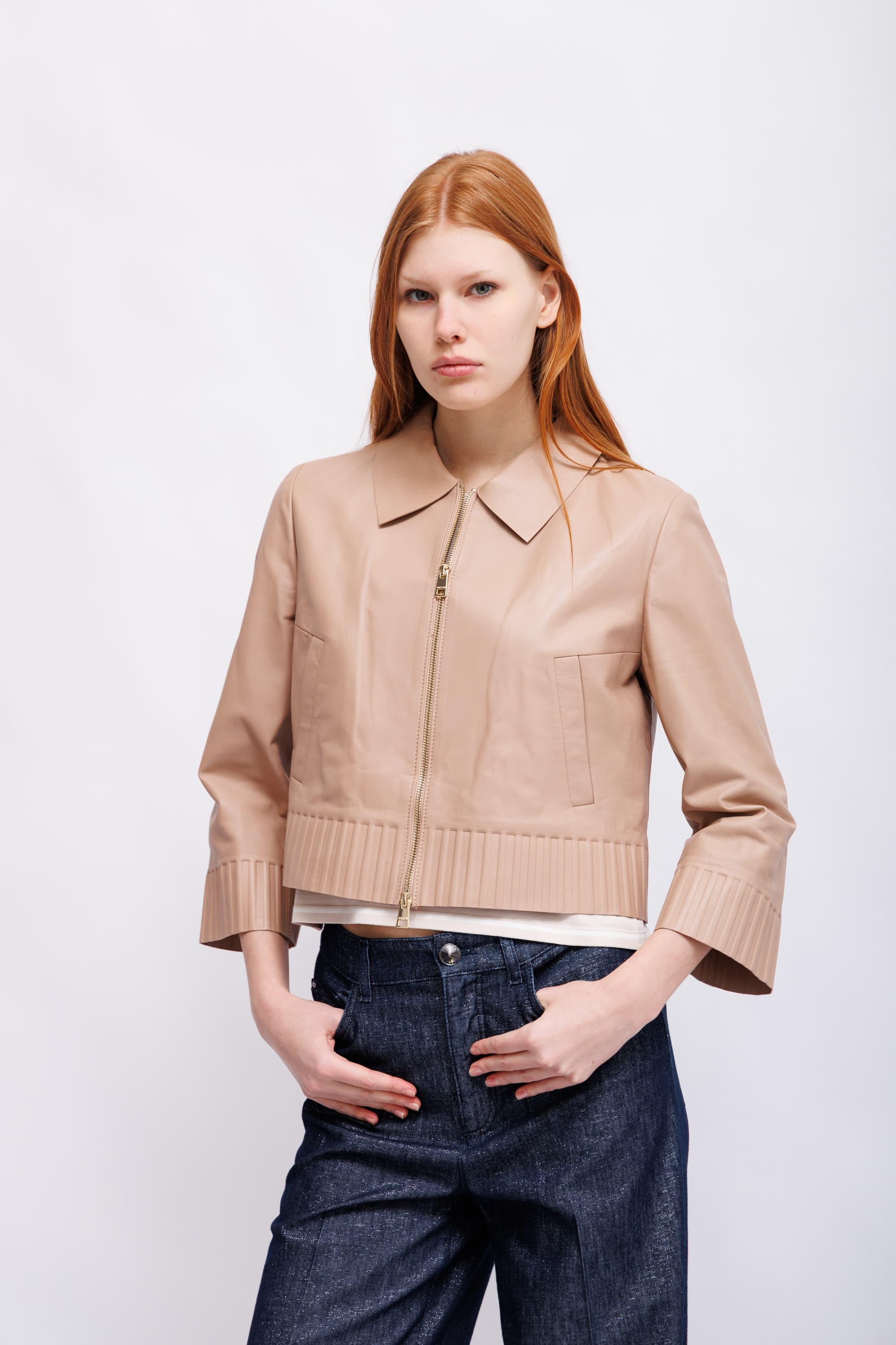 Элегантная куртка из мягкой овечьей кожи наппа с современной двусторонней молнией. Широкие рукава обеспечивают свободу движений, а рукава и нижний край куртки имеют тонкую ребристую текстуру, создавая стильный контраст. Высококачественная кожа и точная обработка придают этой куртке элегантный, минималистичный вид. Эта куртка от эко-линейки бренда «Rethink Together», ориентированной на экологичность.