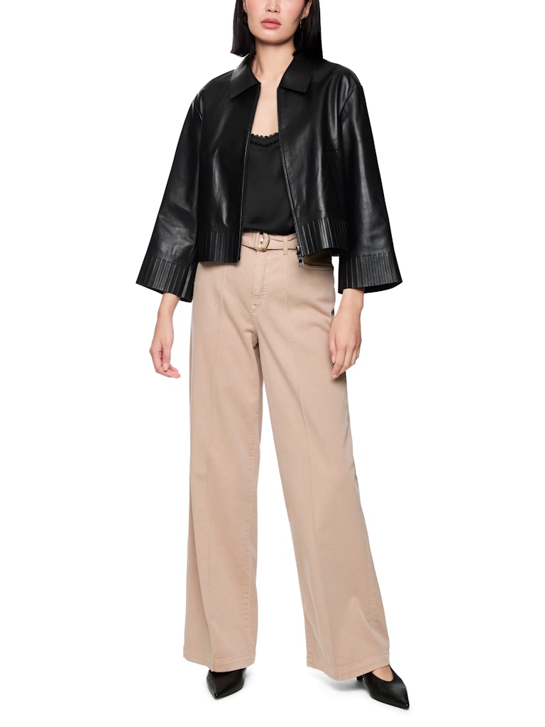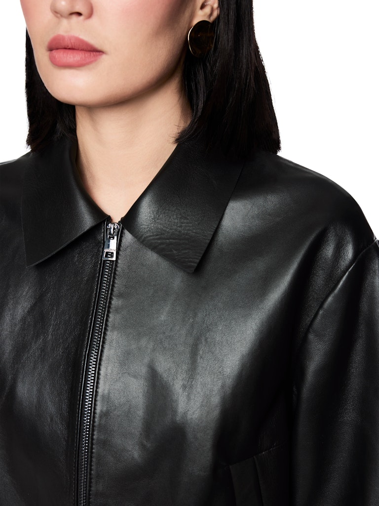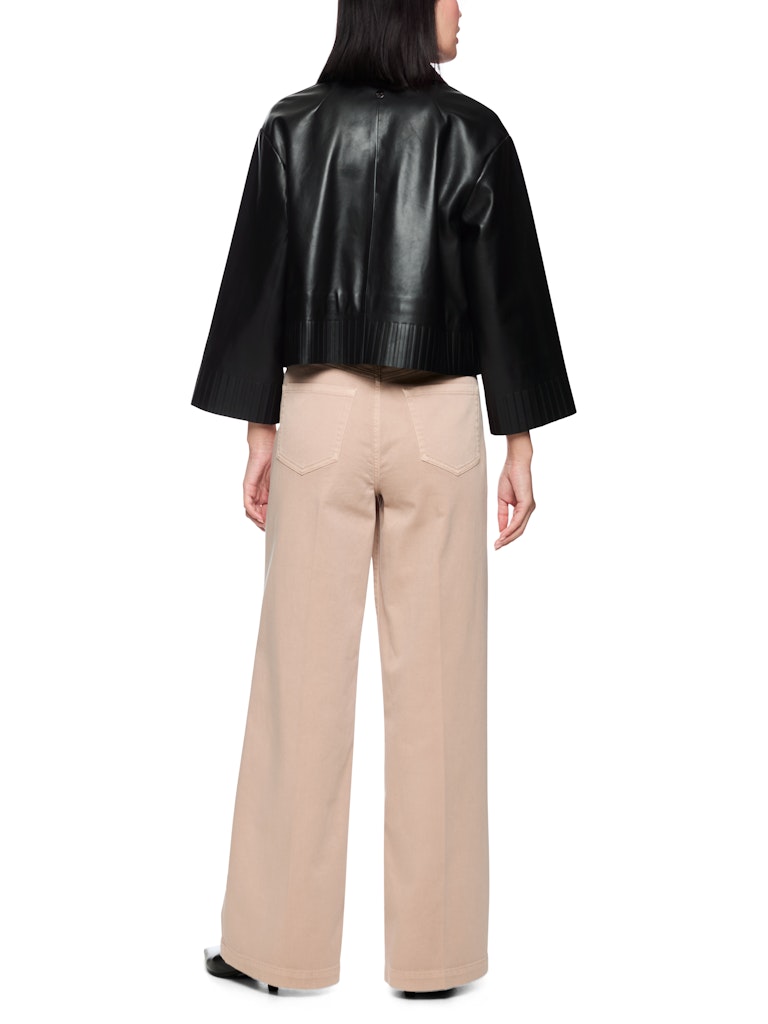 Элегантная куртка из мягкой овечьей кожи наппа с современной двусторонней молнией. Широкие рукава обеспечивают свободу движений, а рукава и нижний край куртки имеют тонкую ребристую текстуру, создавая стильный контраст. Высококачественная кожа и точная обработка придают этой куртке элегантный, минималистичный вид. Эта куртка от эко-линейки бренда «Rethink Together», ориентированной на экологичность.