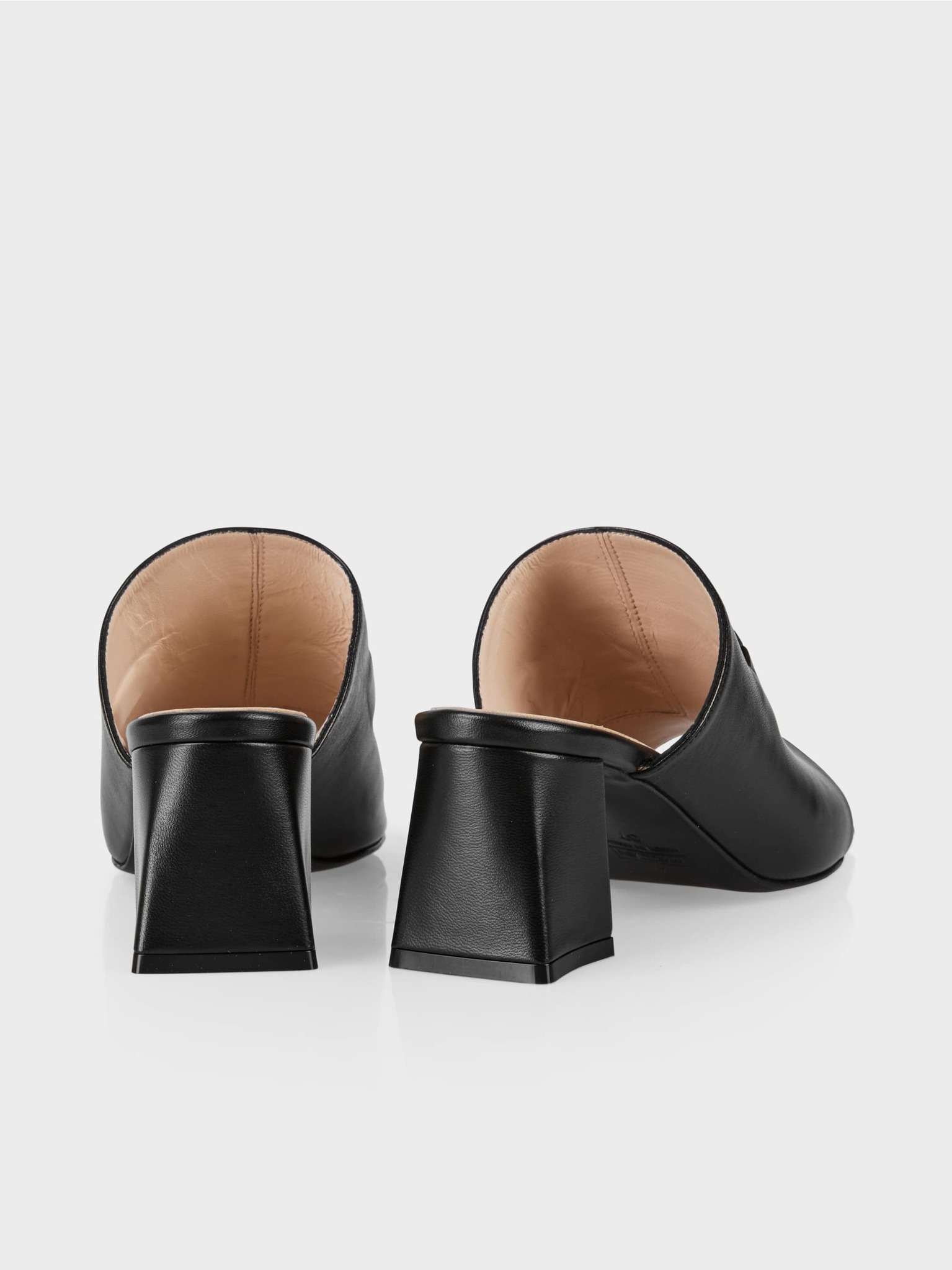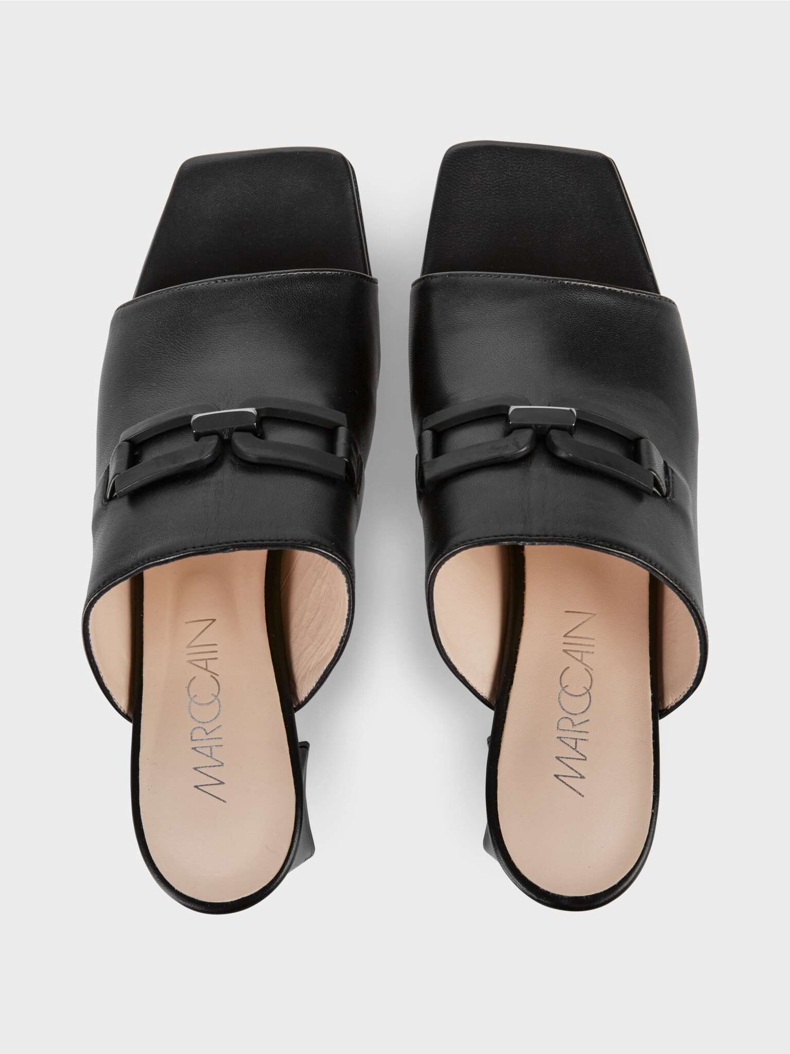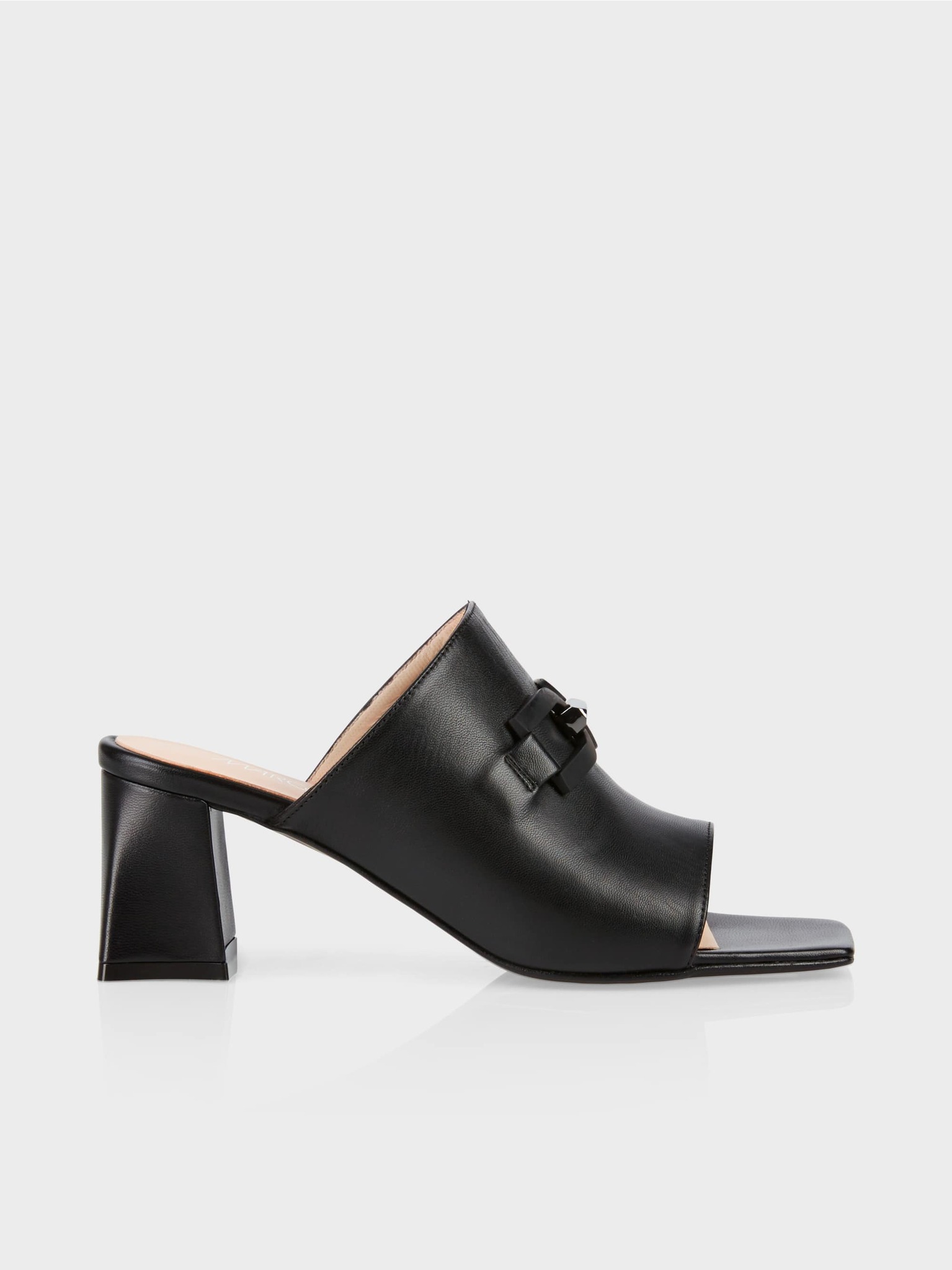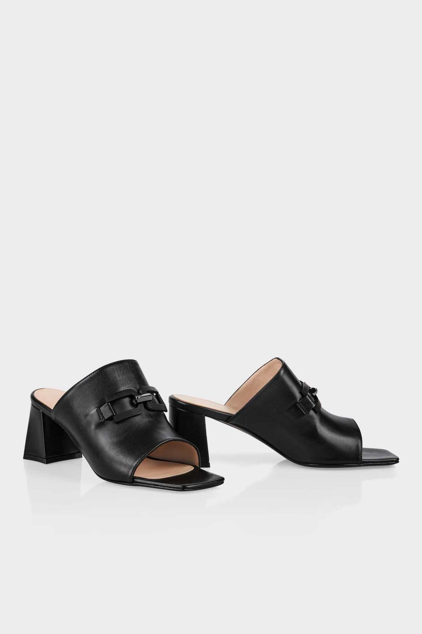 Мюли кожаныеЧёрный цветОтделка в виде крупных звеньев цепочкиУстойчивый каблукОткрытый квадратный нос