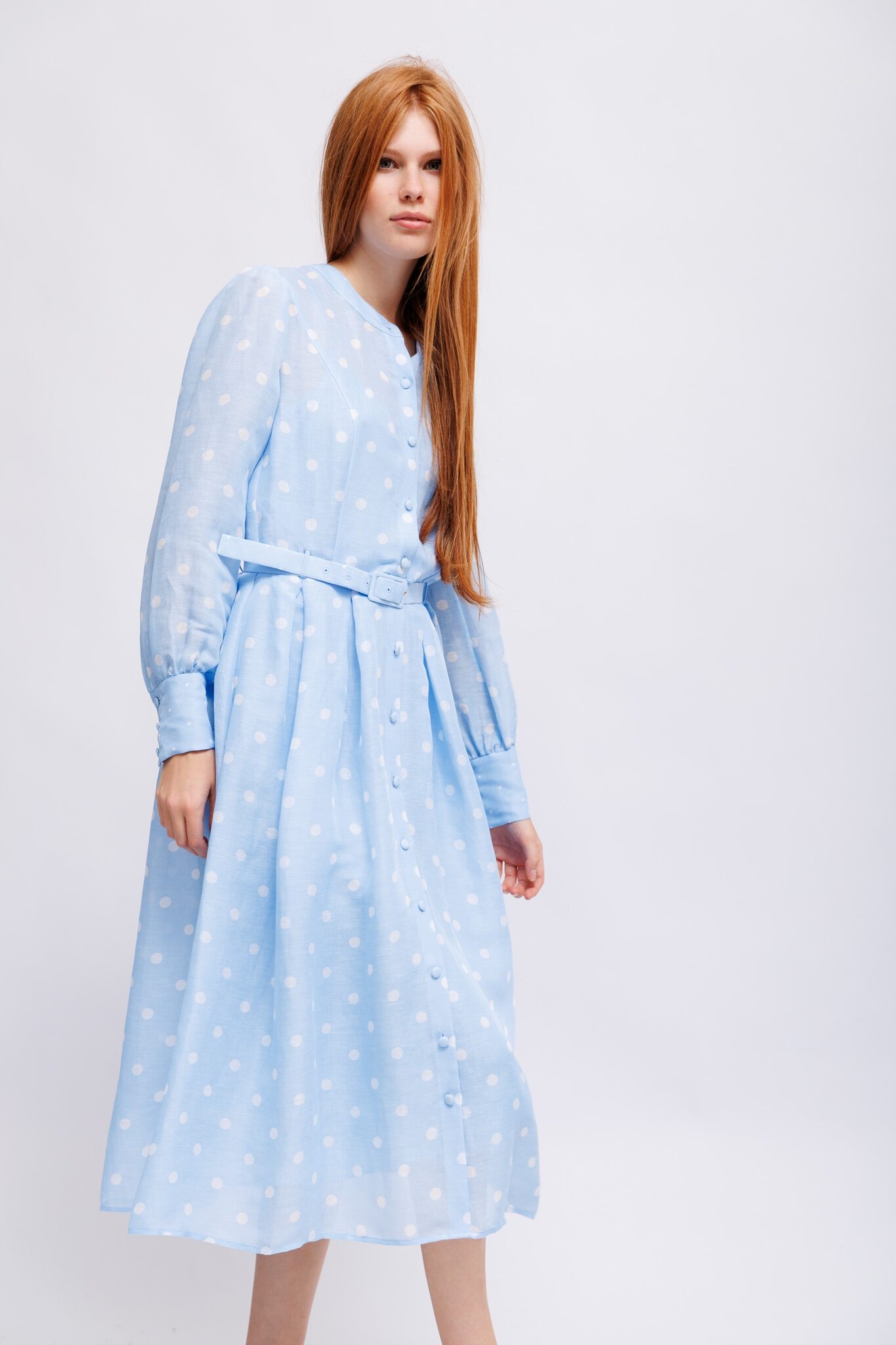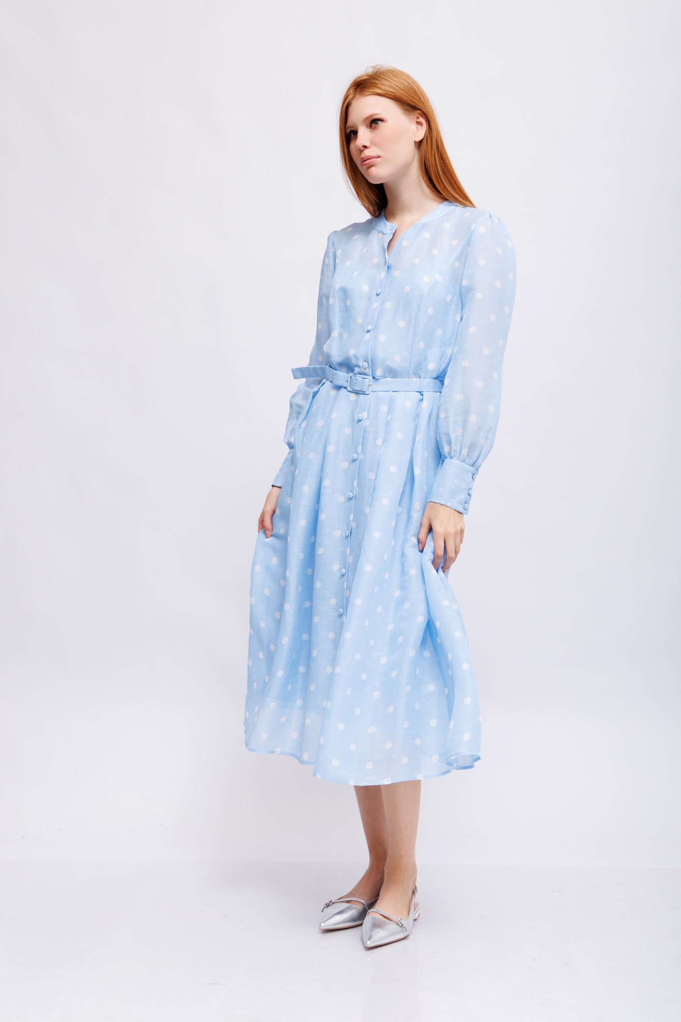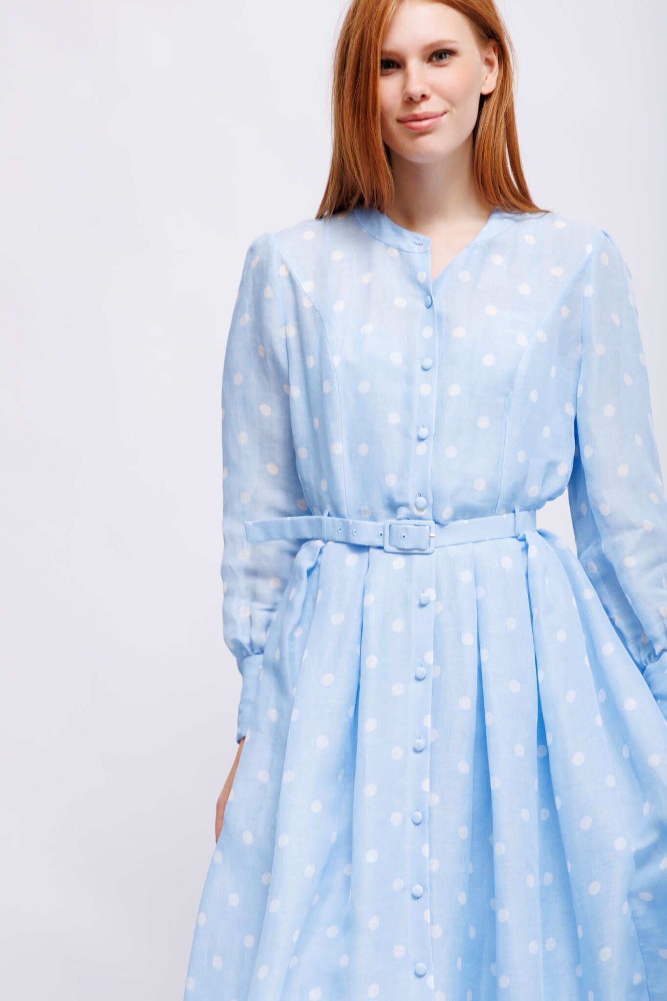 впечатляет своим ретро-шармом и высококачественной льняной и шелковой тканью. Пояс в тон подчеркивает талию. Обтянутые тканью пуговицы — еще один акцент.