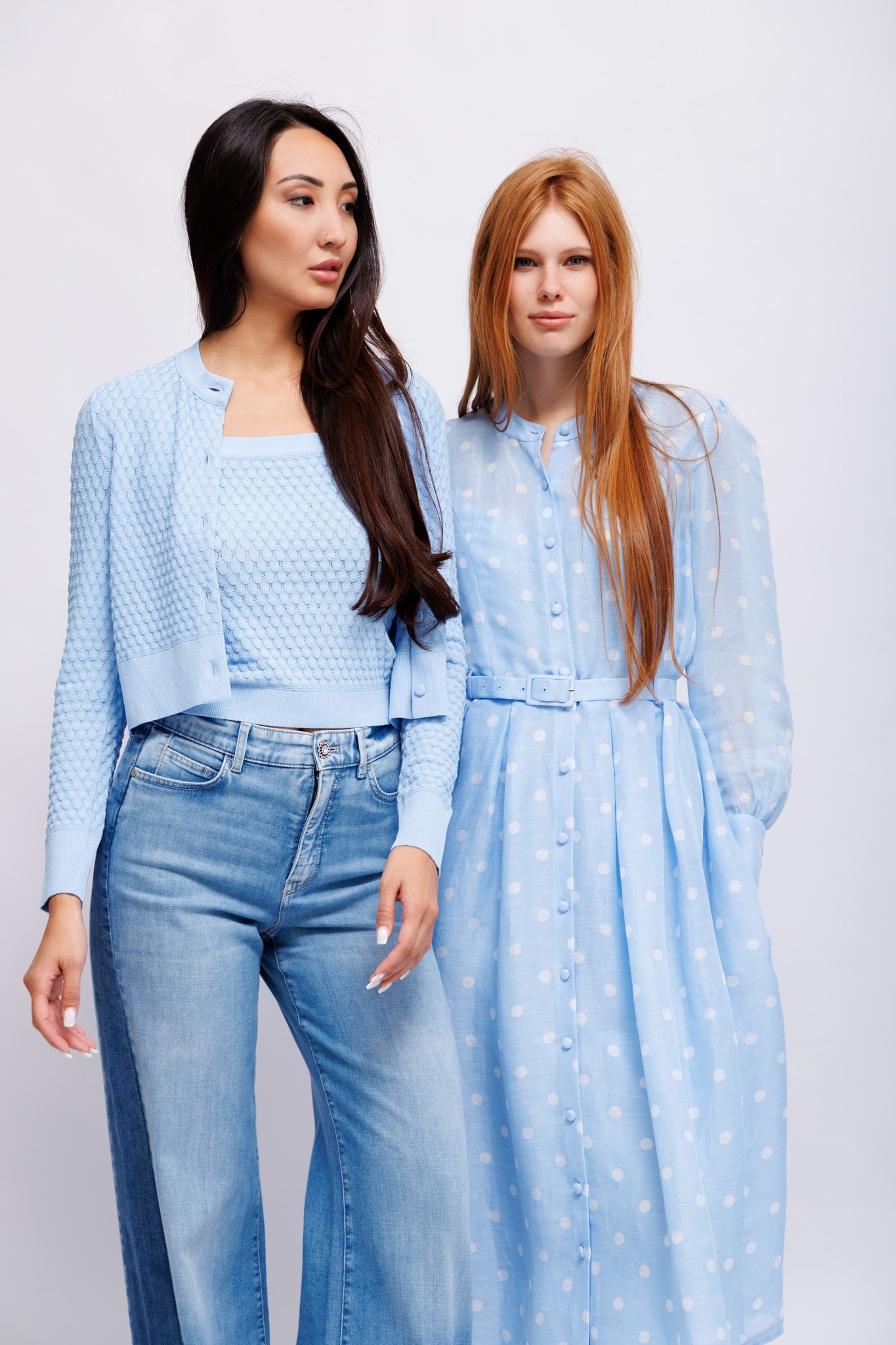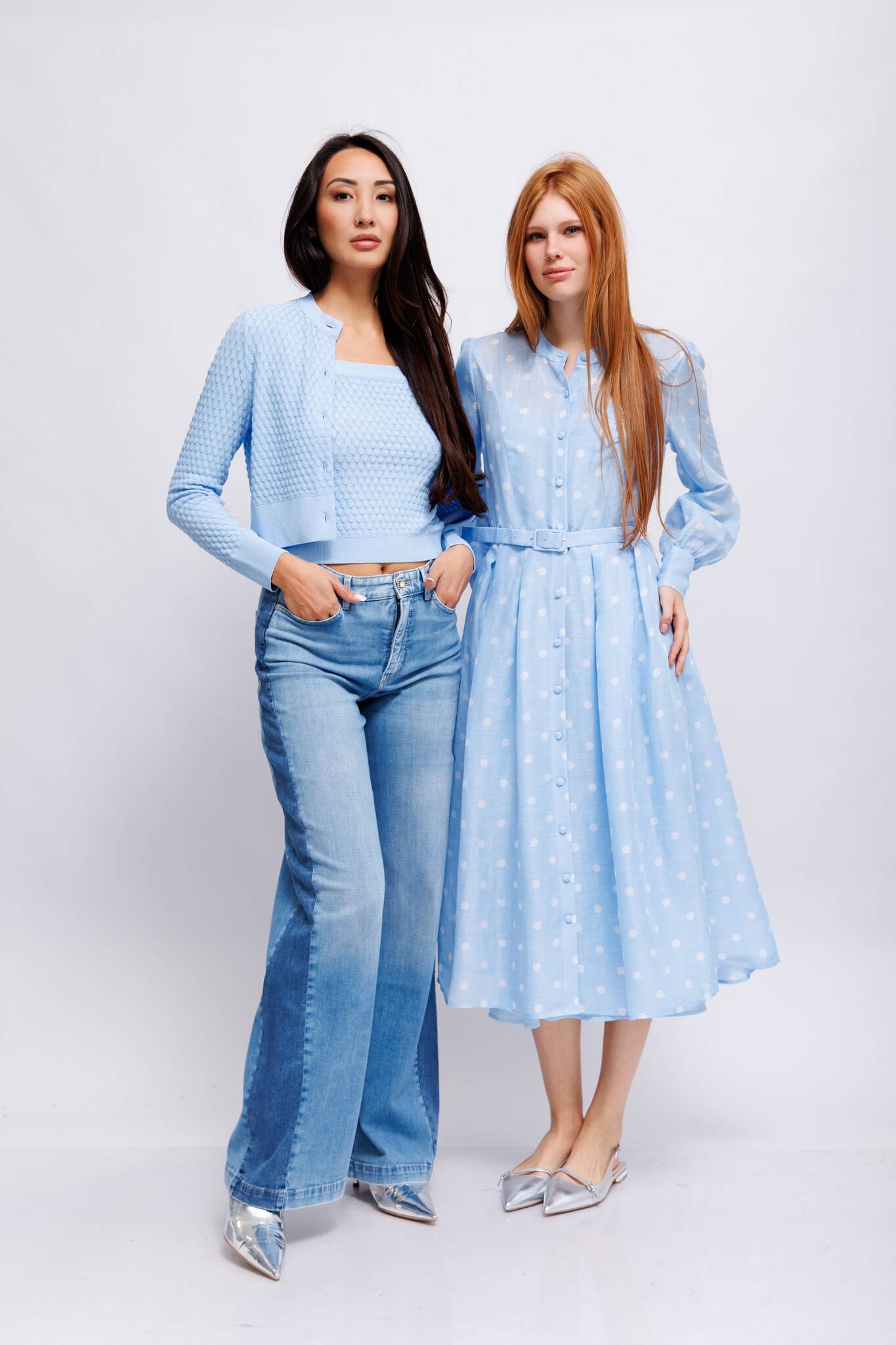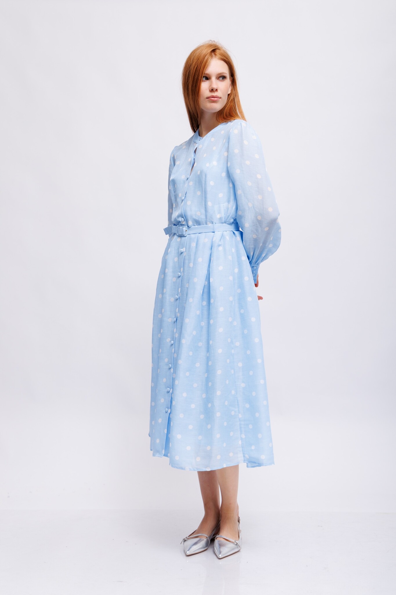 впечатляет своим ретро-шармом и высококачественной льняной и шелковой тканью. Пояс в тон подчеркивает талию. Обтянутые тканью пуговицы — еще один акцент.