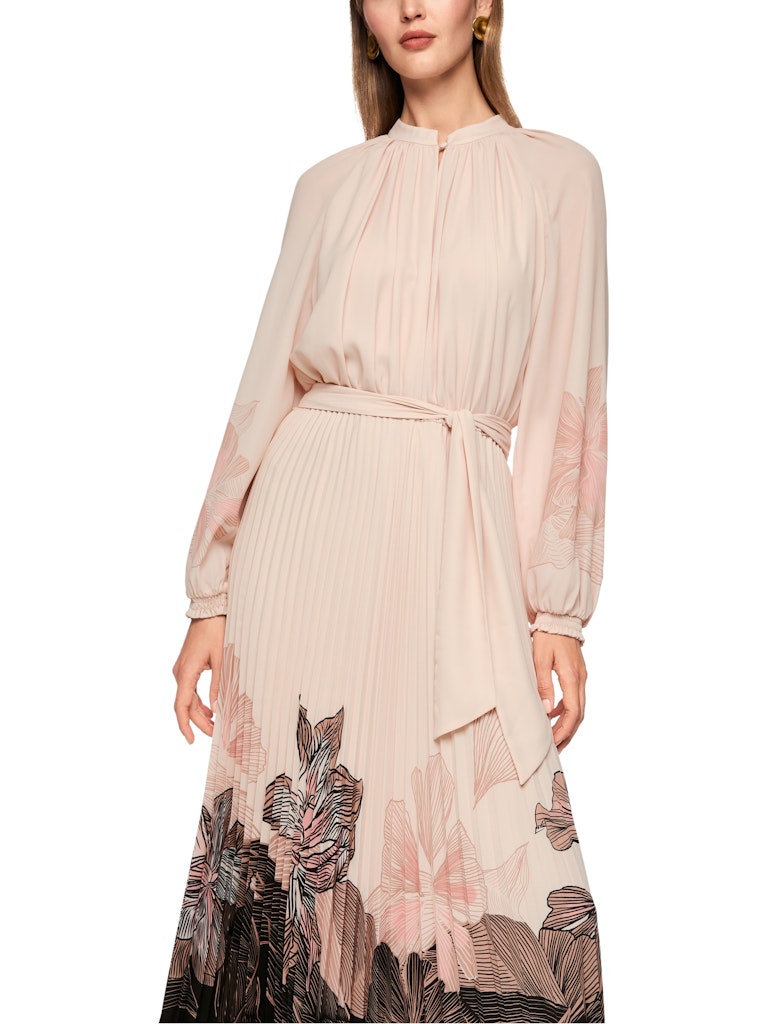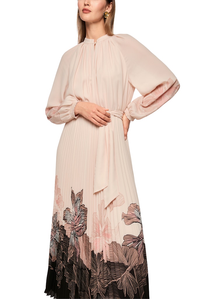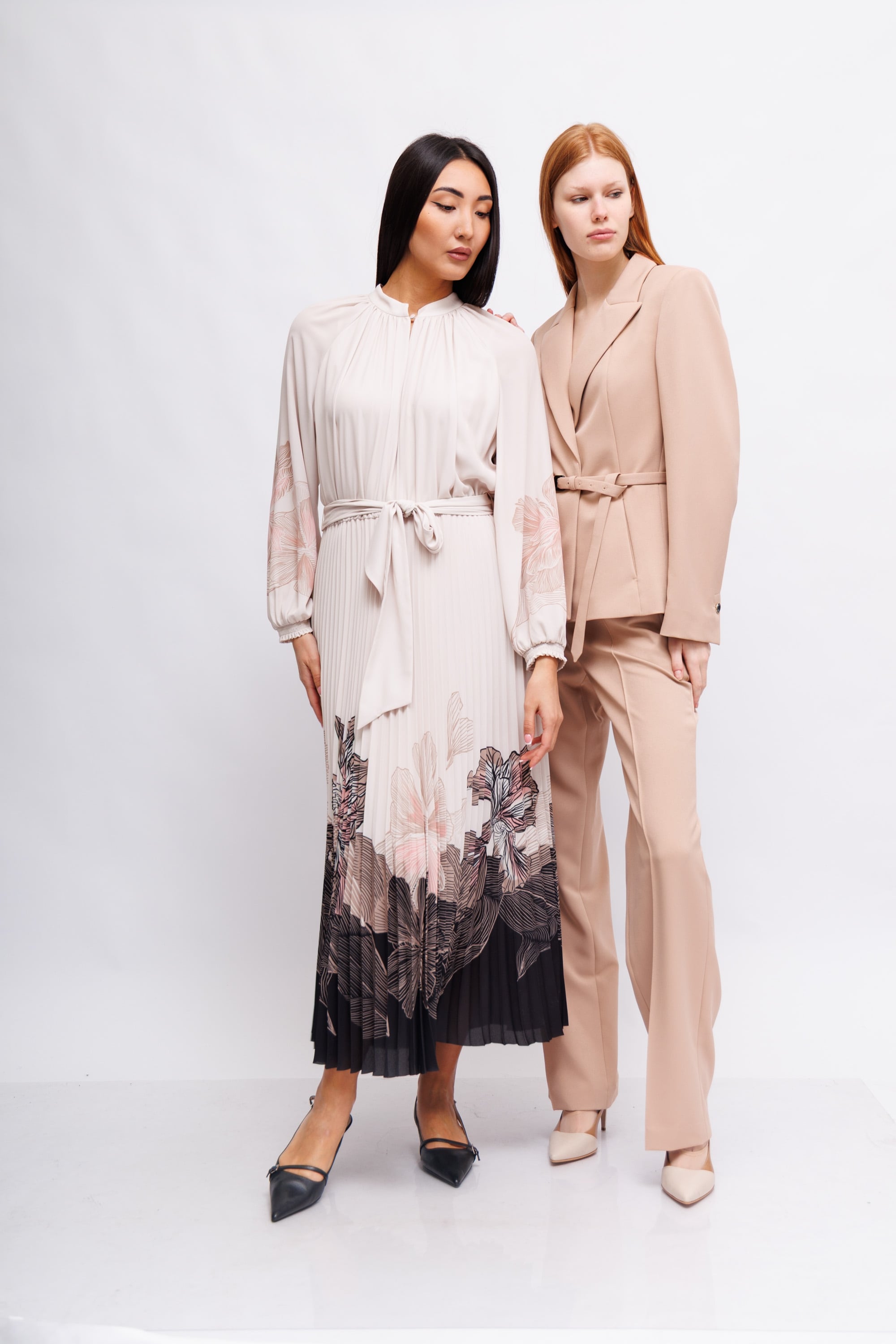 состоящее из блузки и плиссированной юбки. Юбка и рукава украшены нежным цветочным принтом, а рукава реглан заканчиваются манжетами. Воротник-стойка с разрезом спереди застегивается на пуговицу. Пояс на талии подчеркивает фигуру. Дизайн сочетает в себе четкие линии, изысканный крой и романтические детали. Платье также от экологичной линейки бренда «Rethink Together».