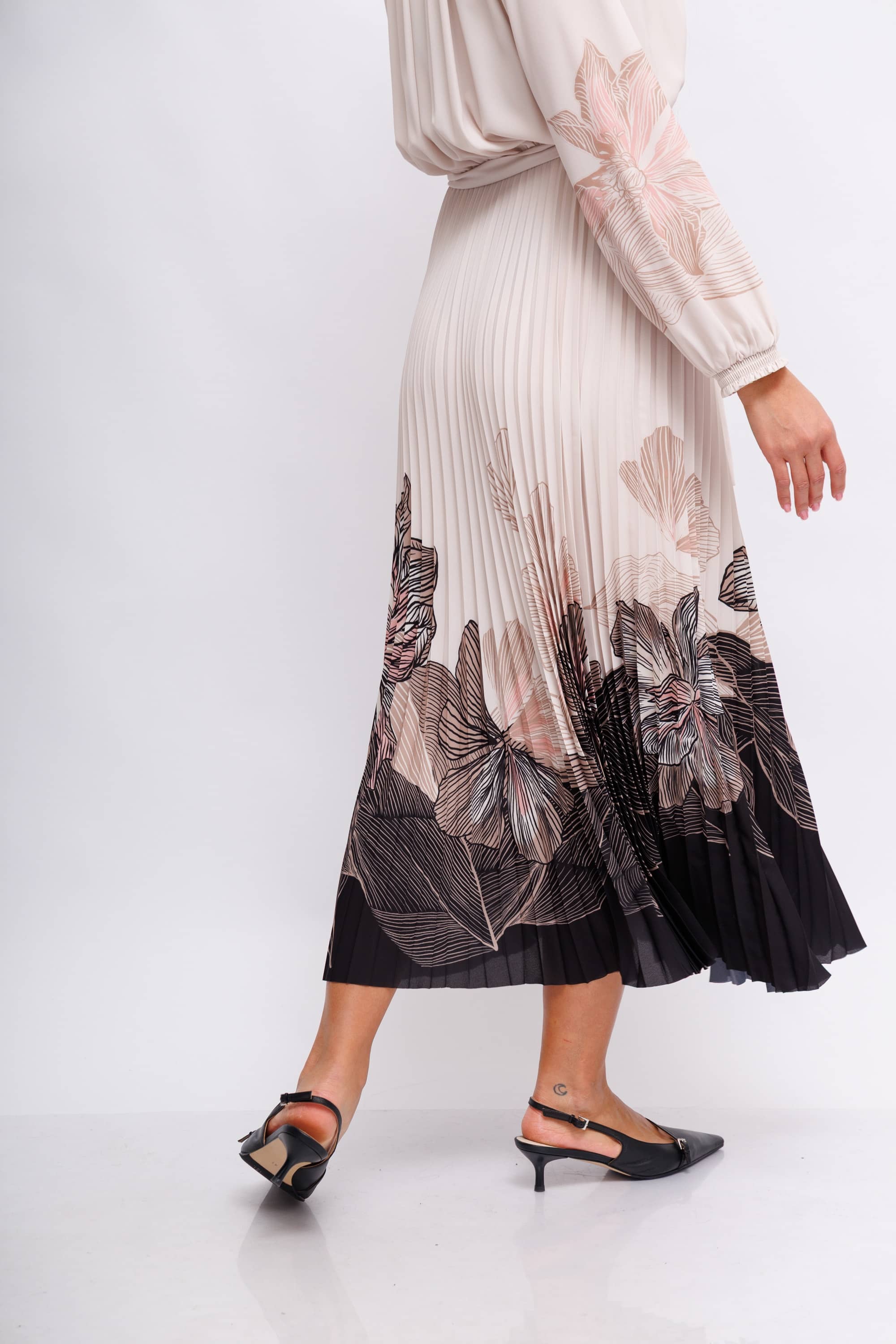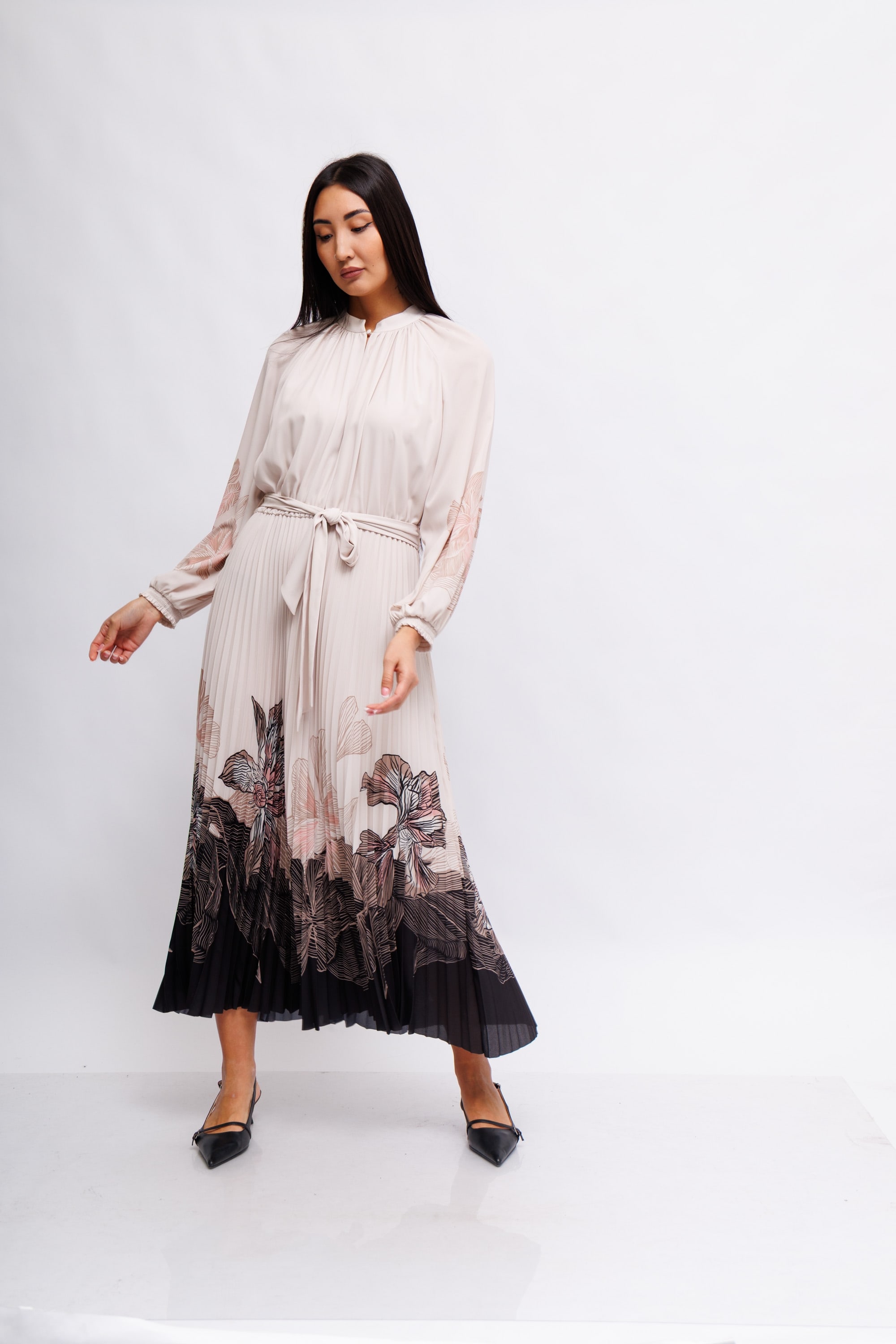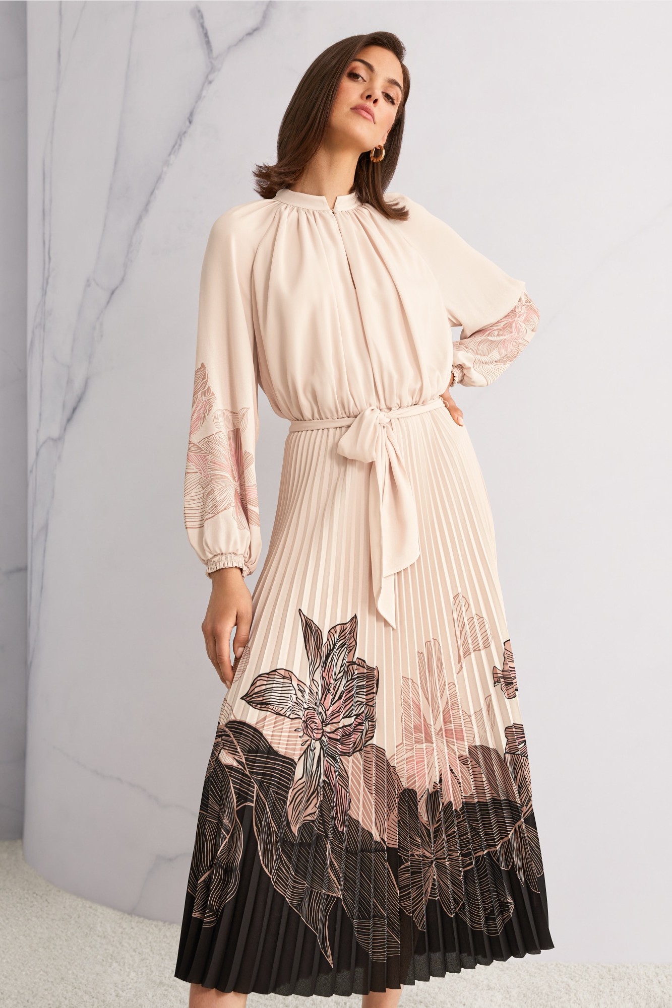 состоящее из блузки и плиссированной юбки. Юбка и рукава украшены нежным цветочным принтом, а рукава реглан заканчиваются манжетами. Воротник-стойка с разрезом спереди застегивается на пуговицу. Пояс на талии подчеркивает фигуру. Дизайн сочетает в себе четкие линии, изысканный крой и романтические детали. Платье также от экологичной линейки бренда «Rethink Together».