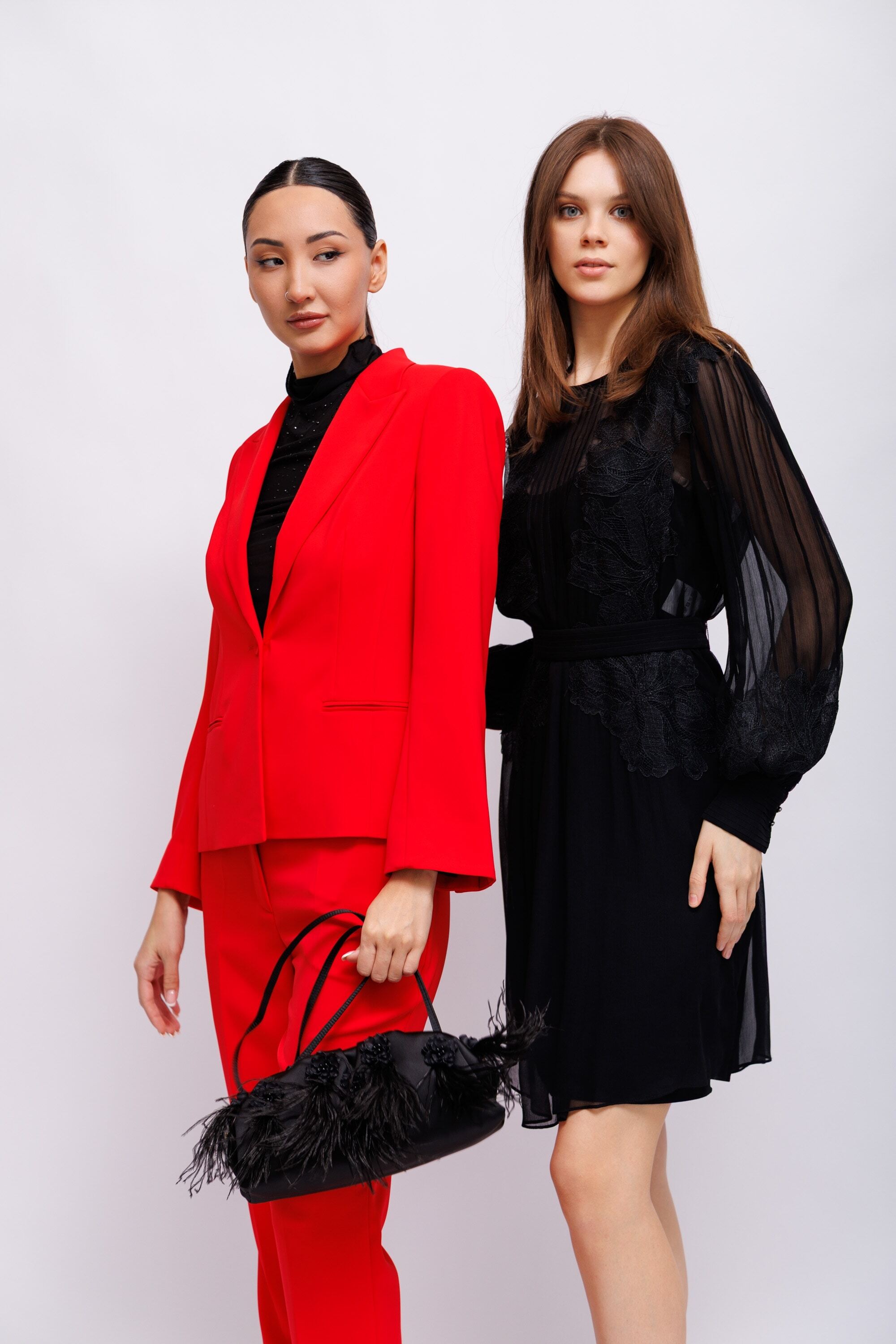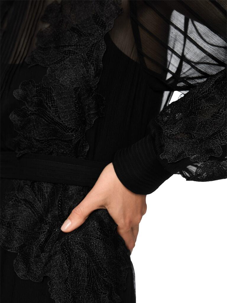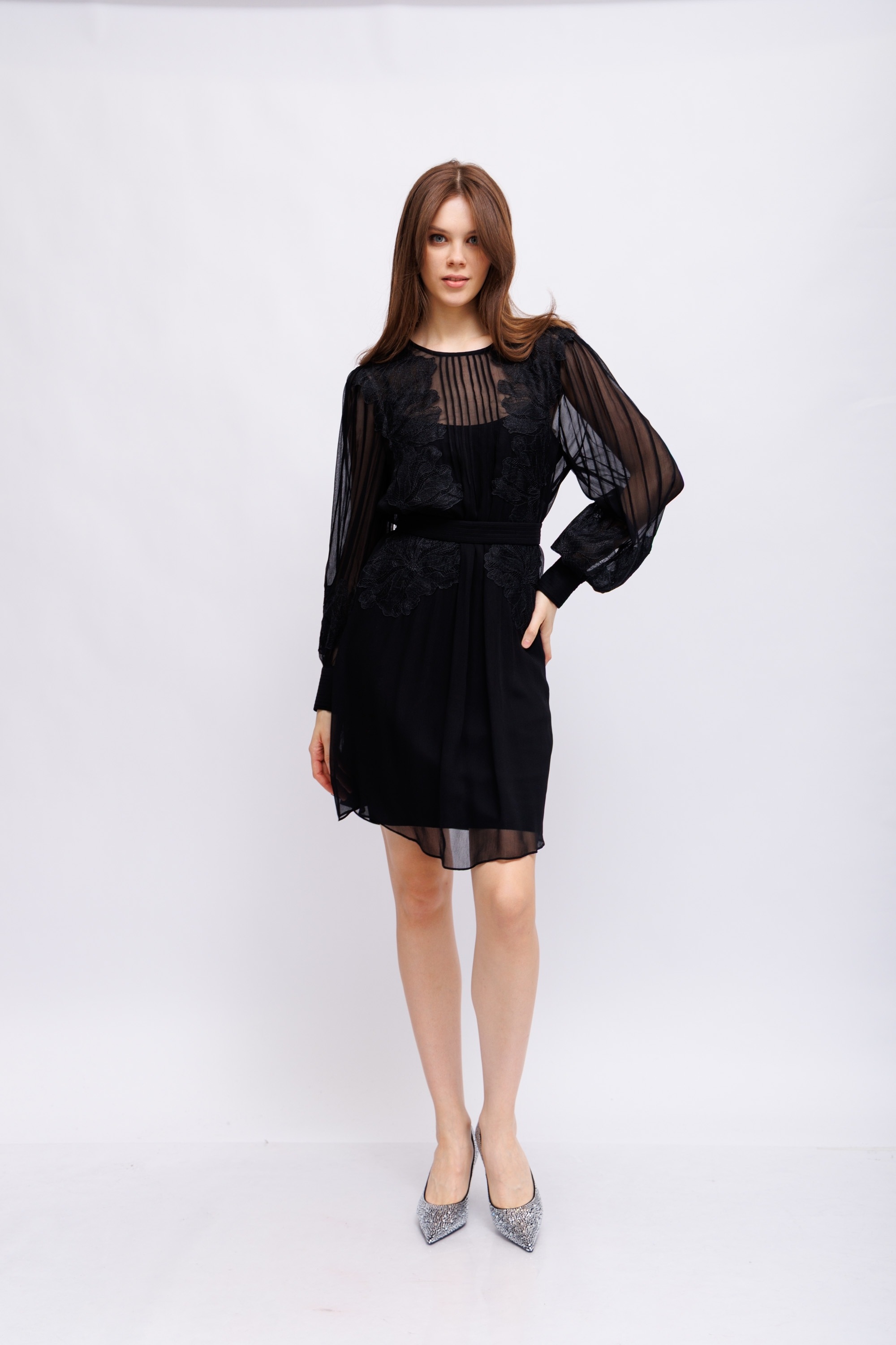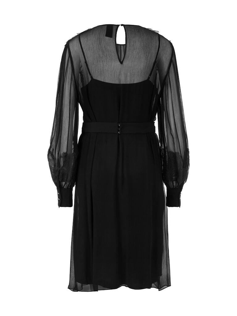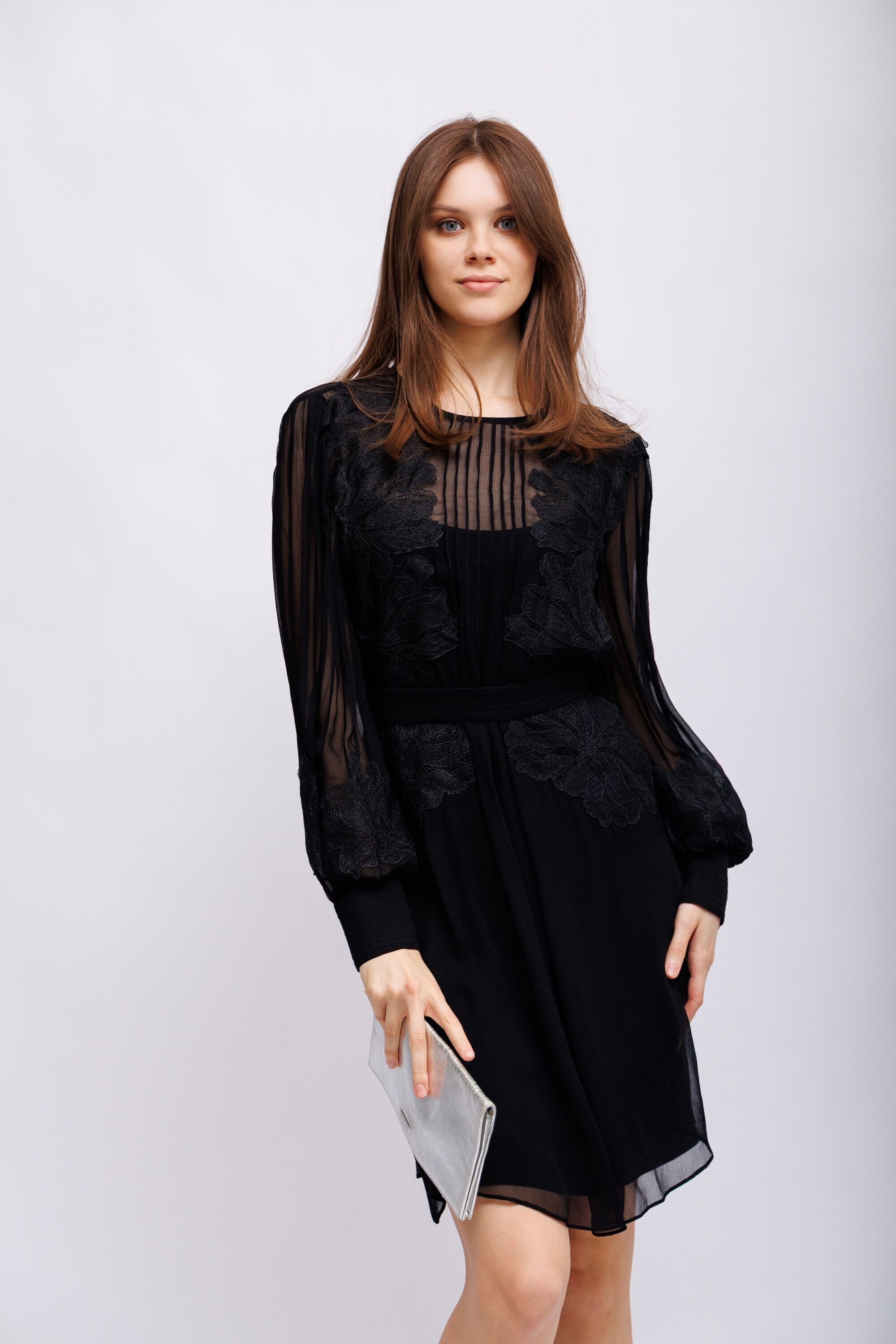 Комбинация с регулируемыми бретелями делает платье полупрозрачным в этой области. Съёмный пояс и лёгкие рукава-фонарики с присборенными манжетами подчёркивают элегантность. Платье застёгивается сзади на небольшую пуговицу. Идеально подходит для летнего мероприятия.