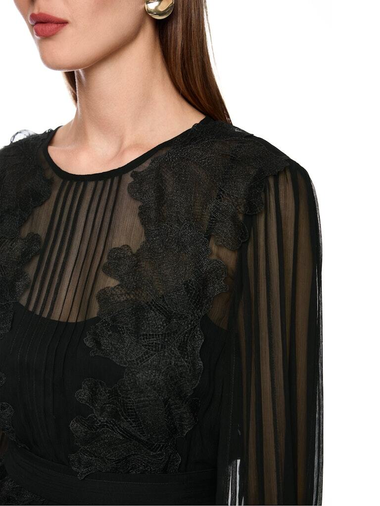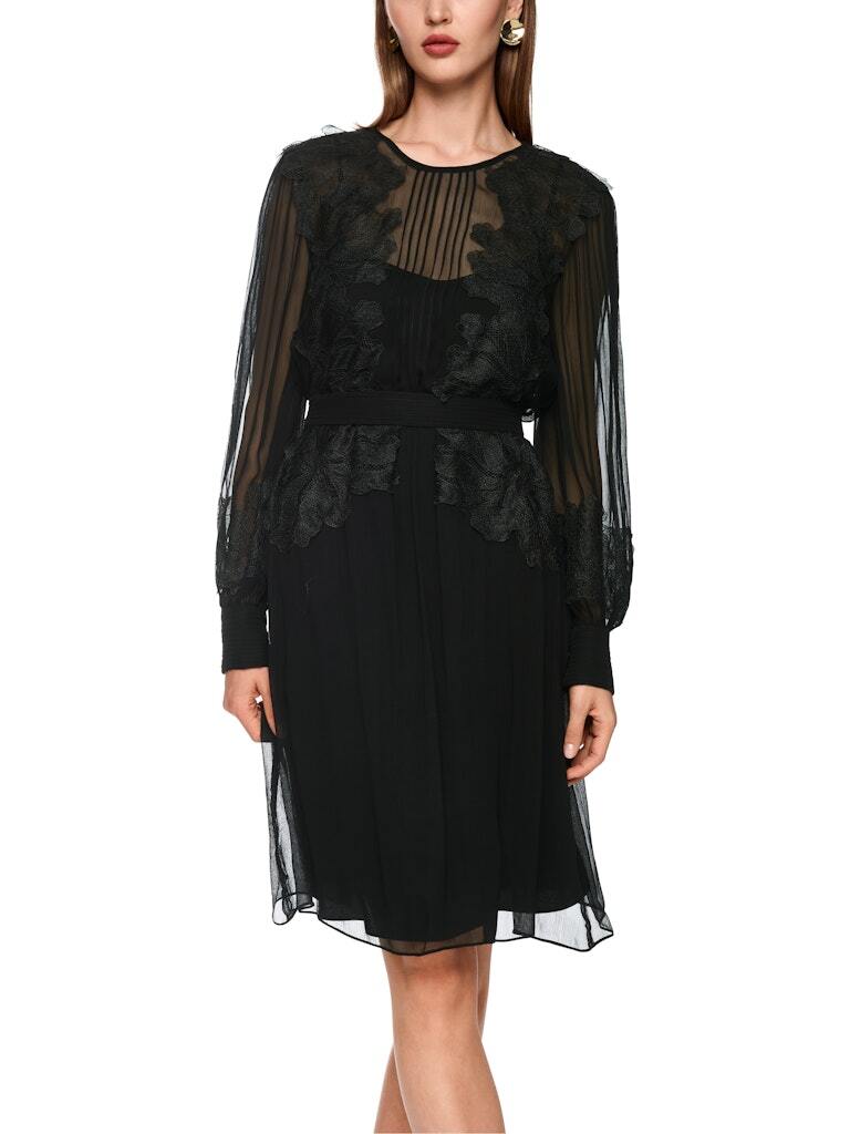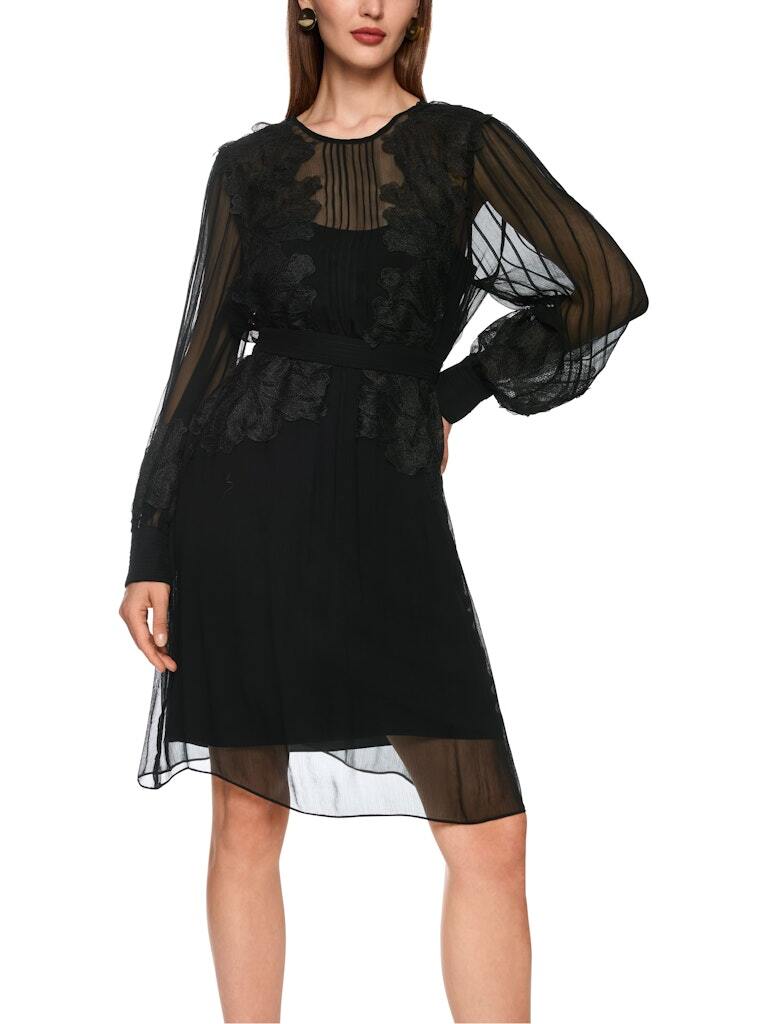 Платье свободного кроя с элегантной кружевной отделкой и прозрачным материалом