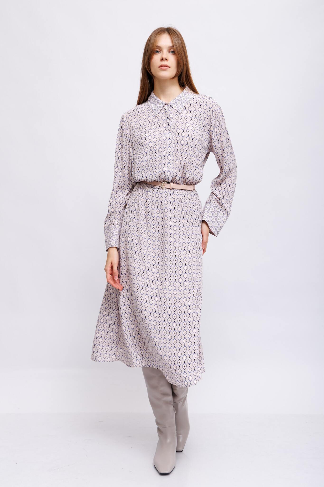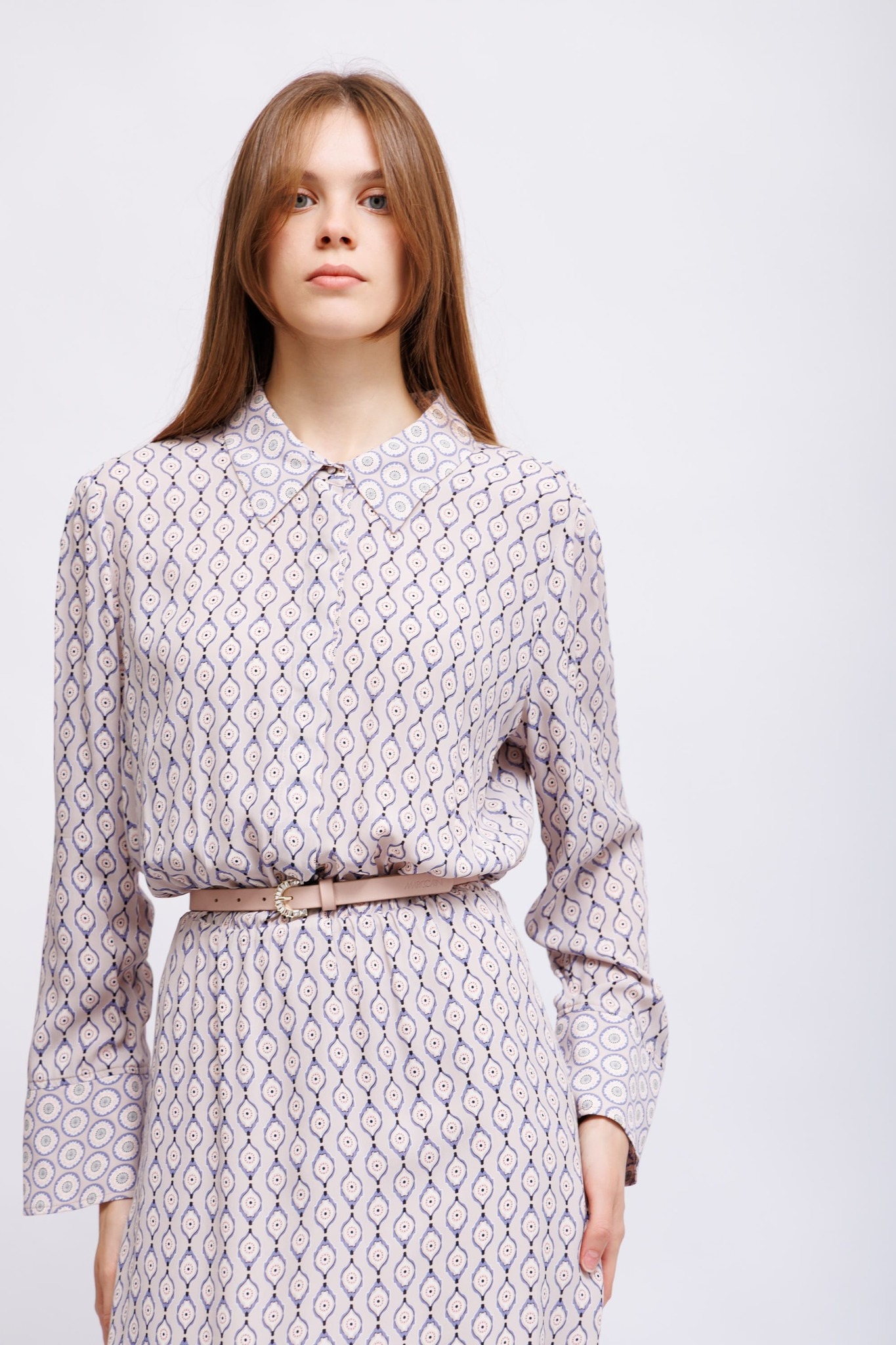 классическим воротником и манжетами с контрастным принтом. Платье застёгивается на потайные пуговицы по линии талии и имеет струящуюся пришитую юбку.