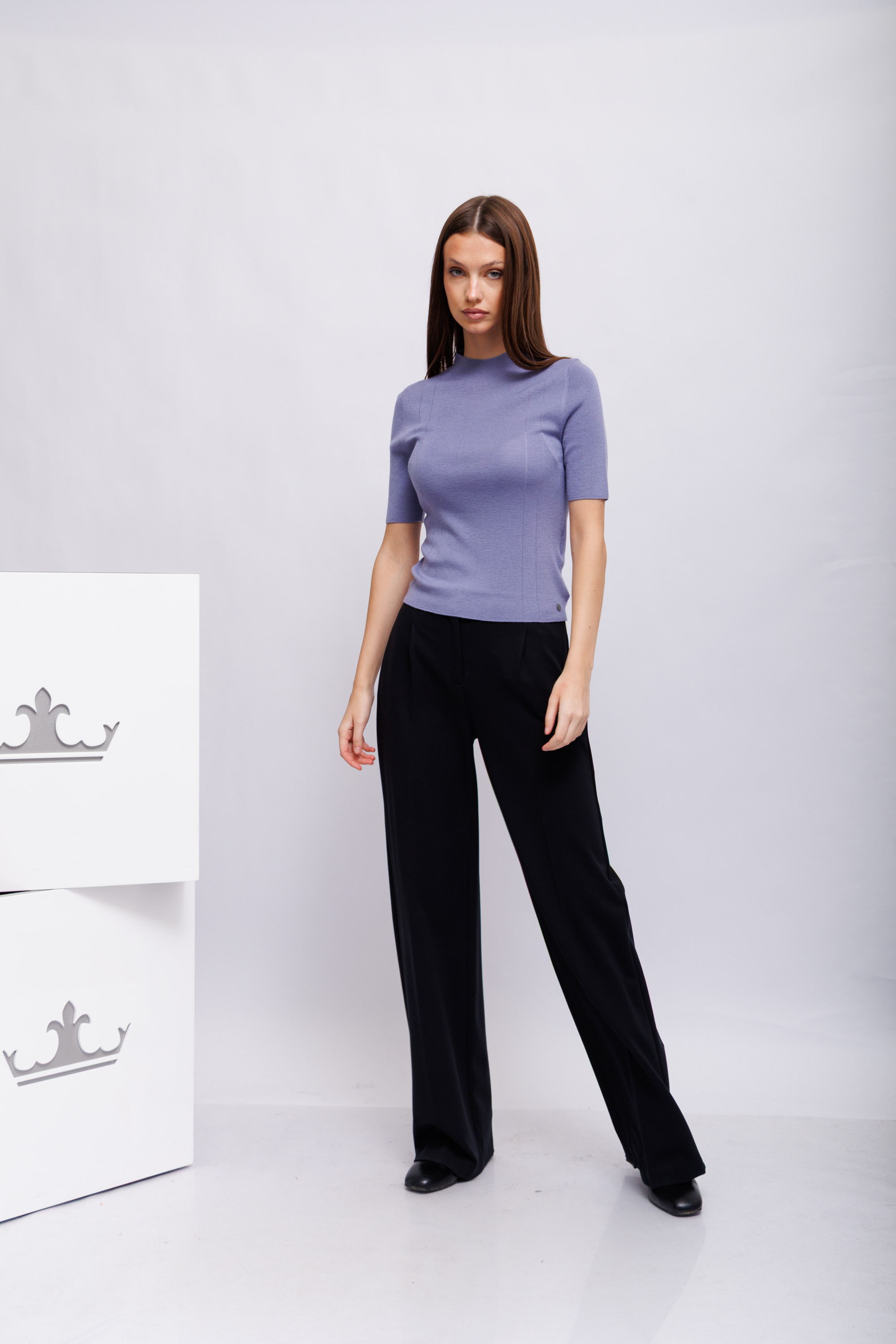 Этот трикотаж с мерцающей люрексовой нитью станет идеальным базовым вариантом. Облегающего кроя со слегка стоячим воротником, очень удобно в носке. Короткие рукава подчеркивают элегантный стиль. Тактильно приятная вещь