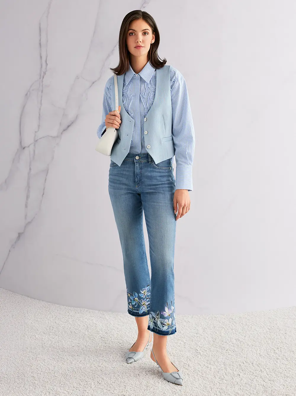 Блузка в вертикальную полоску с классическим воротником-стойкой и потайной застежкой на пуговицы – современная, повседневная и универсальная. Спущенные плечи и широкие манжеты придают дизайну элегантную непринужденность. Особое внимание привлекают стеганые ленты в цветочном узоре, придающие образу женственность и индивидуальность. Стильная вещь для многих случаев.