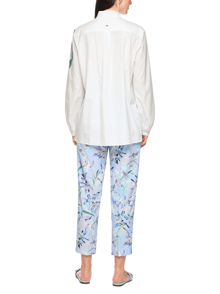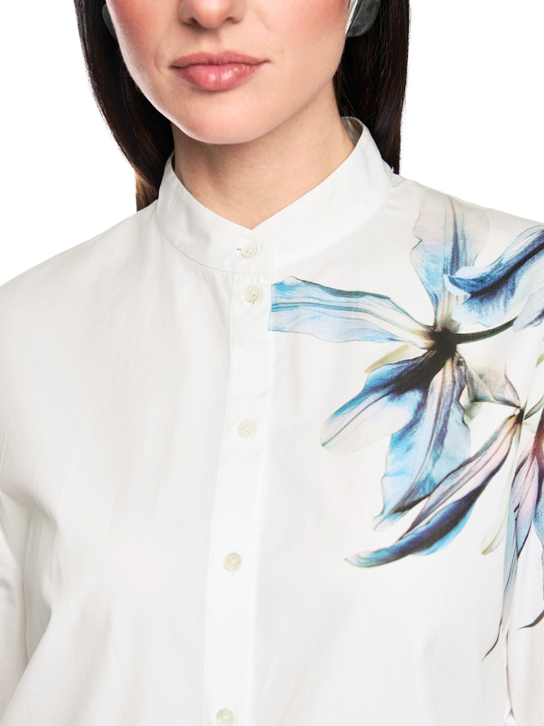 Блузка прямого кроя с классической застежкой на пуговицы. Удлиненный силуэт и боковые разрезы обеспечивают оптимальную свободу движений. Свободные рукава заканчиваются удобными эластичными манжетами. Изюминкой дизайна является крупный принт с лилиями с одной стороны, который придает образу женственность и современность. Идеально сочетается с брюками или юбками.