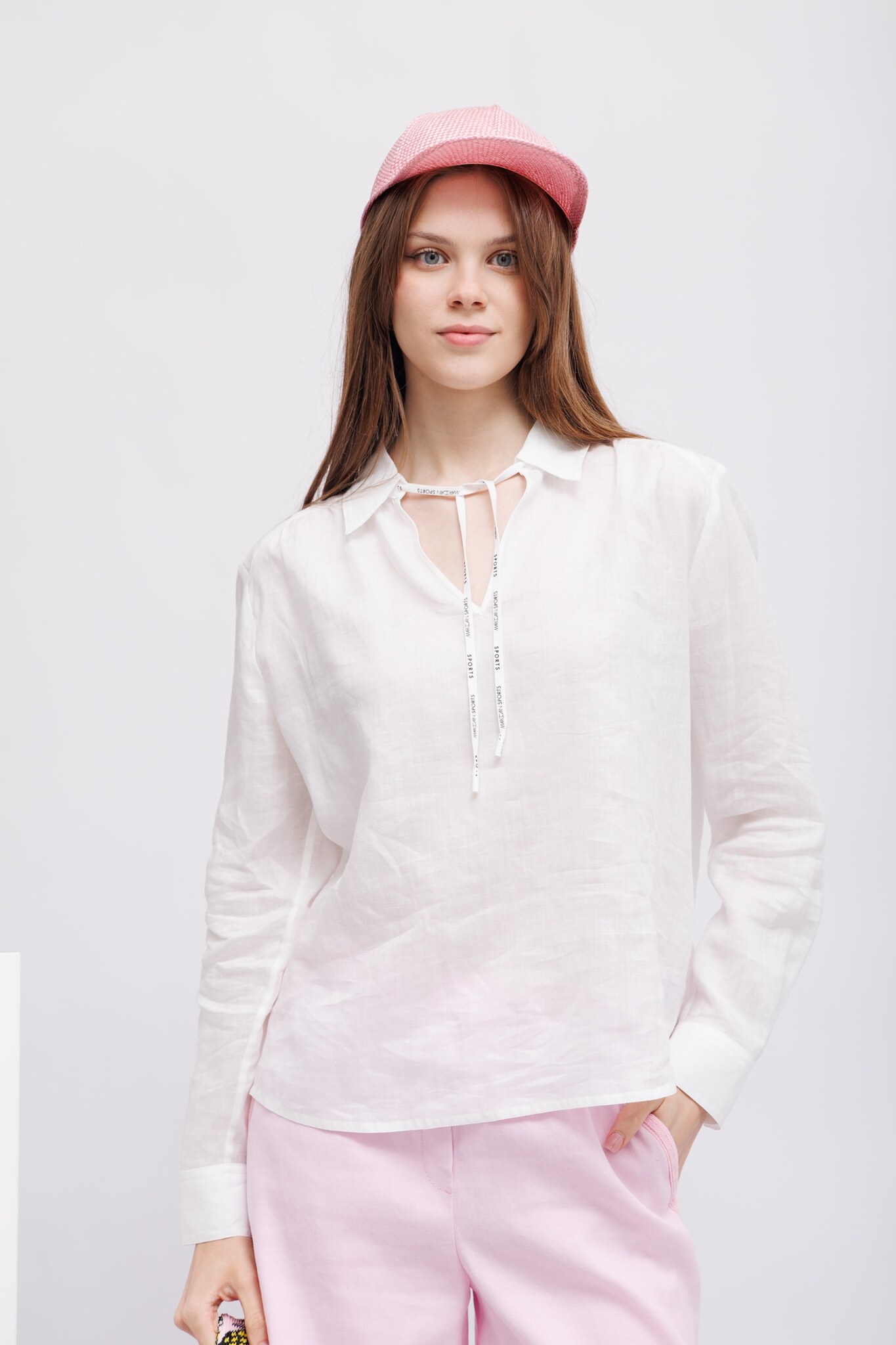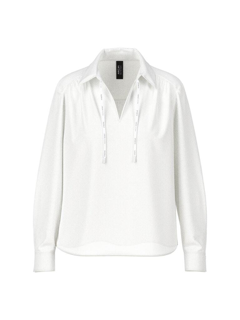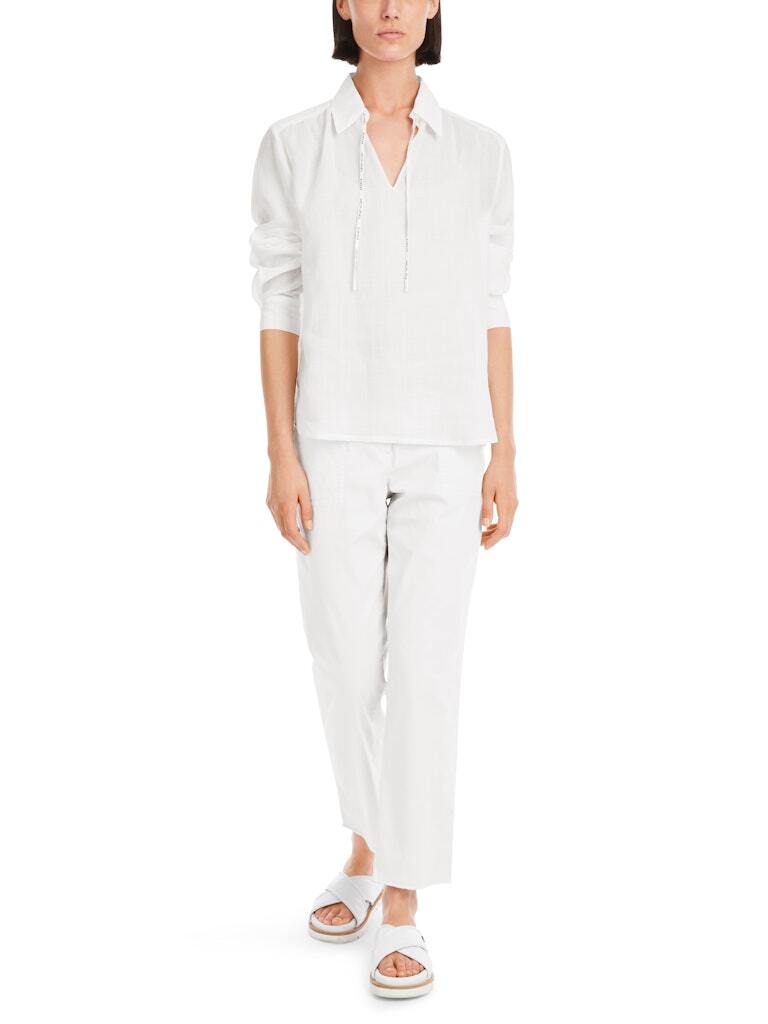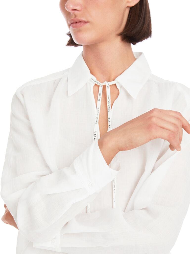 Эта блузка без застежки из нежной рами идеально подходит для жаркой погоды. Материал полупрозрачный. Блузка имеет свободный крой. Воротник отложной, имеет разрез спереди и застегивается на шнурок. Рукава с манжетами завершают дизайн.