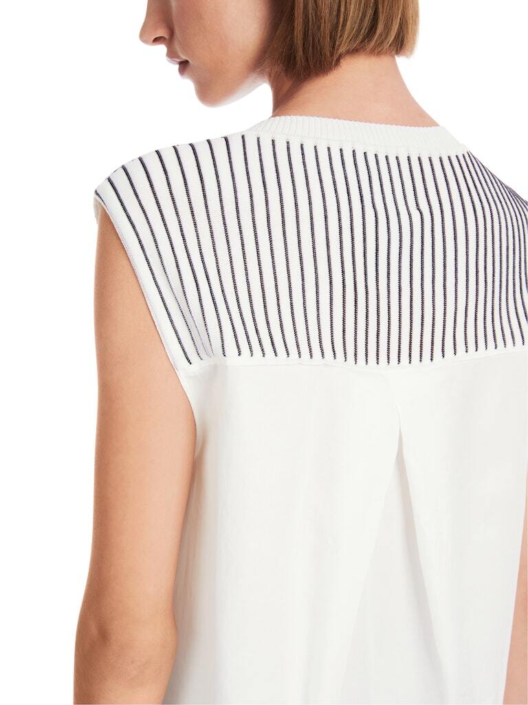 Он имеет круглый вырез и однотонный на удлиненной, закругленной спинке. Силуэт имеет О-образную форму с глубокой коробчатой складкой на спине. Этот топ связан и отделан из смеси хлопка и вискозы в Германии. Дальнейшая обработка отдельных деталей происходит на европейских предприятиях-партнерах.