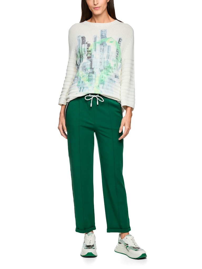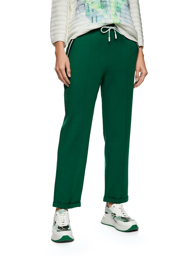 Модель FRIA, изготовленная из мягкой хлопковой смеси с модалом и эластаном, имеет женственный крой и стандартную посадку. Узкие отвороты, прошитые складки и широкий спортивный эластичный пояс со шнурком обеспечивают современный комфорт. Наклонные карманы с контрастными деталями идеально дополняют эти стильные брюки.