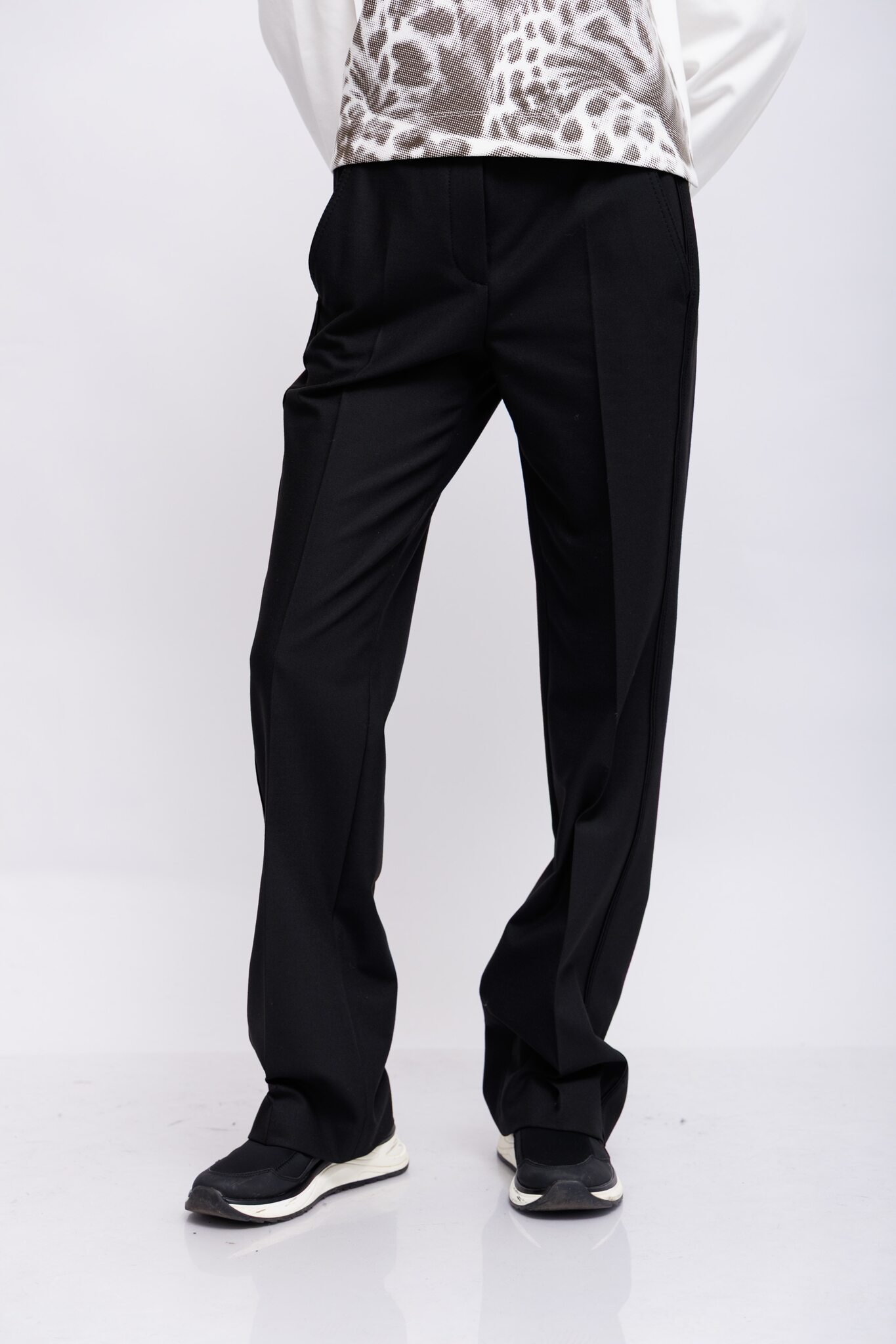 Модель FAID. имеют удлиненный покрой в женственном стиле с заутюженными складками. Изящная деталь — прошитая полоска вдоль брючин. Благодаря содержанию шерсти эти брюки сохраняют тепло, а эластан обеспечивает комфорт. Высокий пояс застегивается на пуговицы.