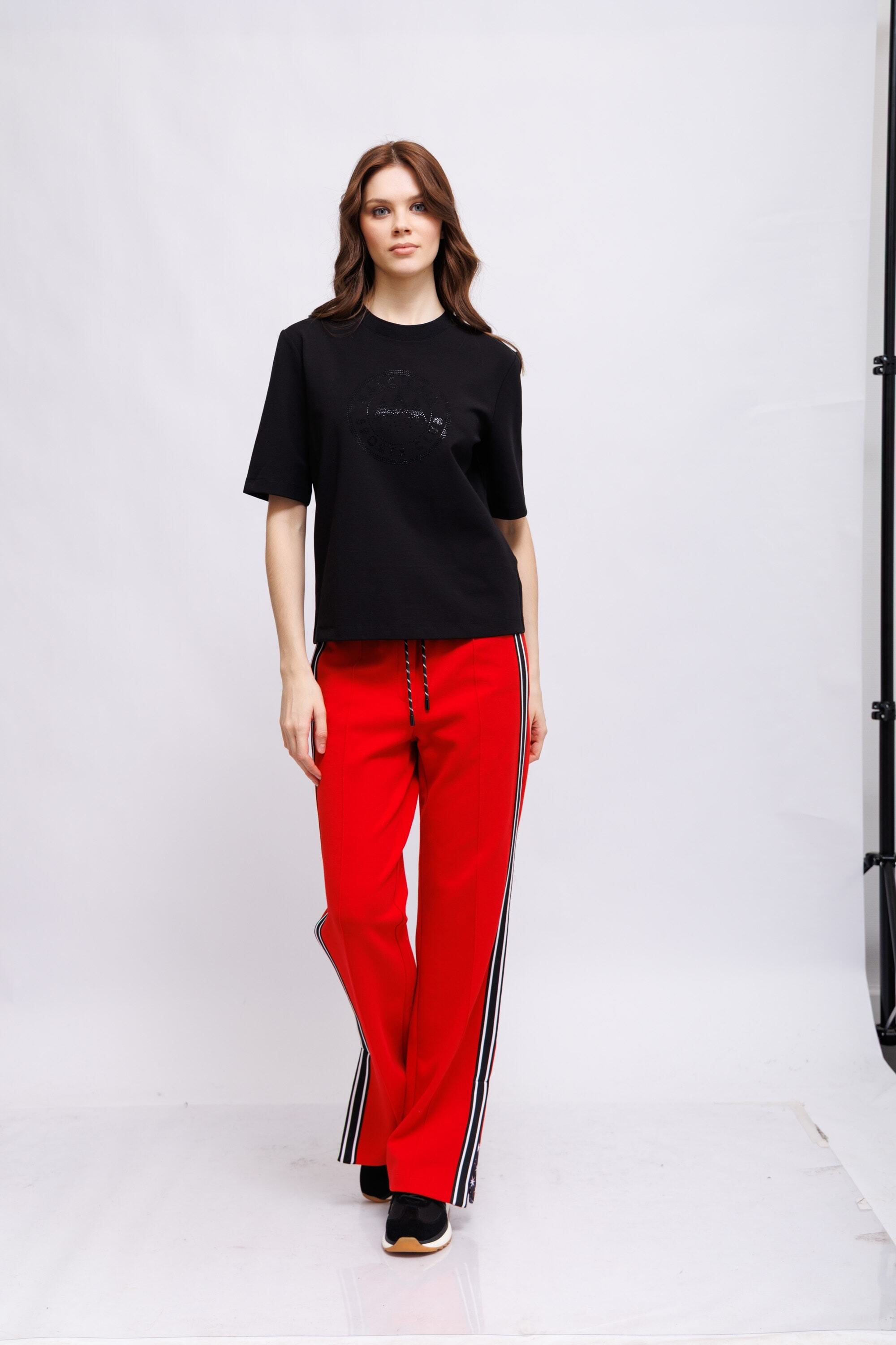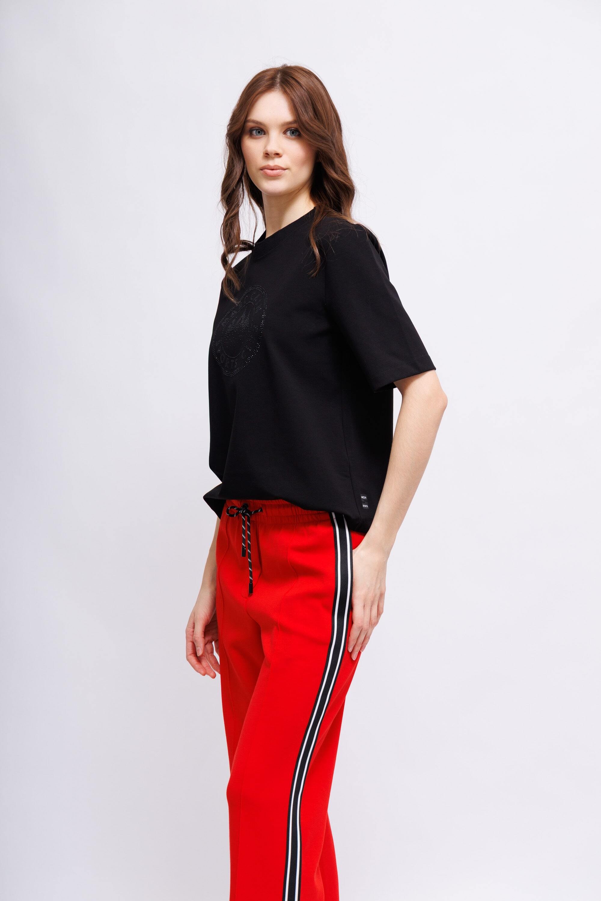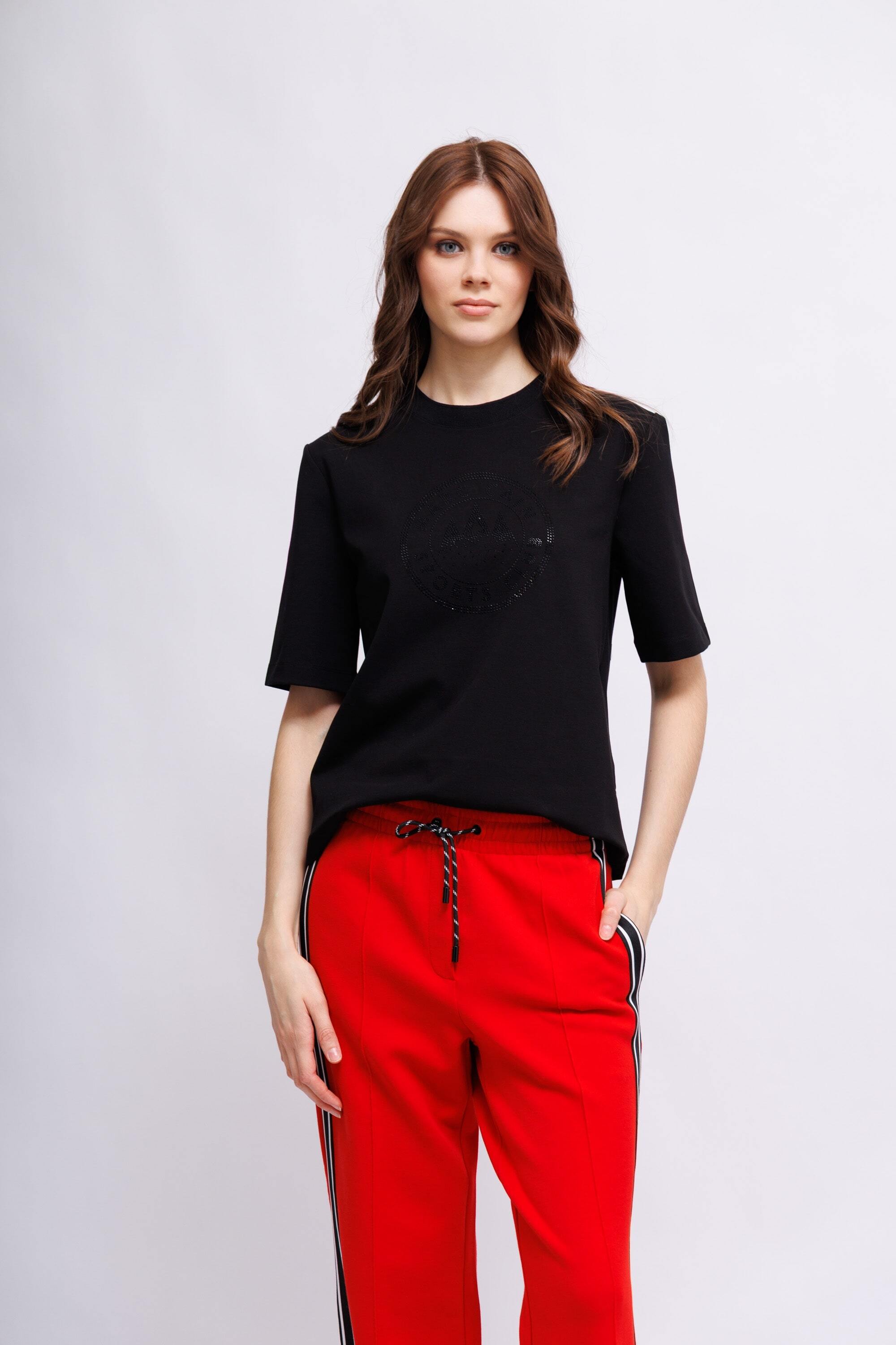 Однотонная футболка с короткими рукавами и круглым вырезом, украшенная круглым мотивом горячей фиксации со стразами(технология HotFix) на уровне груди – Marc Cain Sports Club – который добавляет немного лёгкого блеска. Эта футболка из мягкой хлопковой смеси удобна в носке и имеет спортивный дизайн. Идеально подходит для создания непринуждённых, повседневных образов.