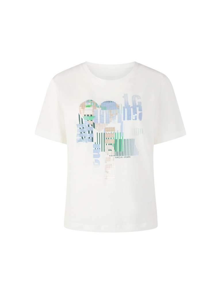 Стильная хлопковая футболка свободного кроя с короткими рукавами и круглым вырезом. Украшенная привлекательным принтом и тонкой, прозрачной вышивкой из пайеток, эта футболка идеально подходит для модного повседневного образа.
