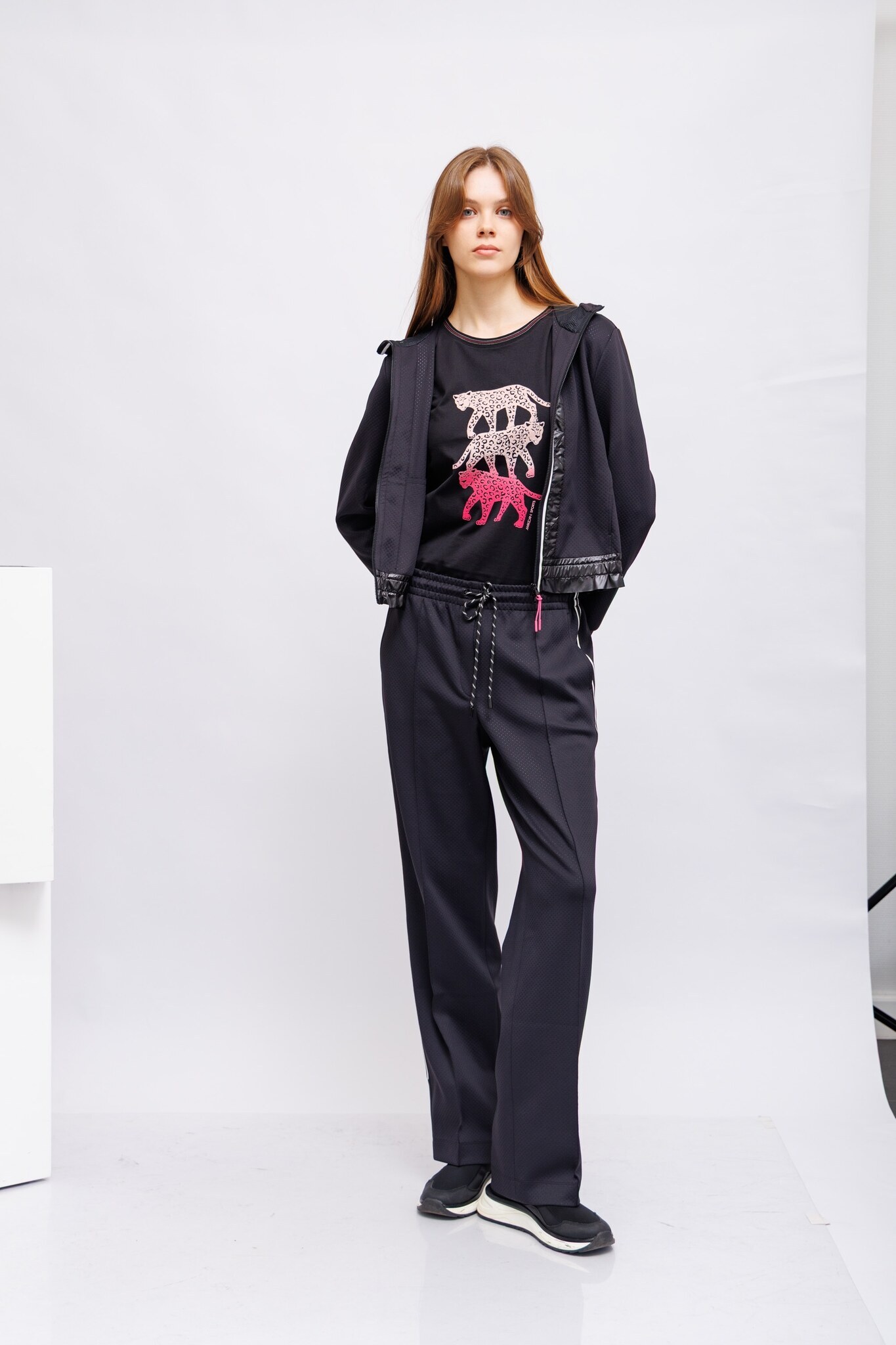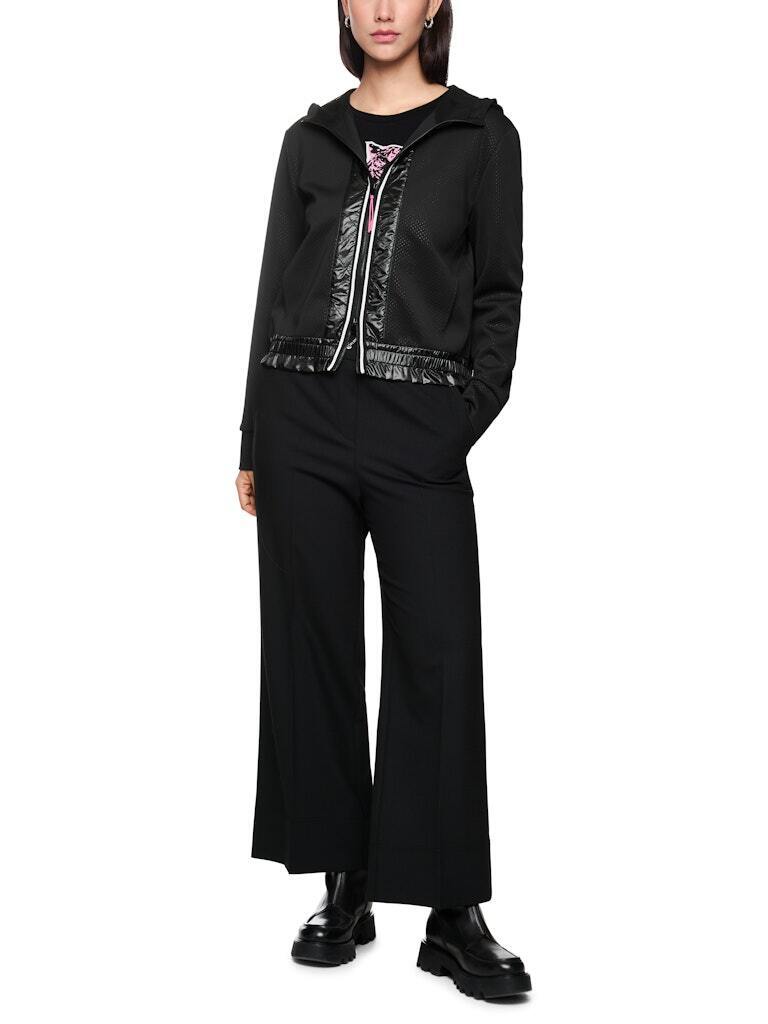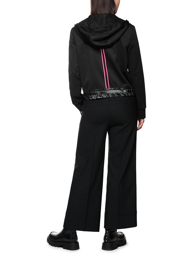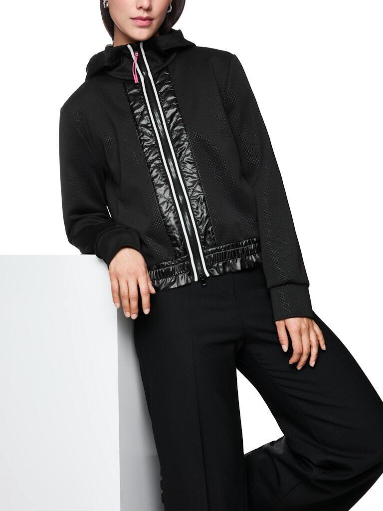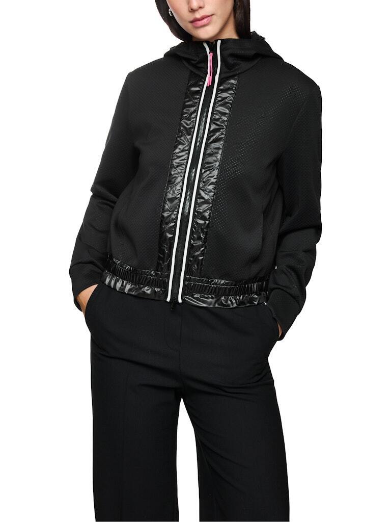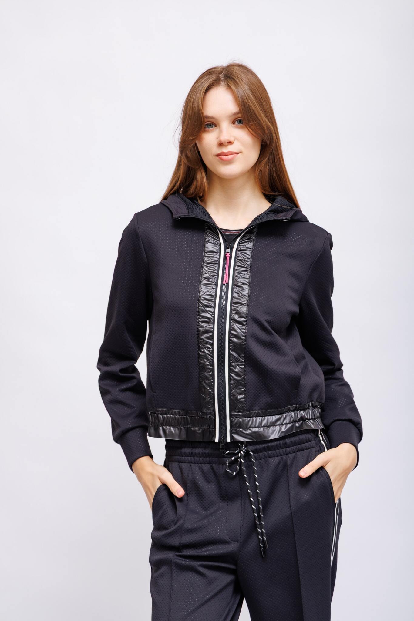 из лёгкого эластичного материала. Эта модель умеренно широкая и в то же время спортивная, с капюшоном на сетчатой подкладке. Контраст: лёгкая оборка на манжетах. Расцветка полосатой детали на передней молнии, которая продолжается на спинке, выглядит стильно. Эта куртка также имеет блестящие стёганые элементы спереди