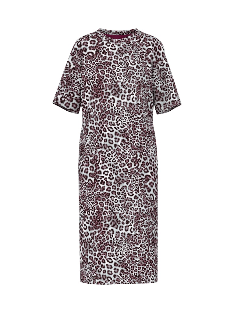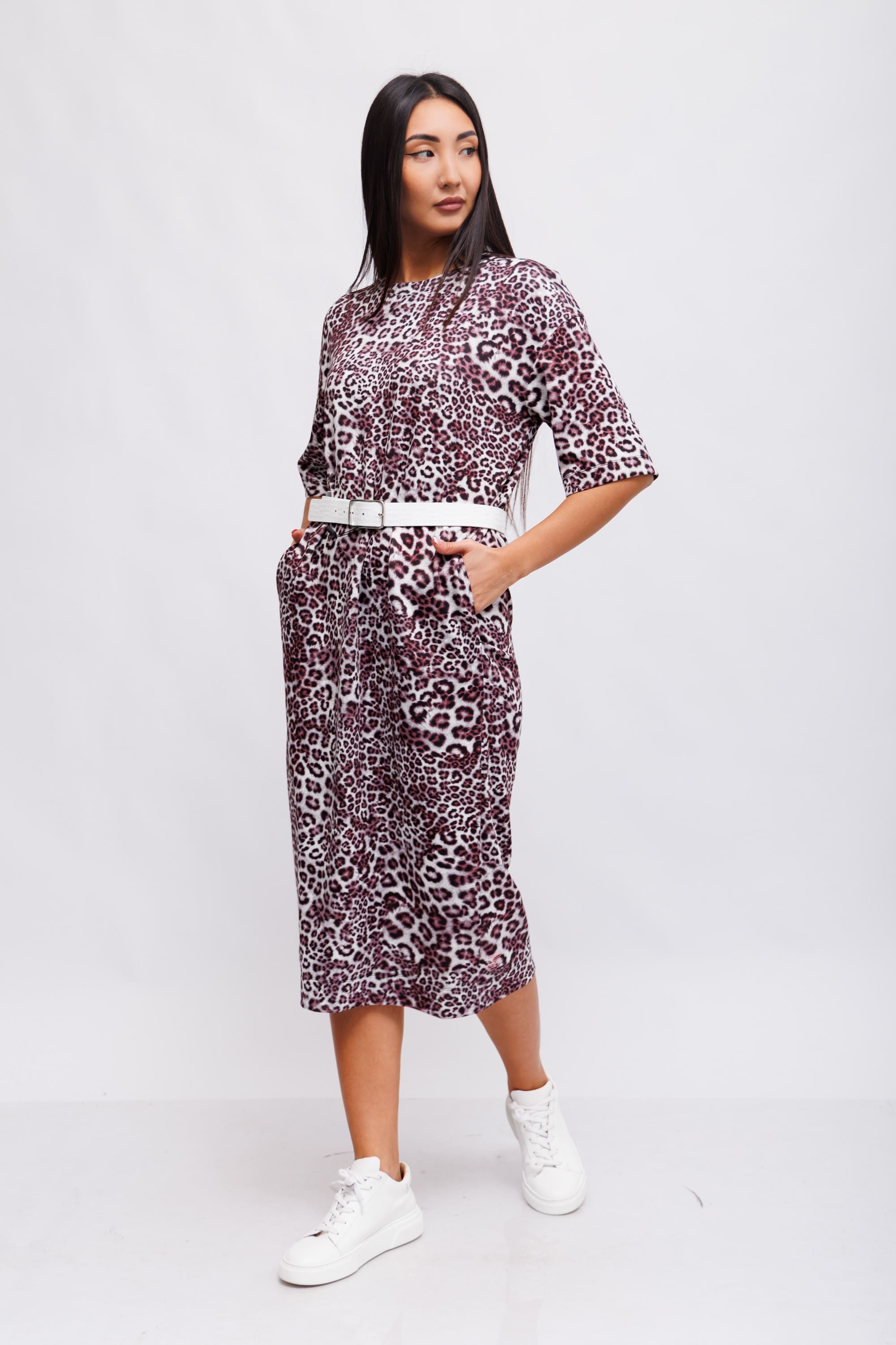 Плечи приспущены, рукава широкие. Платье украшено современным леопардовым принтом с оттенком рододендрона, что делает его по-настоящему привлекательным. Дополнительные детали включают круглый вырез и боковые карманы. Это делает платье элегантным, но в то же время спортивным вариантом для повседневной носки.
