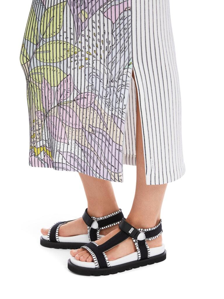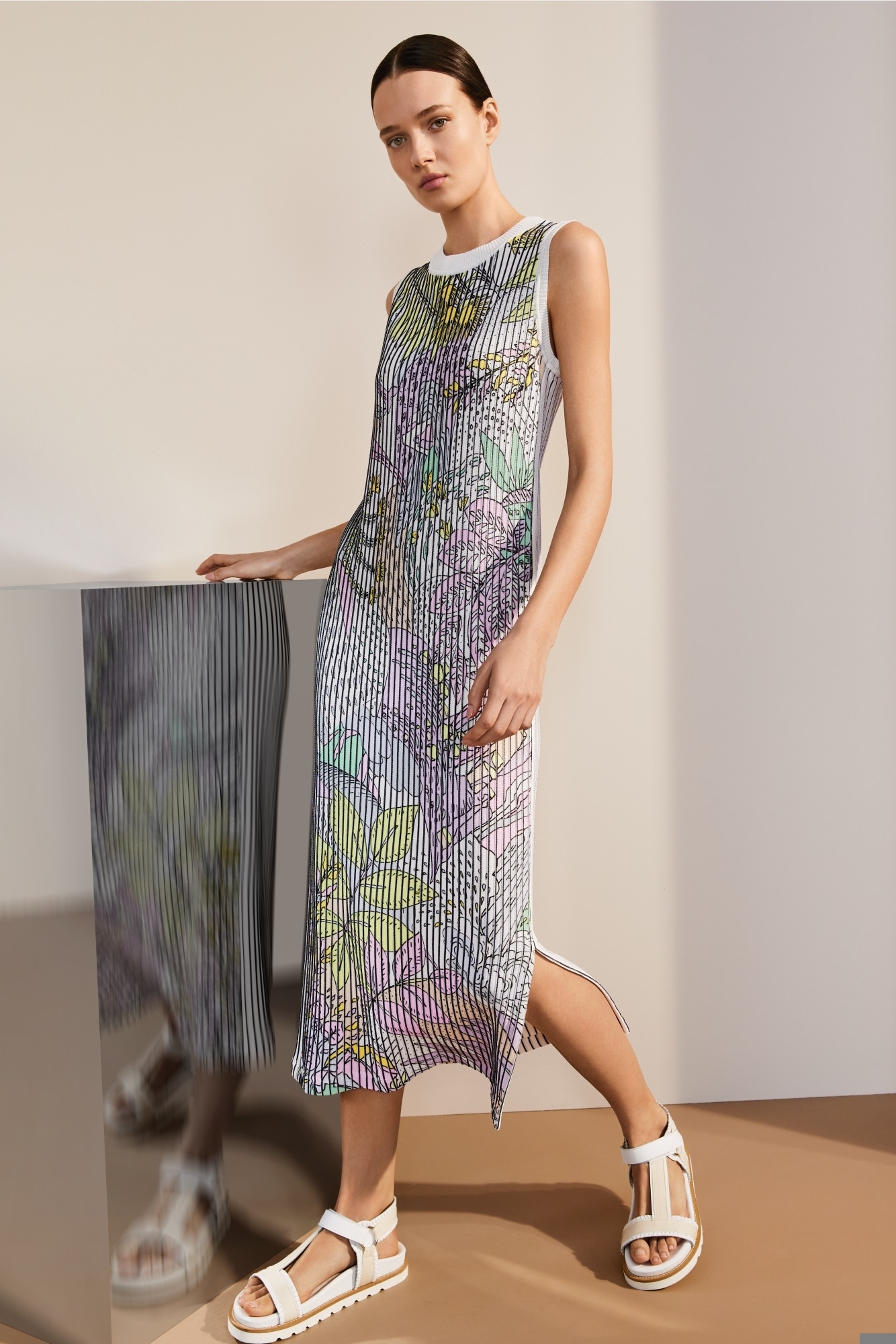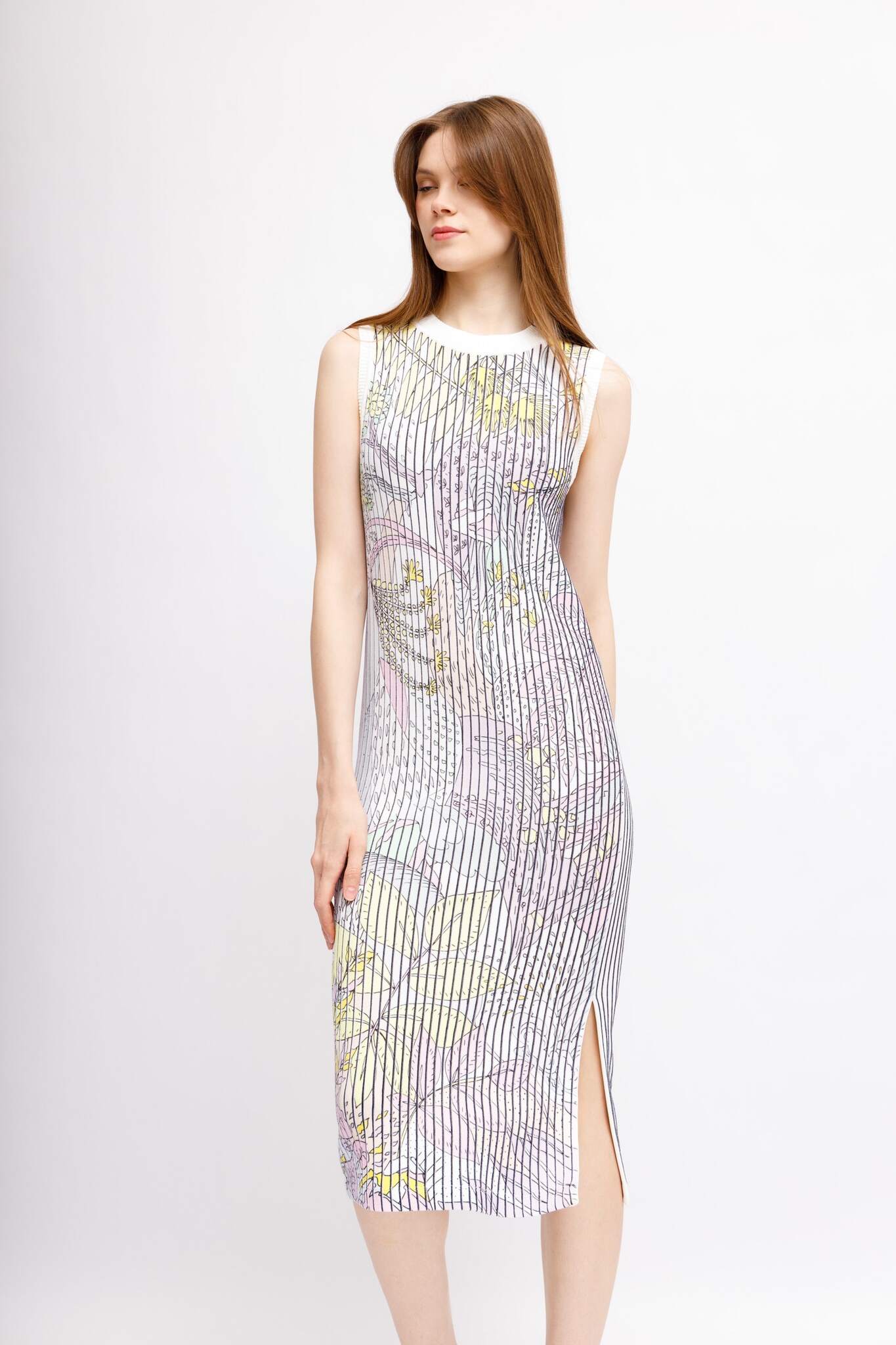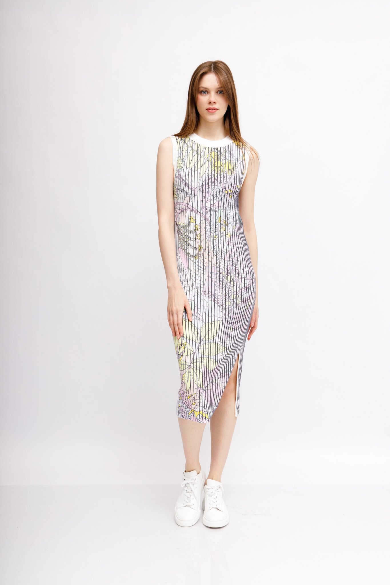 Складки и яркий гавайский узор на передней части этого платья действительно привлекают внимание. Оно без рукавов и длиной до икр. Разрез сбоку обеспечивает свободу движений. Это изделие связано в Германии. Отдельные детали сшиты вместе на европейских предприятиях-партнерах.