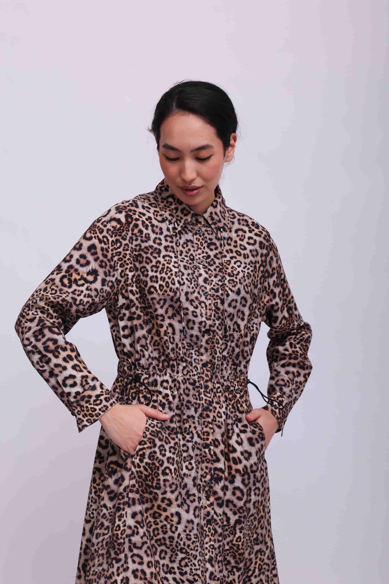 Мягкое струящееся платье-рубашка с леопардовым принтом.