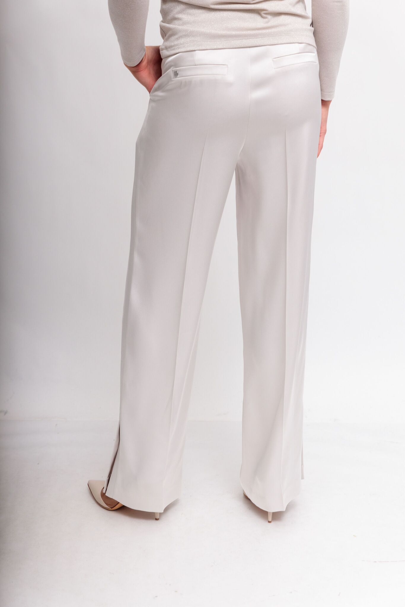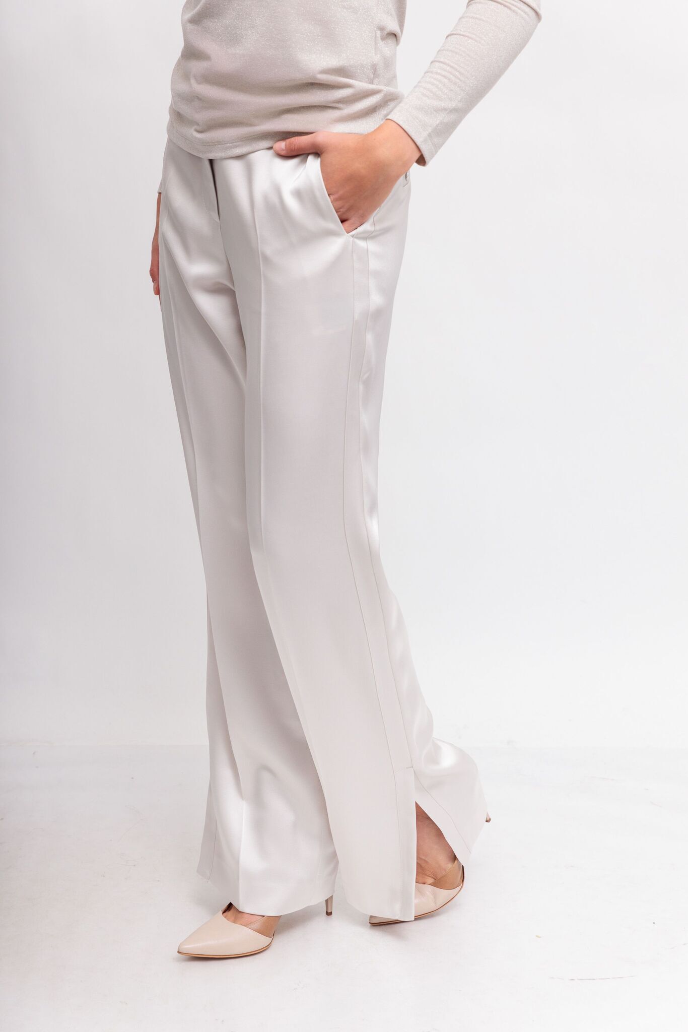 Брюки атласные в дымчато-бежевом цвете из эластичной ткани с матовым блеском