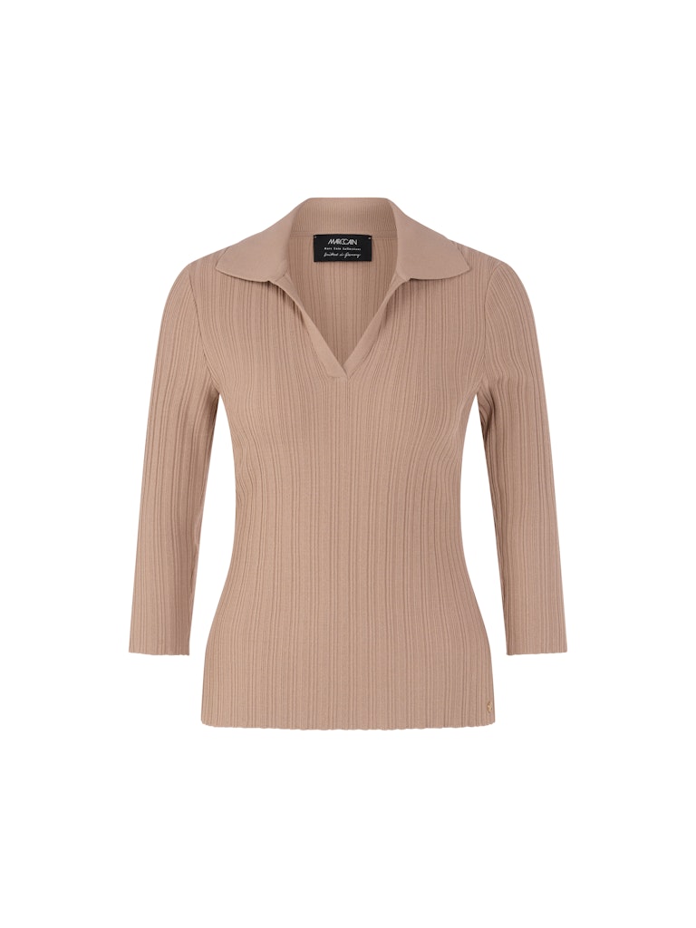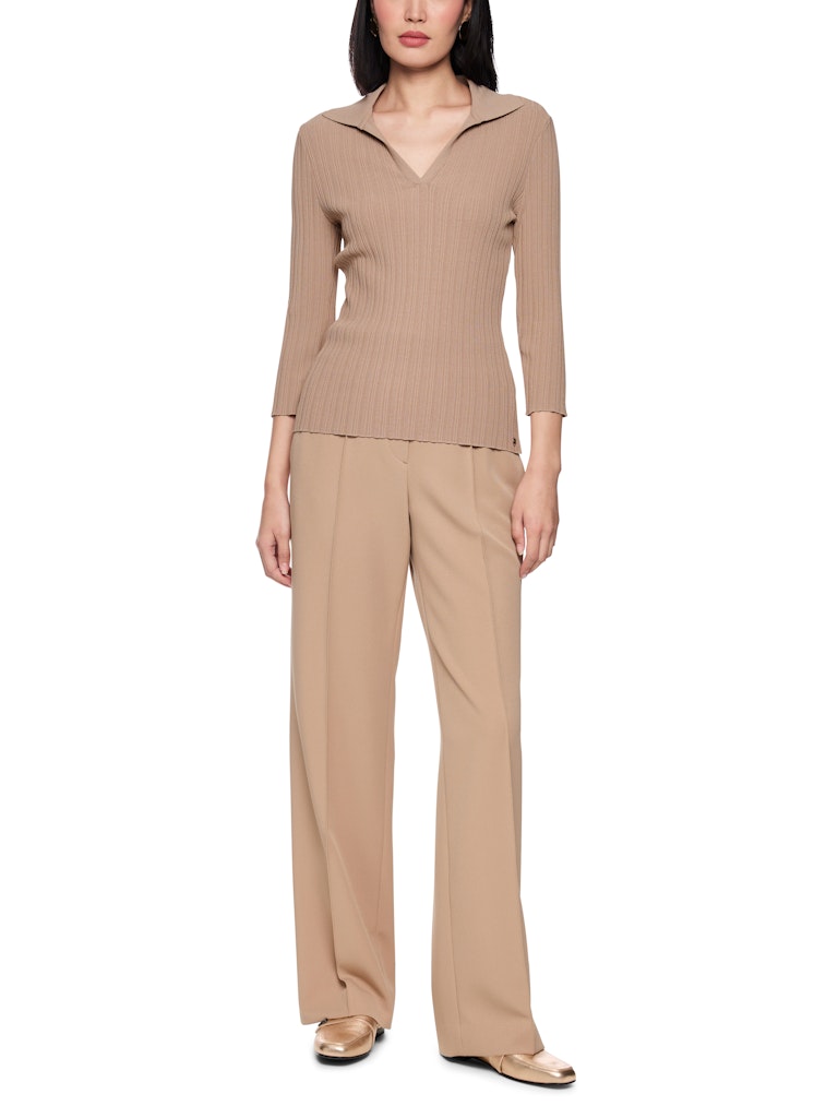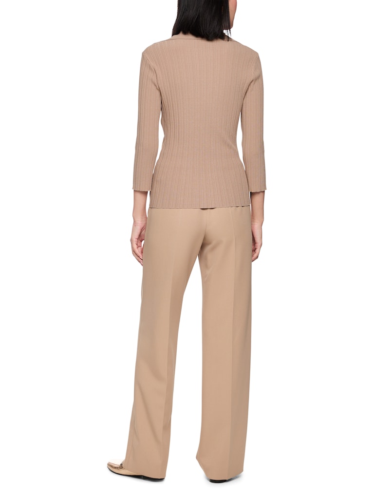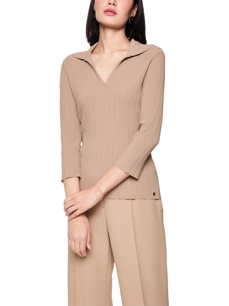 Этот тонкий вязаный джемпер выполнен из вискозной пряжи с неравномерной ребристой вязкой. Рукава 3/4 и особый крой создают современный силуэт. Воротник-поло добавляет элегантности и завершает стильный дизайн. Это изделие «связано в Германии»: пряжа вяжется на современных вязальных машинах, а материалы обрабатываются в Германии. Этот джемпер входит в программу устойчивого развития «Rethink Together».