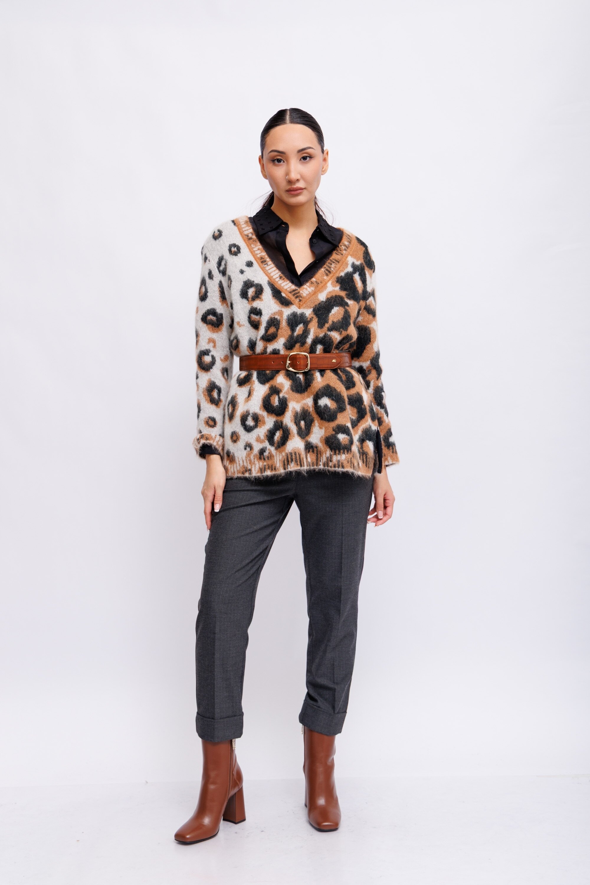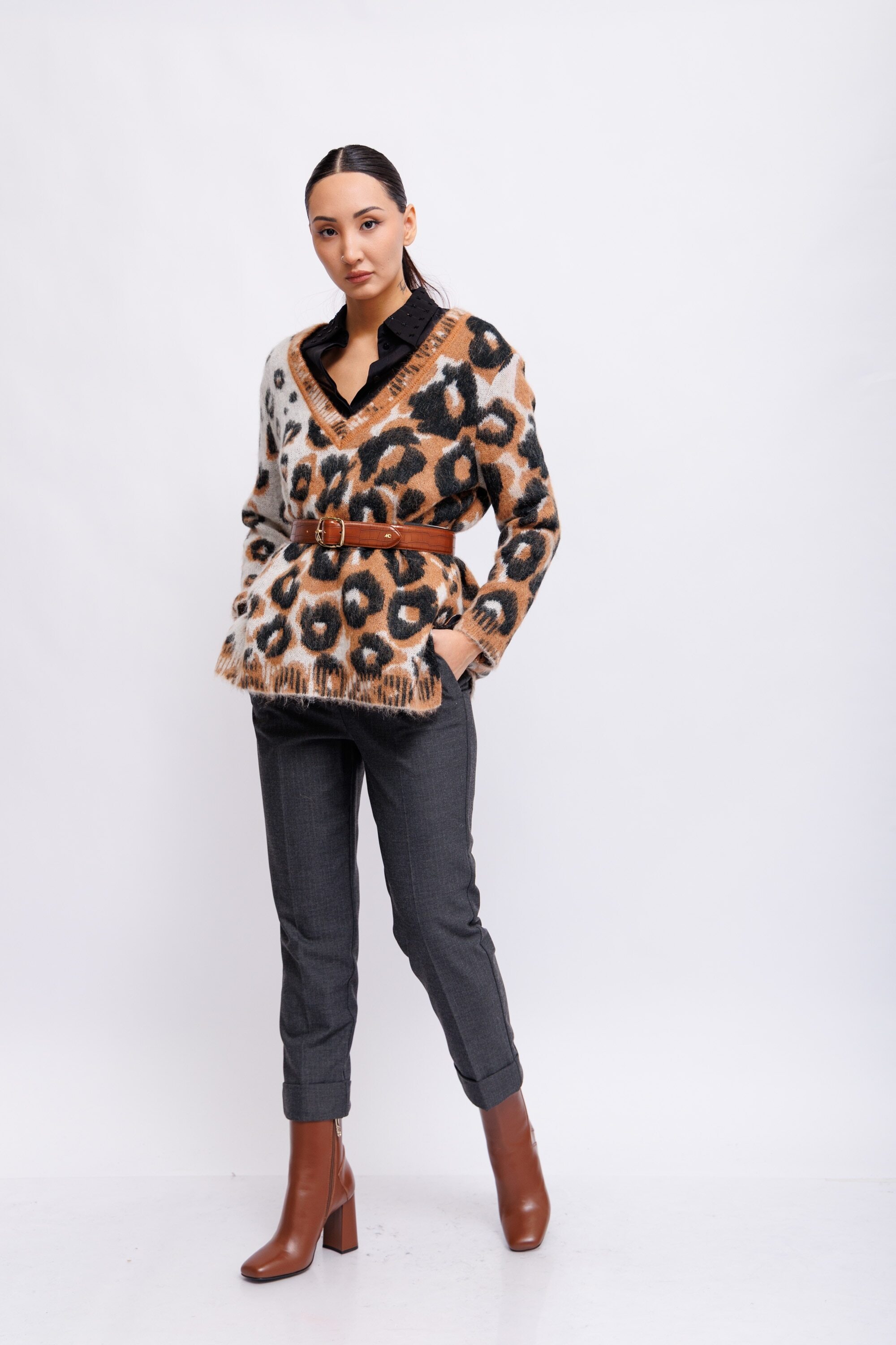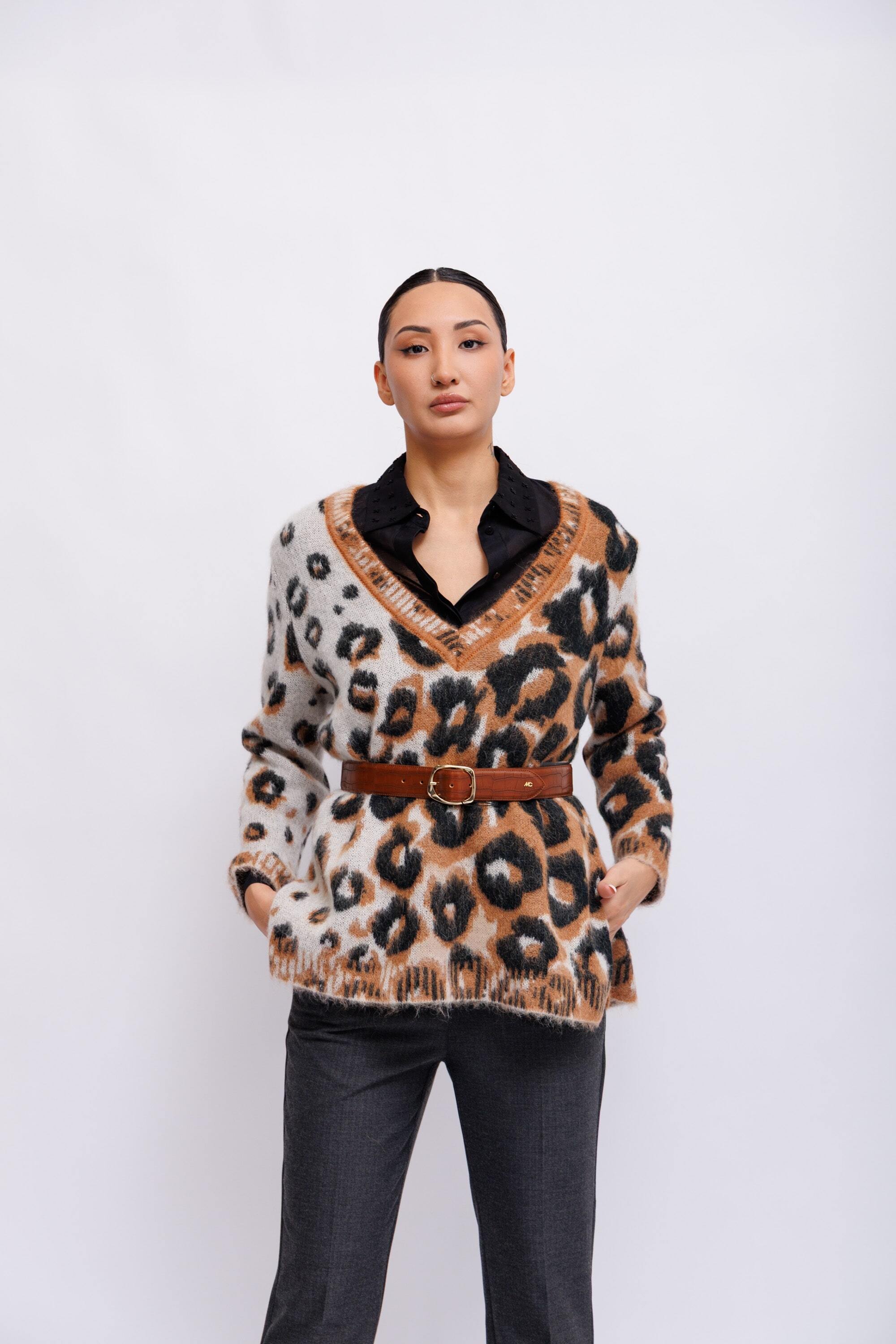 Этот роскошный джемпер с модным леопардовым принтом сочетает в себе стиль и комфорт. Свободный крой и мягкий материал из смеси альпаки и мохера обеспечивают приятные тактильные ощущения. V-образный вырез, фактура ткани и современная цветовая гамма делают его настоящим модным аксессуаром. Джемпер связан и доработан в Германии. Отдельные детали обрабатываются на европейских предприятиях-партнерах. Поэтому он связан в Германии