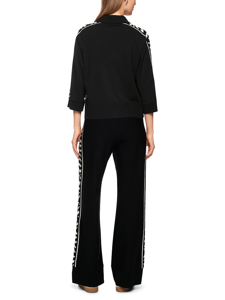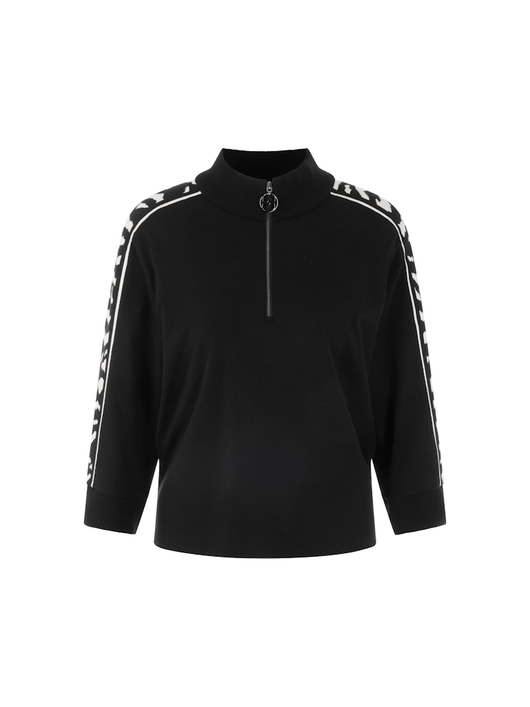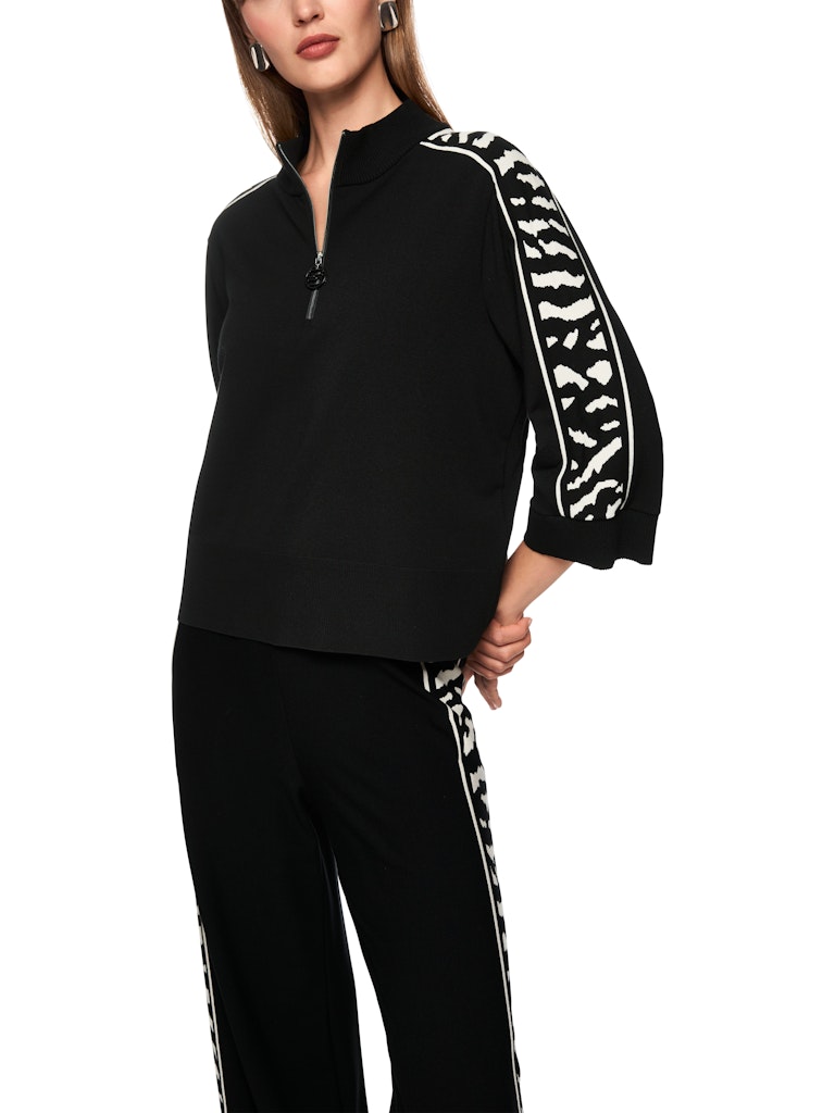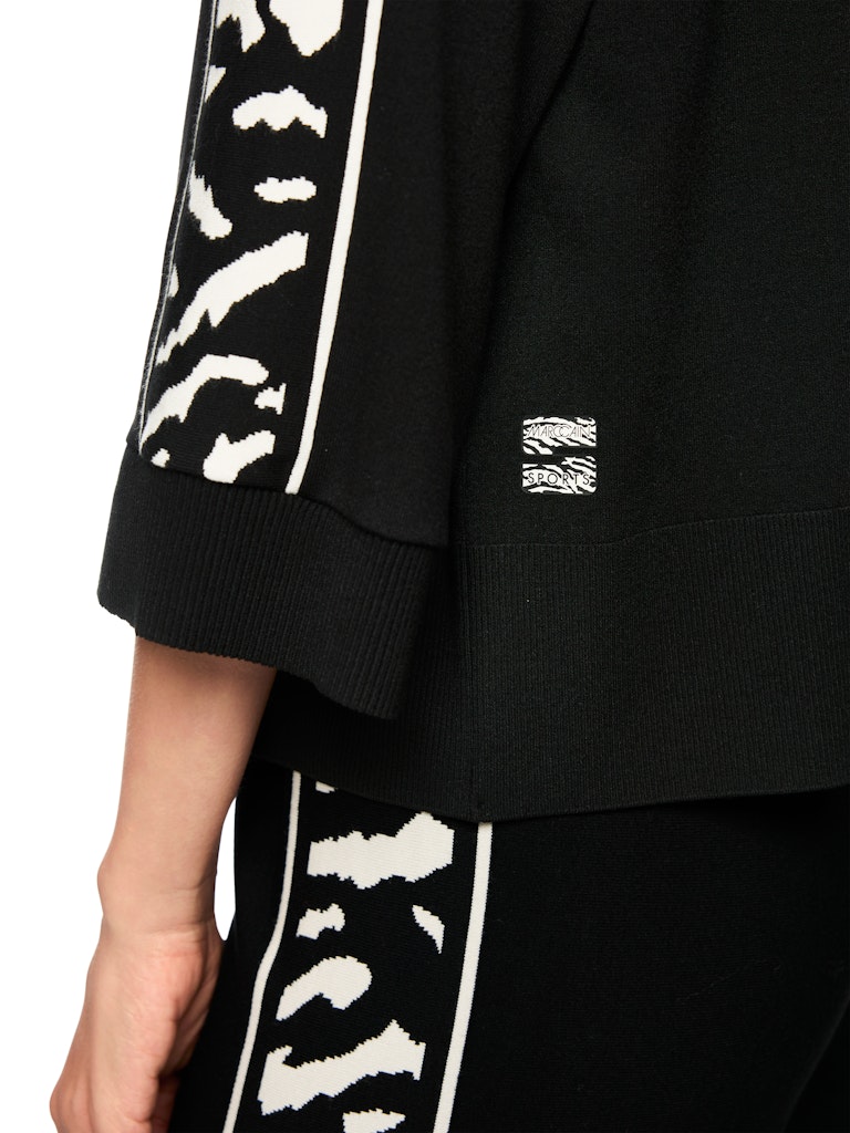 Этот джемпер впечатляет своей свободной формой и широкими рукавами 3/4. Особенностью является широкая контрастная полоса с анималистическим рисунком, украшающая рукав. Воротник и нижний край отделаны широкими ребристыми манжетами, а спереди на шее расположена молния, позволяющая носить джемпер расстегнутым. Изделие изготовлено с соблюдением принципов устойчивого развития и имеет маркировку «Rethink Together».
