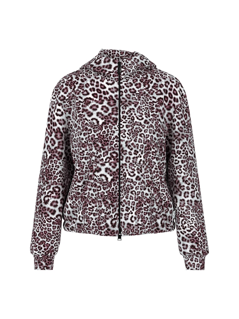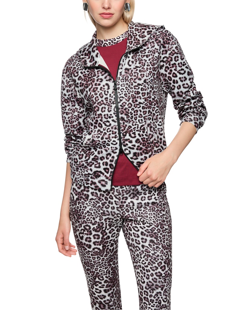 Свободная трикотажная куртка из комфортной, мягкой ткани. Эта куртка имеет свободный крой и слегка укороченную длину. Леопардовый принт по всей поверхности делает ее по-настоящему привлекательной. Другие детали включают эластичные манжеты, практичный капюшон и боковые карманы. Куртка застегивается на молнию. Куртка без подкладки.