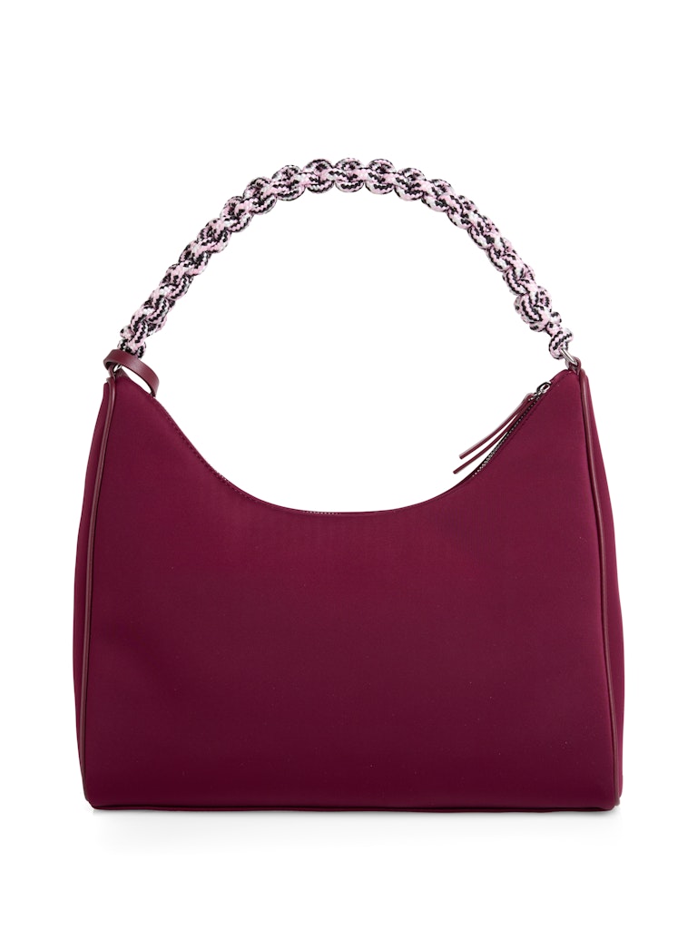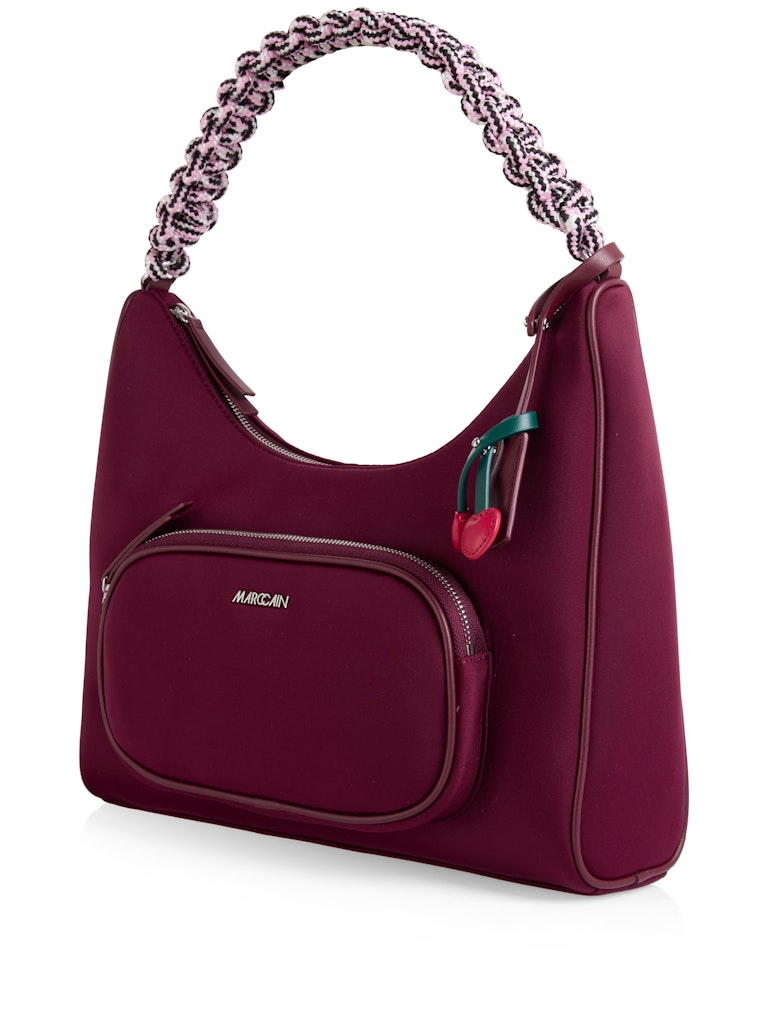Неопреновая сумка через плечо в современном стиле хобо. Эта сумка имеет накладной карман, застежки-молнии и плетеную ручку. Еще одна деталь — модный кулон в виде вишни, который действительно привлекает внимание. Стильный аксессуар на каждый день.