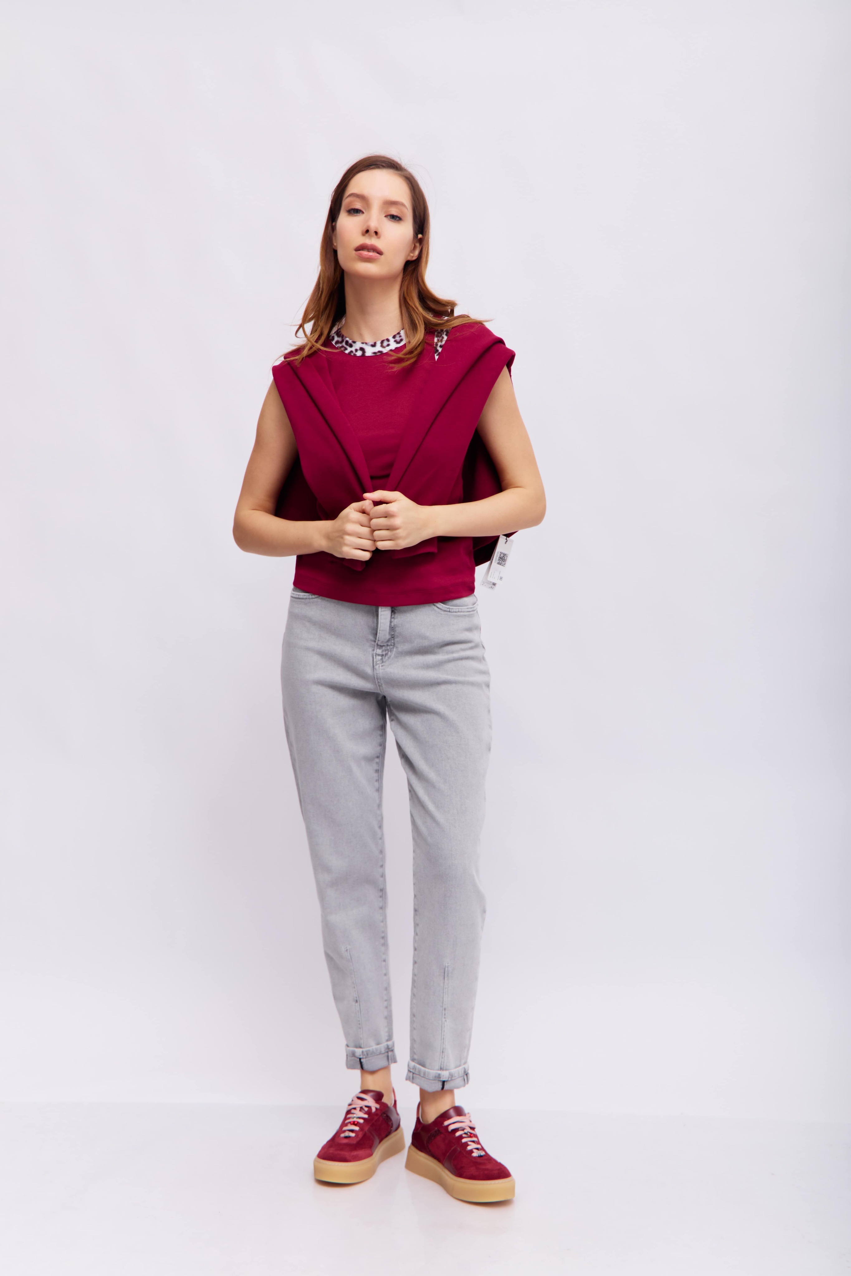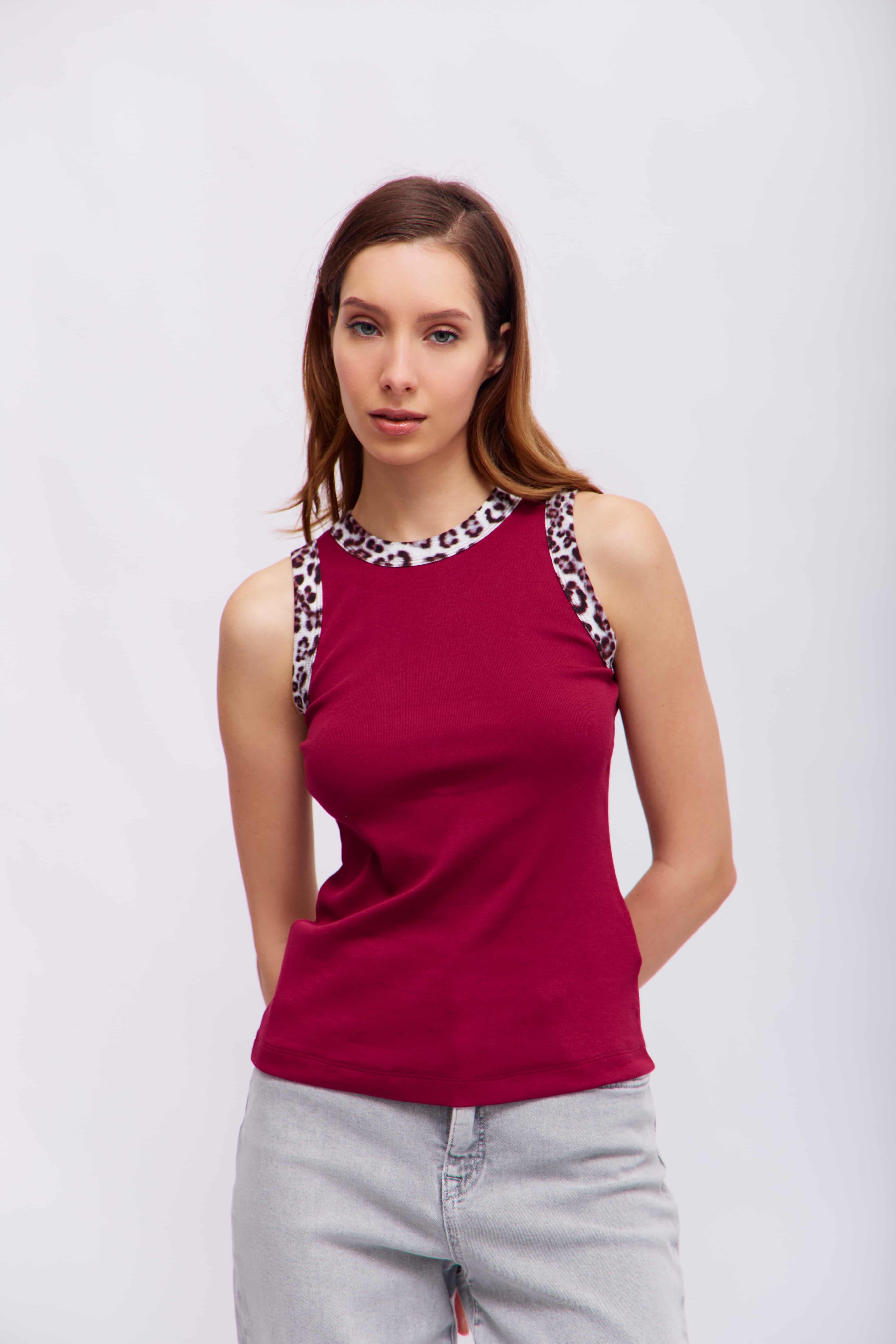 Цвет рододендрона. Топ без рукавов выполнен из мягкой и эластичной хлопковой трикотажной ткани. Он имеет облегающий крой и эффектную леопардовую отделку по вырезу горловины и проймам. Это делает его идеальной базовой вещью, которая добавит изюминку вашему образу.