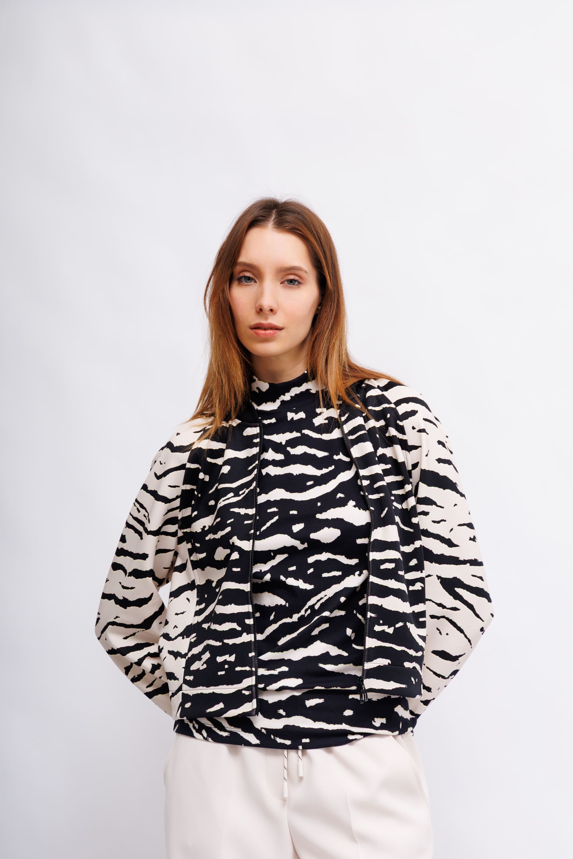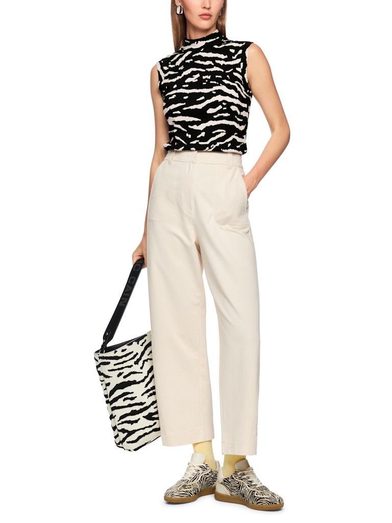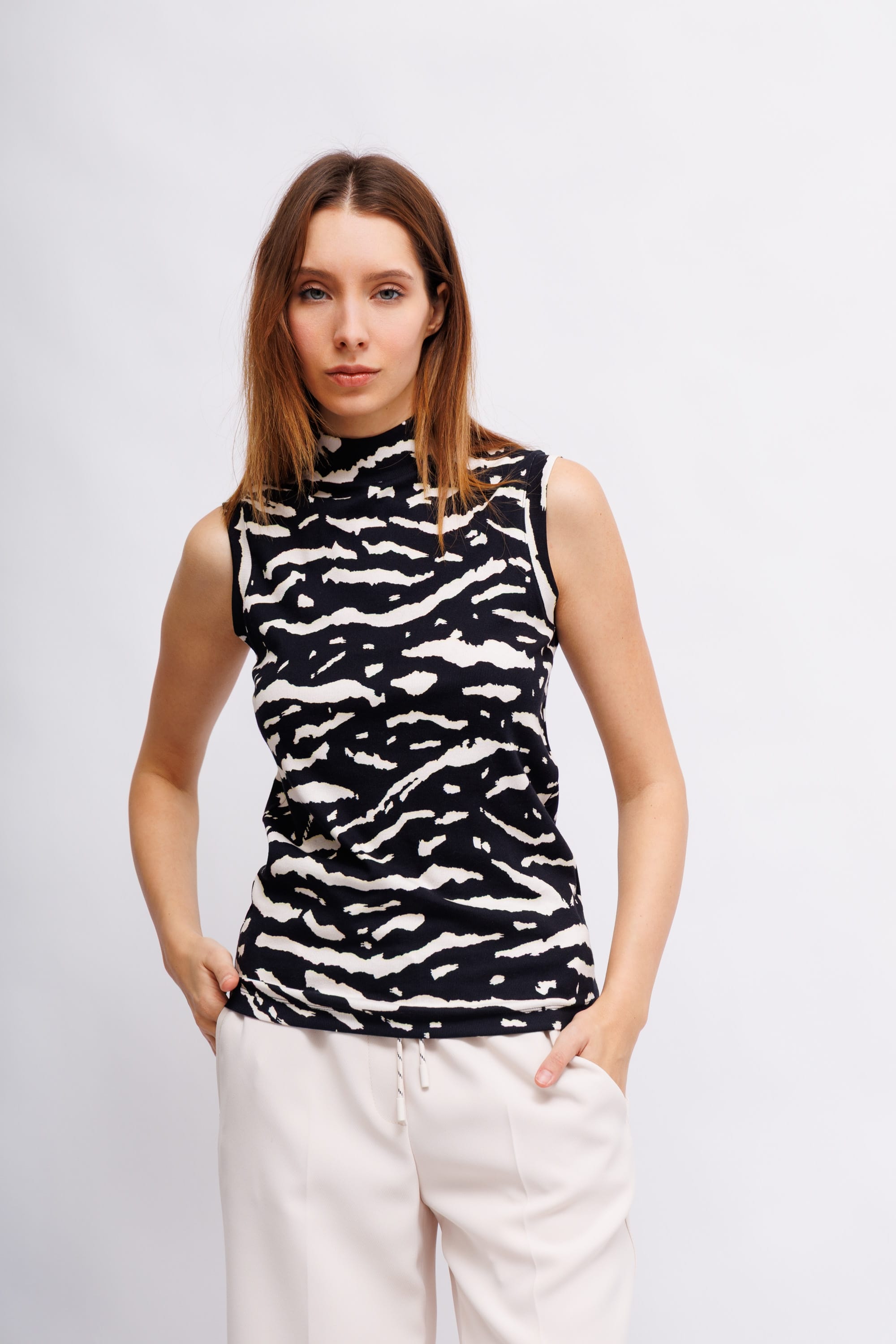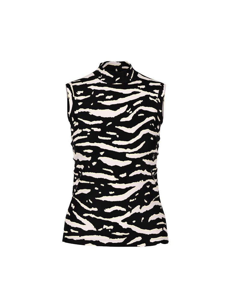 Этот топ без рукавов впечатляет своим облегающим силуэтом и модным анималистическим принтом. Он имеет небольшой воротник-стойку и тонкую ребристую вязку. Мягкий материал, смешанный с хлопком, приятен на ощупь. Идеальная базовая рубашка, которая дополнит любой образ.