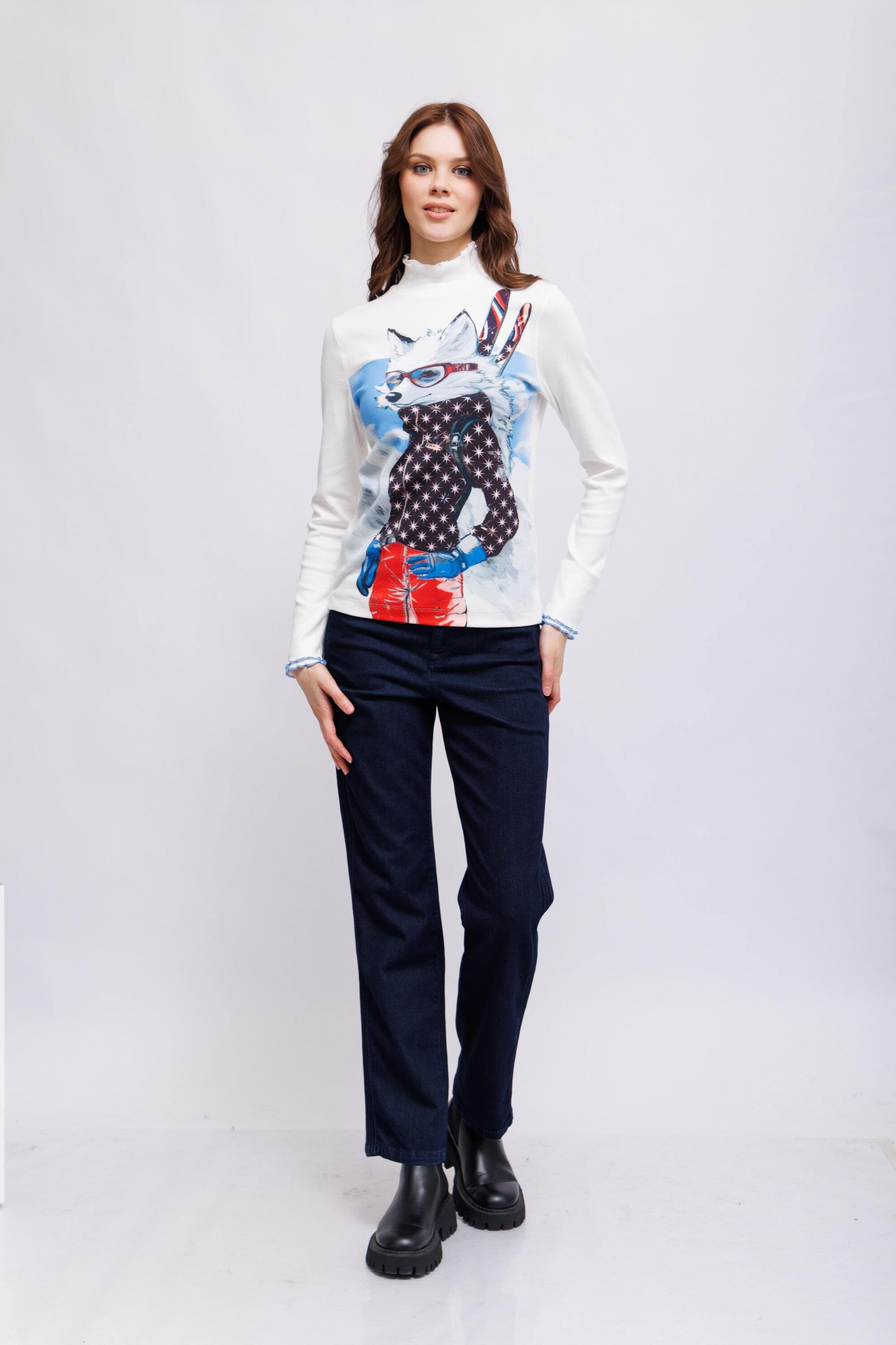 Приталенная модель с длинными рукавами из тонкого рубчатого материала. Спереди – эффектный принт с изображением песца, а подвернутый край на рукавах и горловине добавляет изящных деталей. Изготовлена из мягкой смеси хлопка и эластана для оптимального комфорта и идеальной посадки