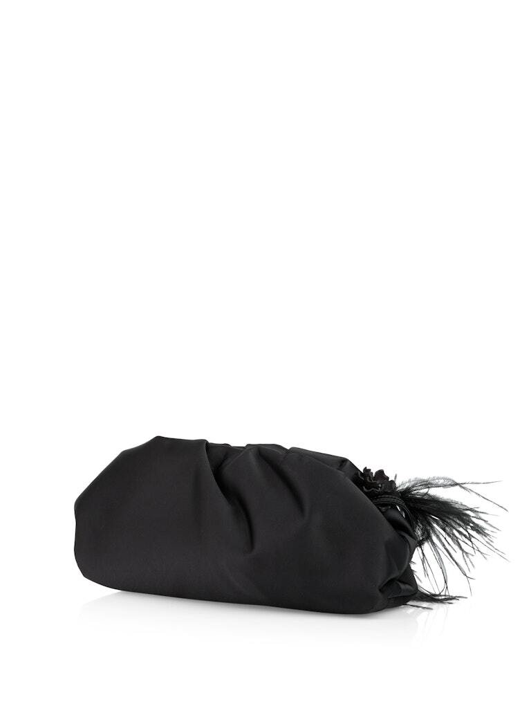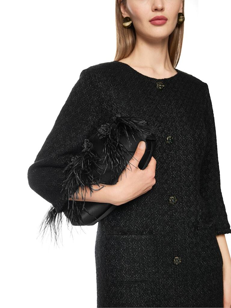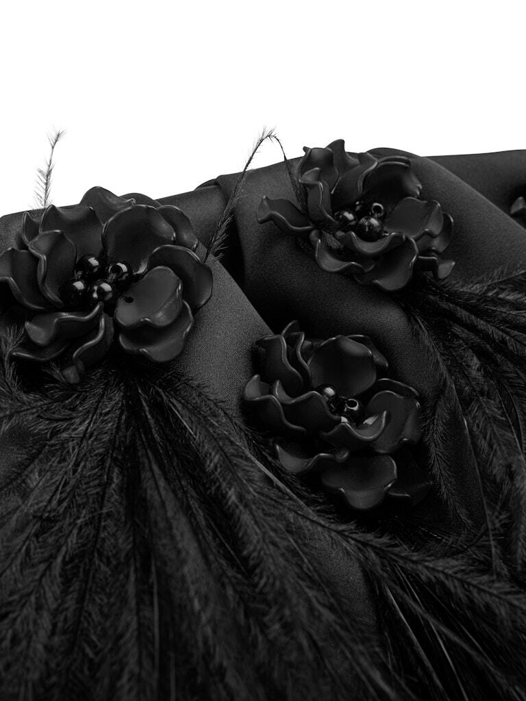 Элегантный клатч. Изящная трапециевидная форма придает этому клатчу особый шарм. Он украшен перьями и изысканными цветочными деталями. Мерцающая ткань добавляет сумке еще больше гламура. При необходимости можно использовать плечевой ремень.