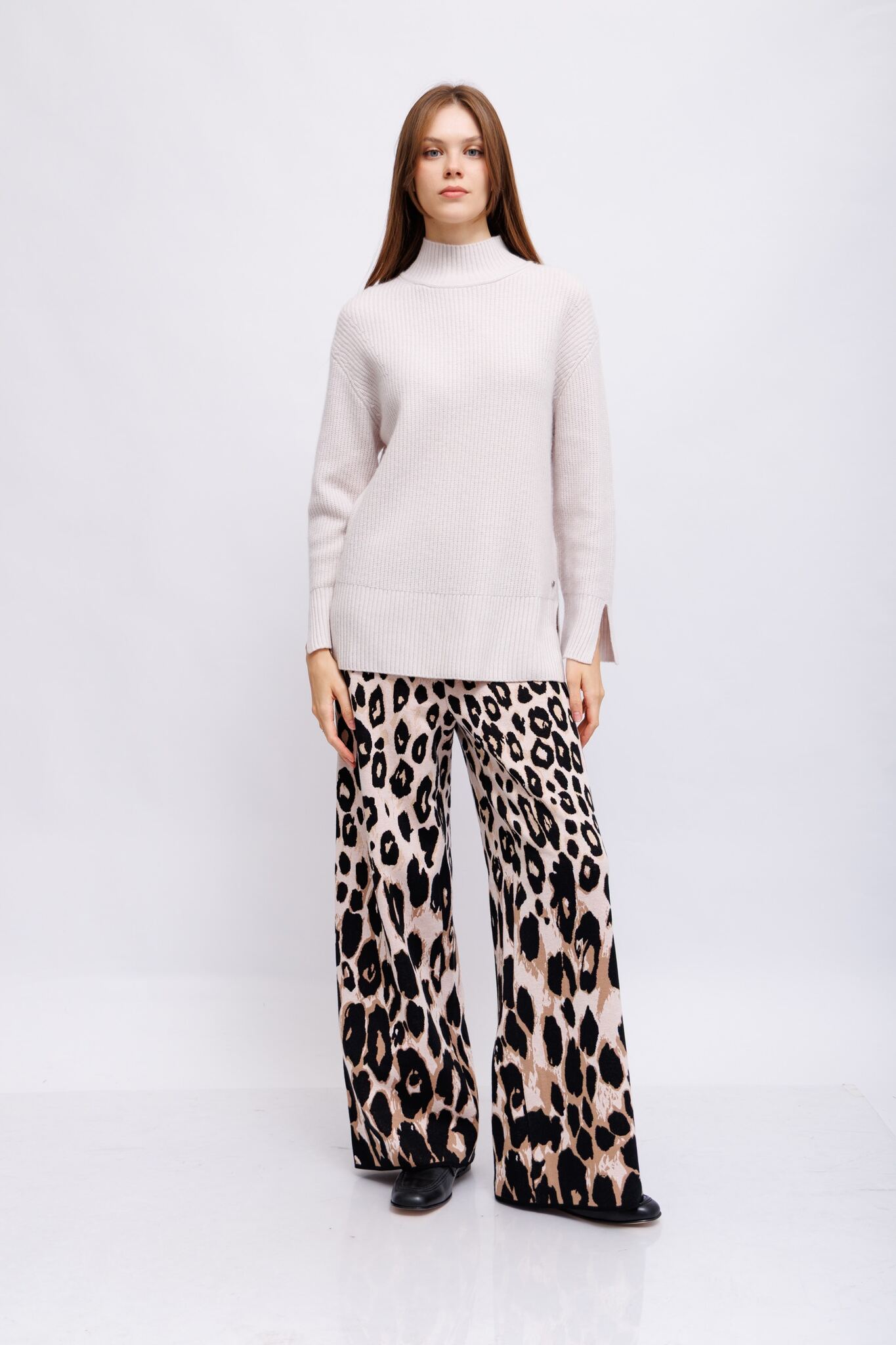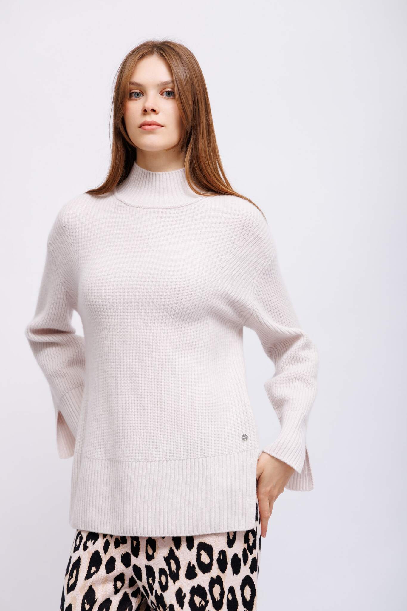 Дымчато-бежевый цвет. Этот предмет одежды умеренно широкий и имеет спущенную линию плеч. Другие детали включают высокий ворот и боковые разрезы