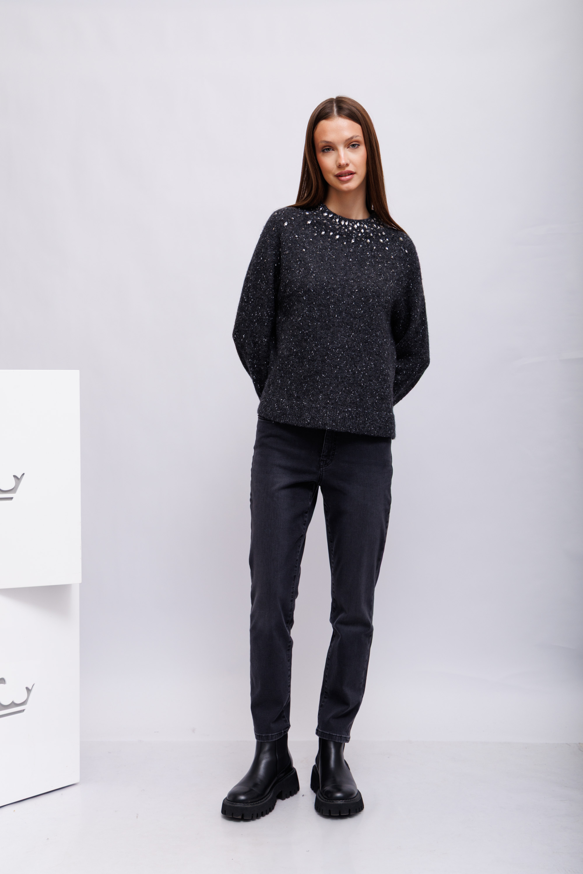 серого цвета с блестящими стразами и изысканными деталями из люрекса. Воротник-стойка добавляет современный и элегантный штрих. Идеально подходит для особых случаев или стильных повседневных образов с изюминкой.