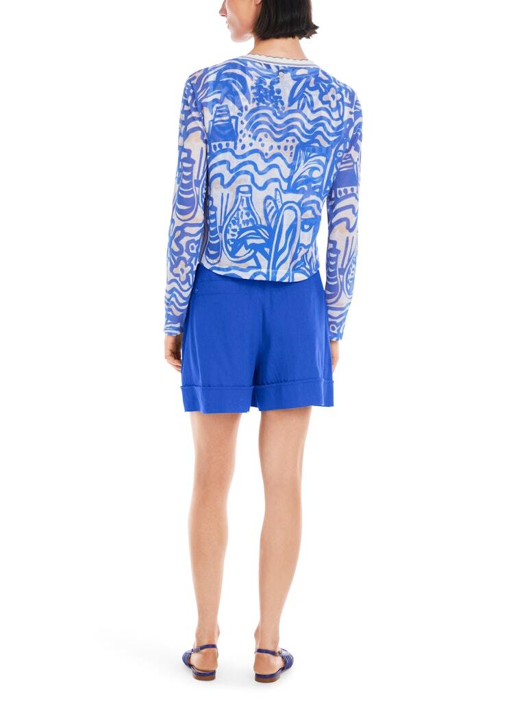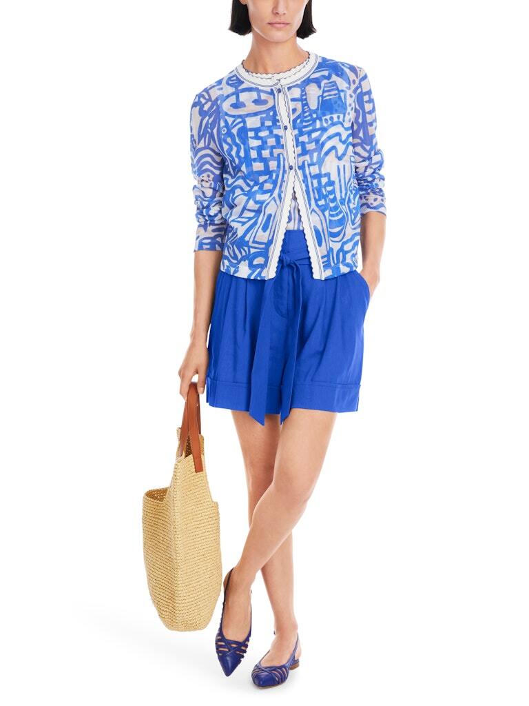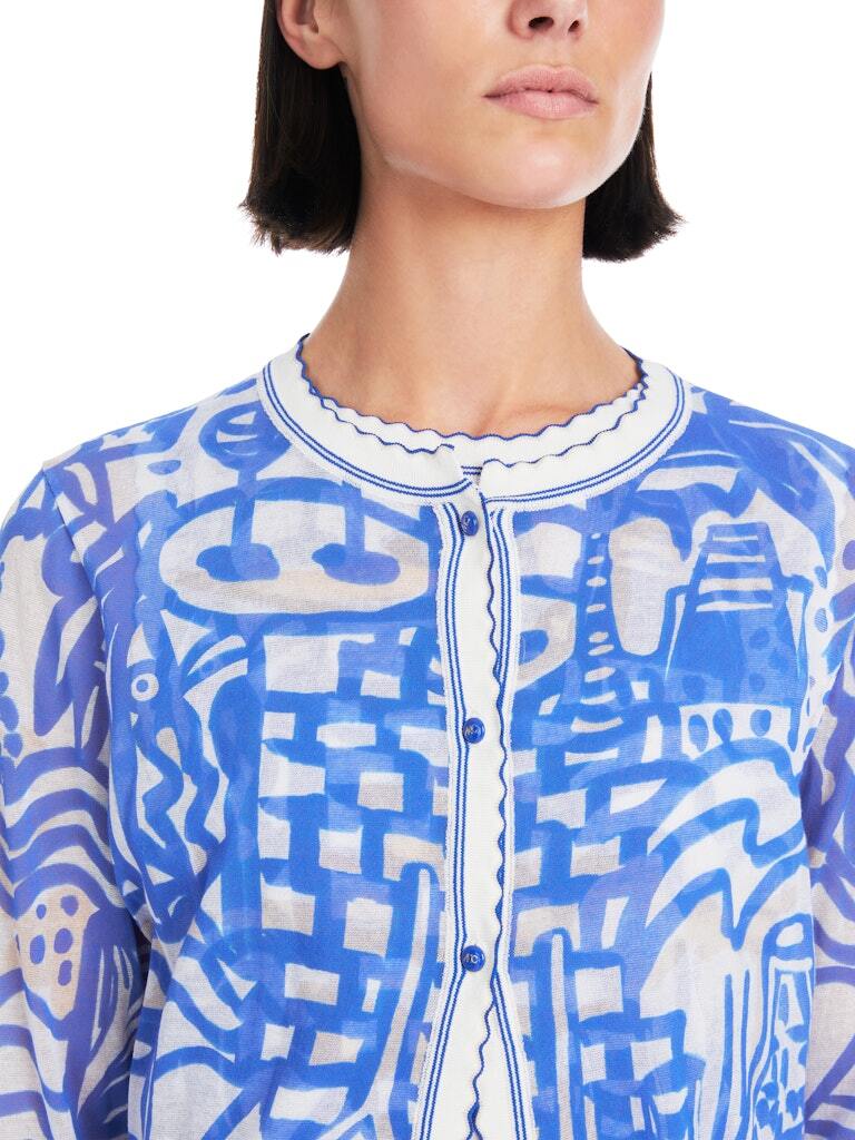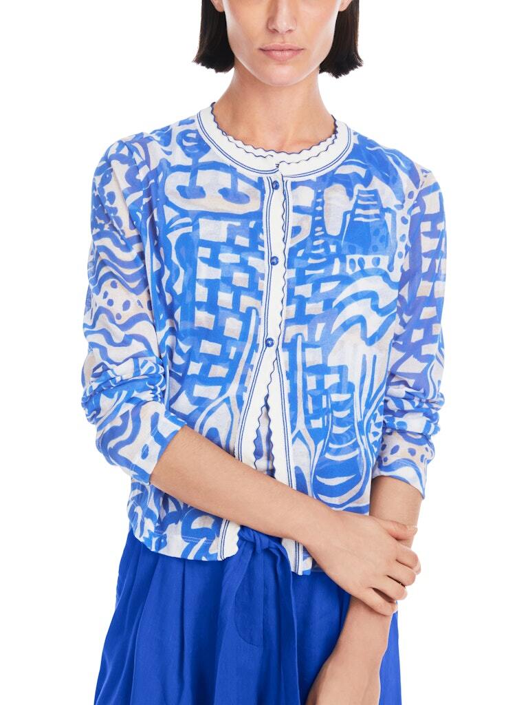 Тонкий летний кардиган с рисунком цвета горечавки Gentiana из коллекции Trip to France. Образ дополняют оборчатые трикотажные края-фестоны. Этот кардиган имеет свободный силуэт, застежку на пуговицы по всей длине и круглую горловину. Он связан из легкой хлопковой смеси и закончен в Германии. Дальнейшая обработка отдельных деталей происходит на европейских предприятиях-партнерах. Таким образом, это изделие связано в Германии.