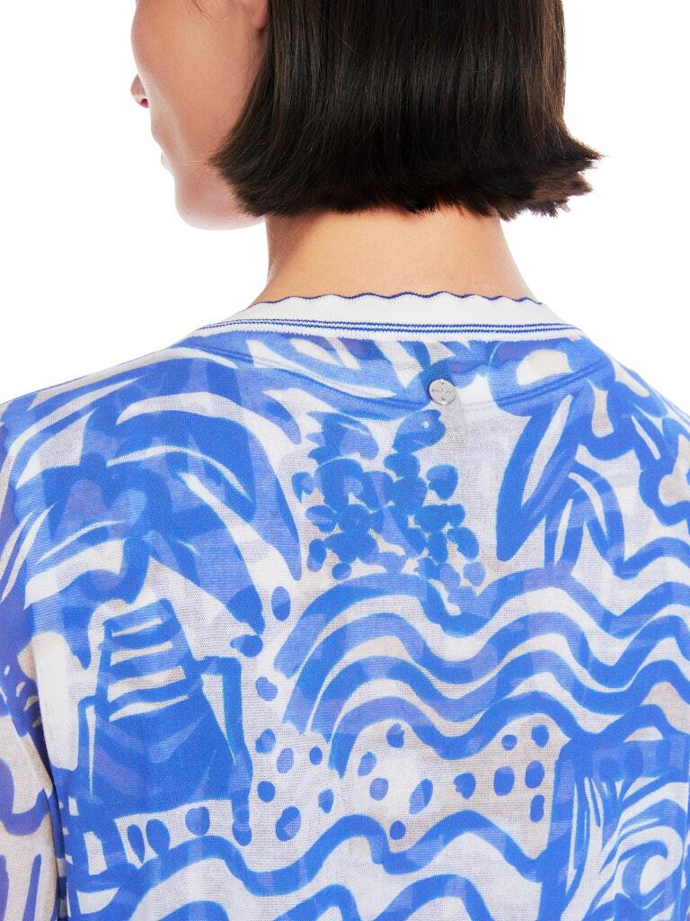 На этом топе изображен принт «Поездка во Францию» с мотивами творчества Пикассо. Оборки из трикотажной ткани — игривое дополнение. Топ имеет полуоблегающий силуэт и разрезы по бокам. Изготовленный из легкой хлопковой смеси, этот предмет одежды связан в Германии: пряжа связана на современных вязальных машинах, а ткани отделаны в Германии. Отдельные детали, такие как рукава, передняя часть и т. д., сшиты вместе на европейских партнерских предприятиях.