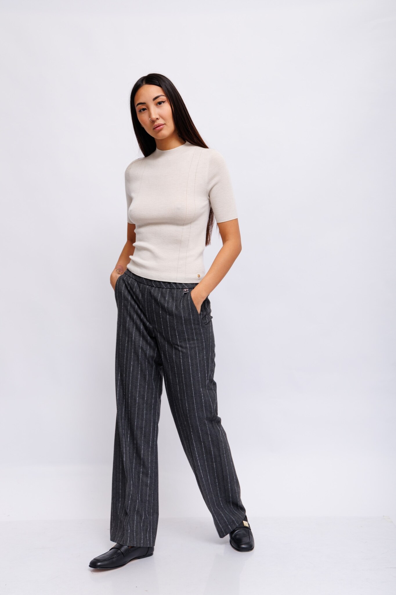 Этот трикотаж с мерцающей люрексовой нитью станет идеальным базовым вариантом. Облегающего кроя со слегка стоячим воротником, очень удобно в носке. Короткие рукава подчеркивают элегантный стиль.