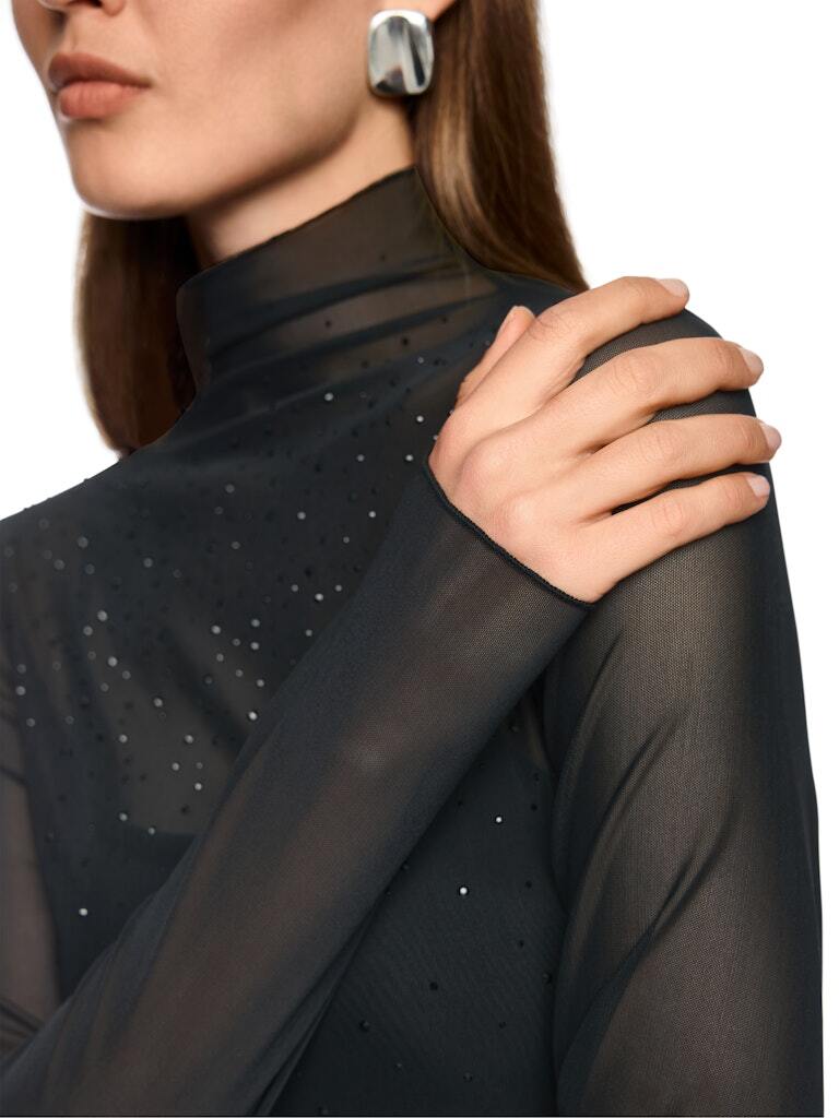 с длинными рукавами из эластичной сетки, облегающий по фигуре и украшенный сверкающими стразами. Элегантный воротник-стойка стильно дополняет образ. Идеально подходит для вечеринок или особых случаев.