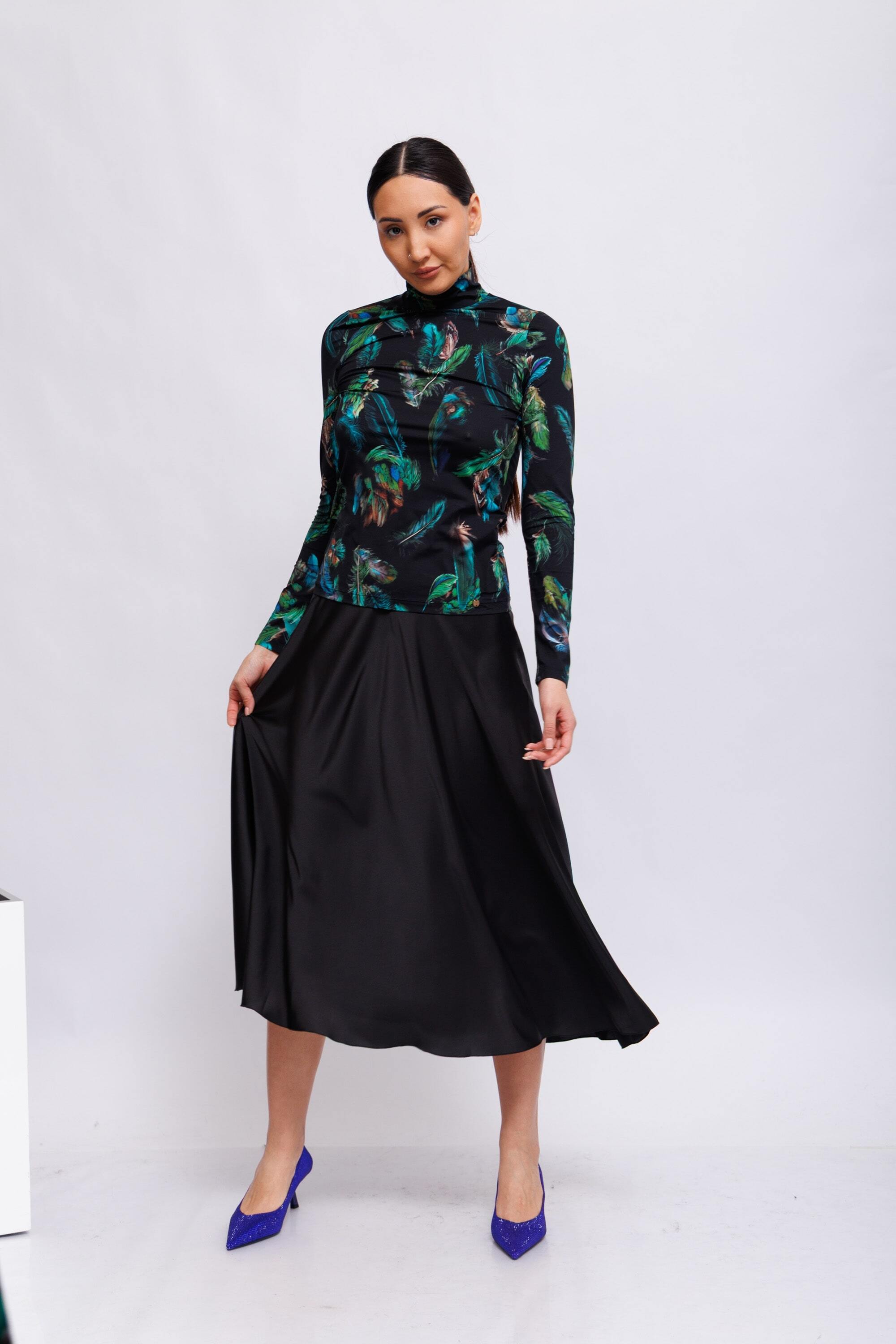 Приталенная, лёгкая рубашка из эластичного материала с длинными рукавами и высоким воротником-стойкой. Загадочный принт с перьями придаёт образу особую ауру. Также идеально подходит в качестве нижнего белья под джемпер или кардиган.